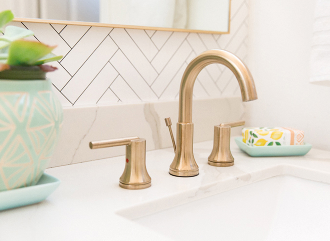 She decided to go with champagne brass sink faucets and a brass sputnik light.