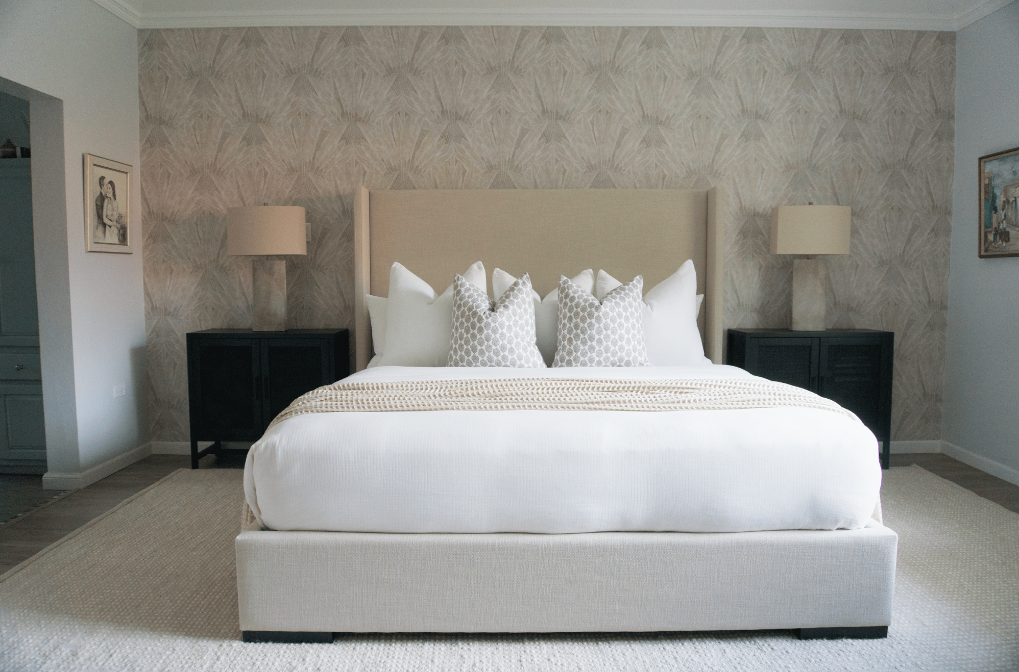 The Kingston 6 Townhouse Bedroom Makeover is a project styled by Karina Matalon for her design firm Casa Tropikana. Her client wanted a refresh of the master bedroom in their residential townhouse. The goal was to create a relaxing space with storage solutions to keep unsightly items like baby toys, diaper caddies and other items for their toddler and newborn out of sight, while still being accessible. The result is a modern, neutral, and very stylish Caribbean master bedroom.