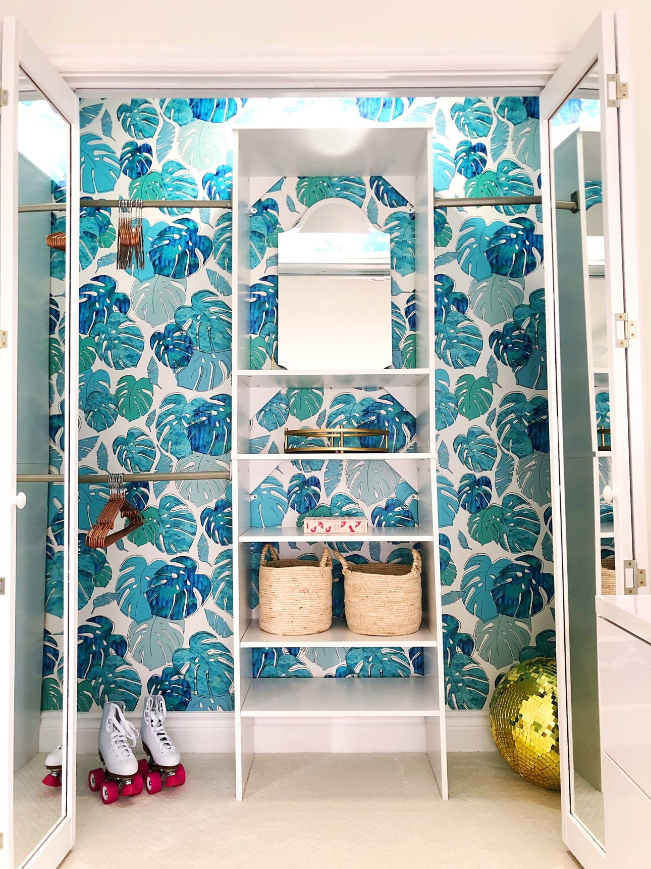 Likewise, when Kelly from Kelly Go Lightly was designing a tween room for her niece, she mentions: “I am SO glad we ended up wallpapering the closet! Doesn’t it make SUCH a difference? The wallpaper is Tropicale by Poppytalk for Milton and King. It adds so much depth to the room.” Her whole project was a mastery of appropriate teen decor.