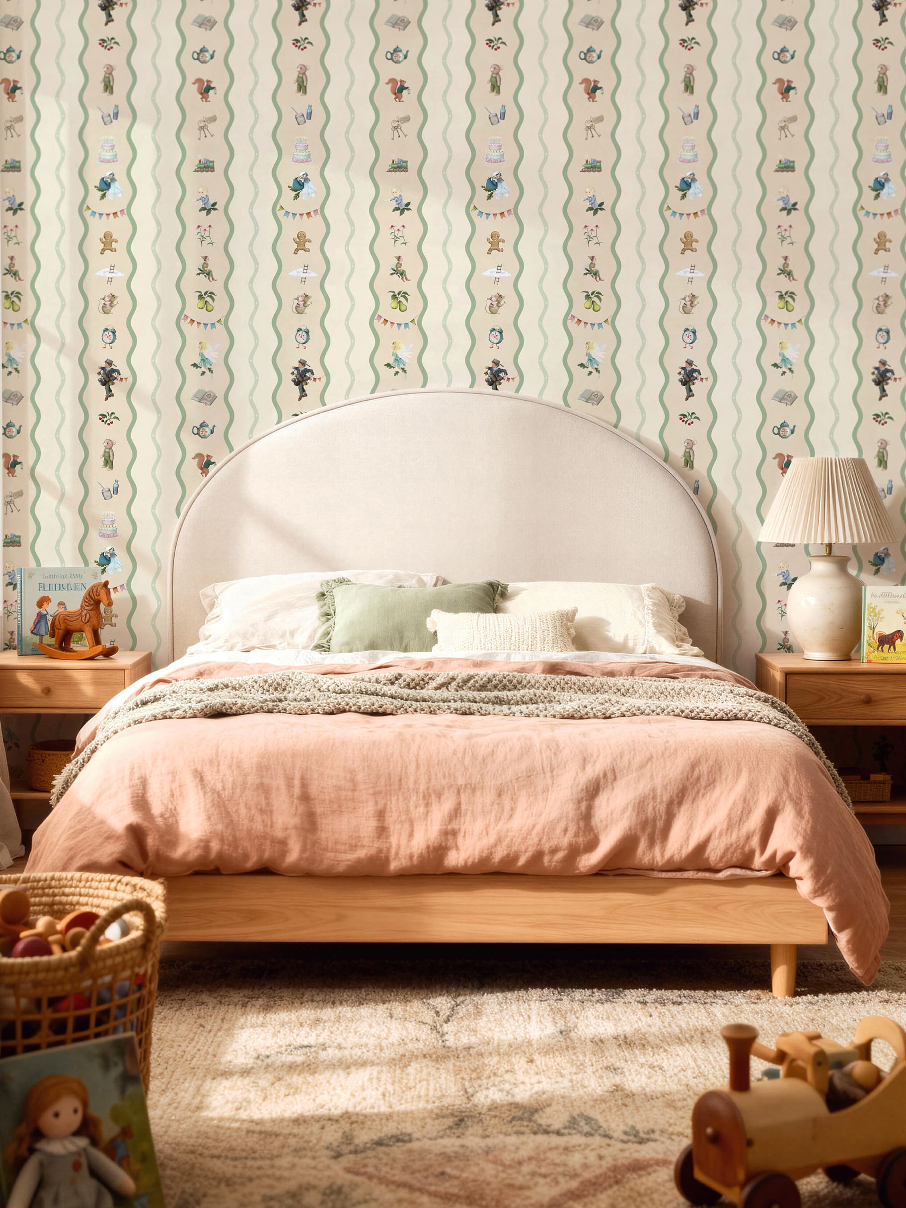 Bringing these iconic tales to life, each design is filled with whimsical characters, charming details and enchanted landscapes, illustrated in Fleur Harris’s signature storybook style. From richly detailed hero prints to charming conversational patterns and playful coordinating designs, the collection invites curiosity, wonder and imagination into every space.