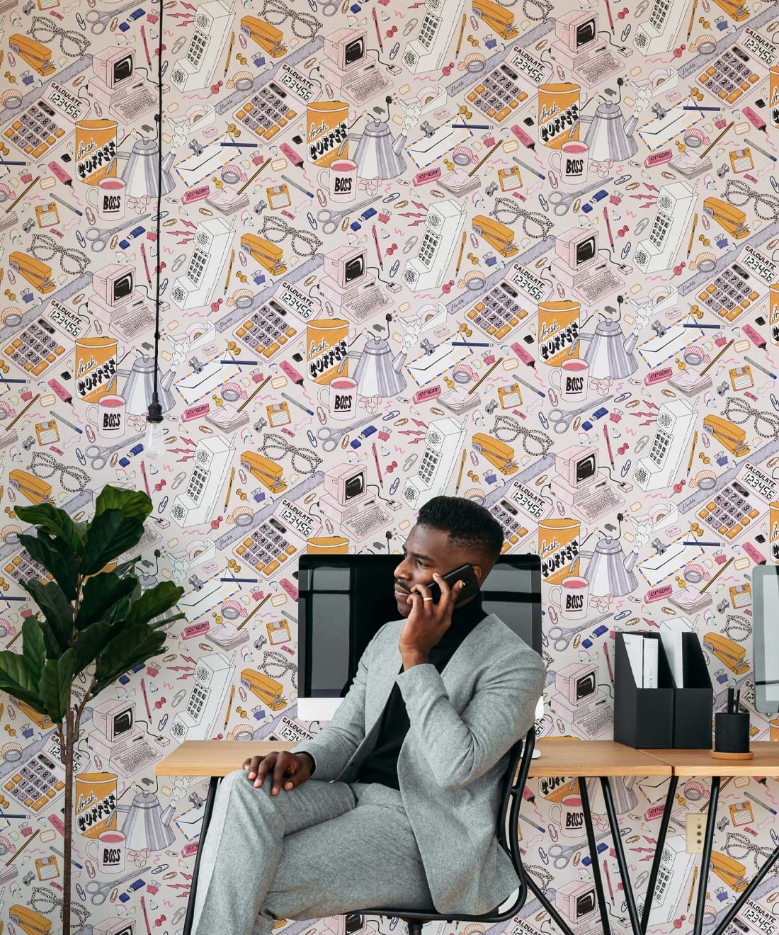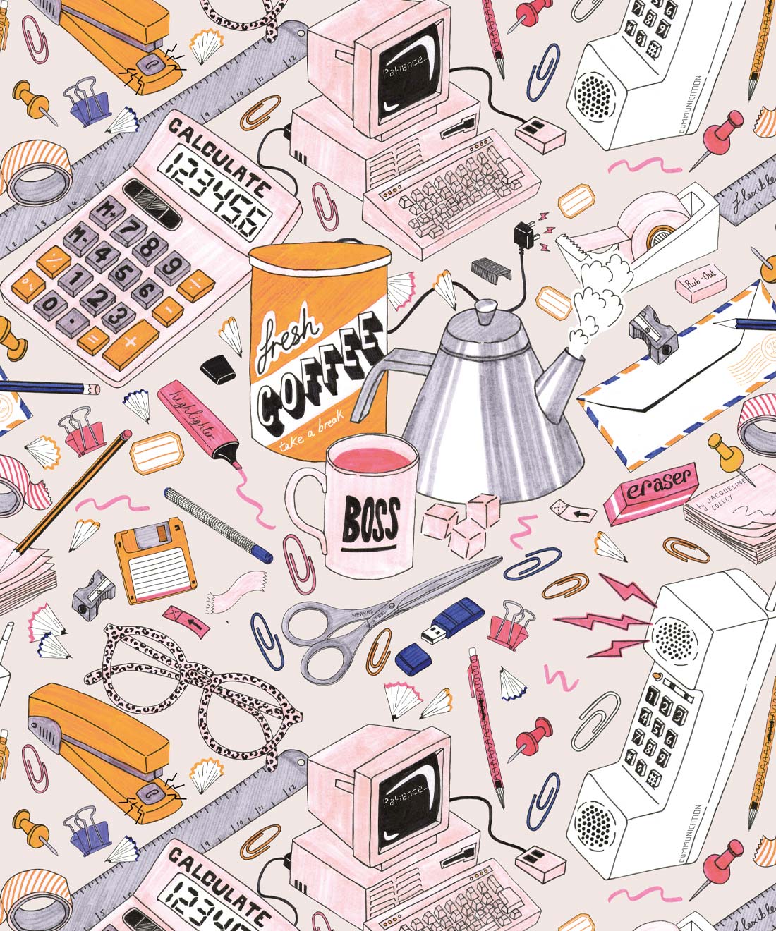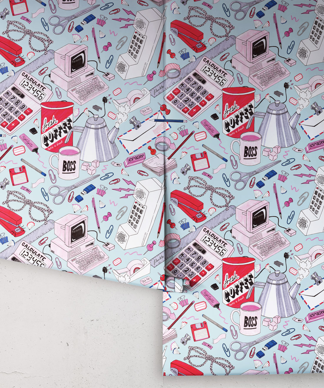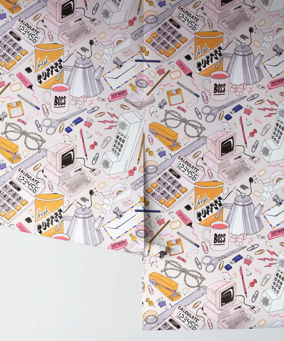 1980’s Office Wallpaper is a fun, retro wallpaper design illustrated by Jacqueline Colley. With a light blue and pink color palette, it features a scattered desktop filled with office supplies: a stapler, a phone, paper clips, a ruler, a floppy disk, a calculator and highlighter. These are just some of the stationary items that make up this funky wallpaper design that harkens back to the 80’s style. It is perfect for an office, a commercial space or a teenage girl’s bedroom.