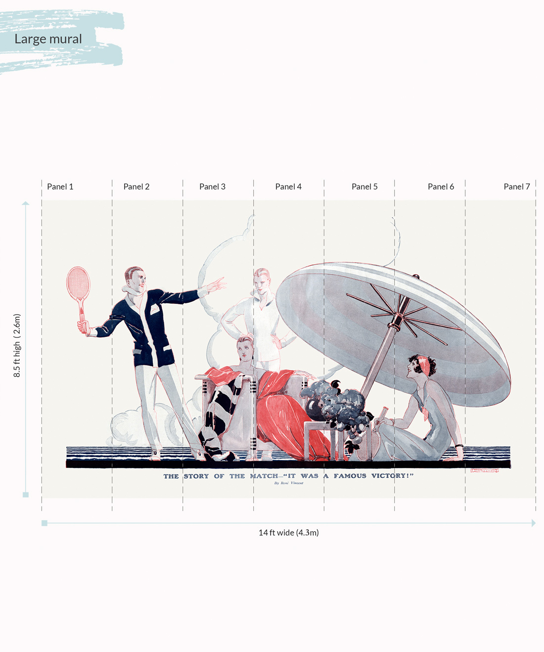 “Darling, I returned service with such unrestrained vigour!” Probably a tall tale, but makes for a wonderfully cultured scene, don’t you say? This tennis wall mural is no delicate feather. A stunning illustrated vintage mural wallpaper that would look amazing in a pool house, a stylish and sophisticated teen bedroom or a hipster clothing store.