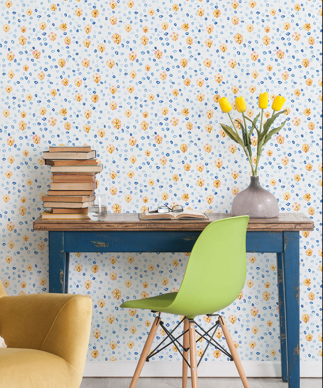 Al Hadiqa’s fresh, fun floral wallpaper design from Dubai based Australian artist and textile designer Georgia Macmillan will brighten any room. Al Hadiqa’s soft pinks and light blues perfectly match with the sunny yellows and deep indigo tones. Inspired by the beautiful gardens which line the Dubai city streets, this sweet pattern will compliment a variety of colors and interiors.