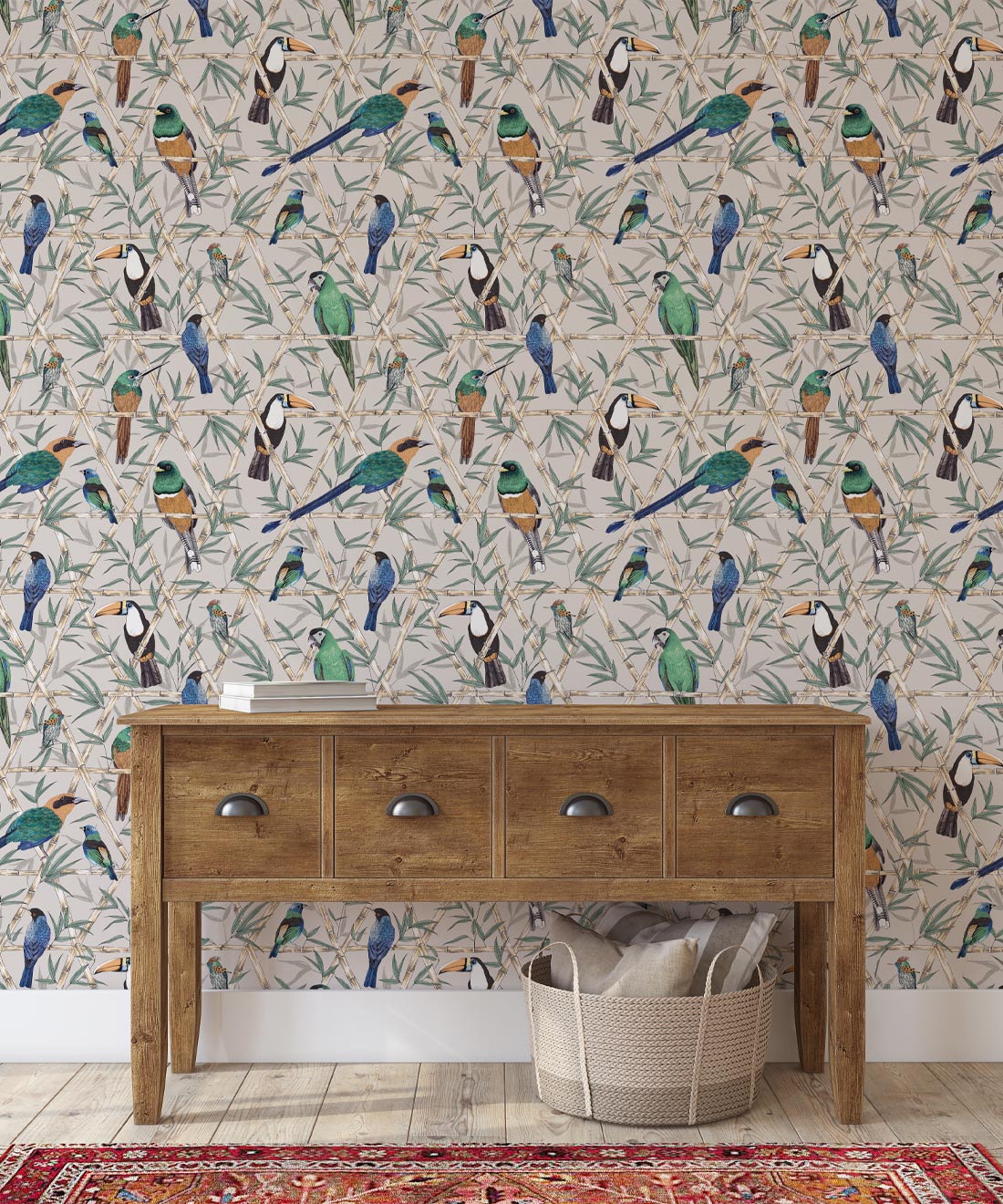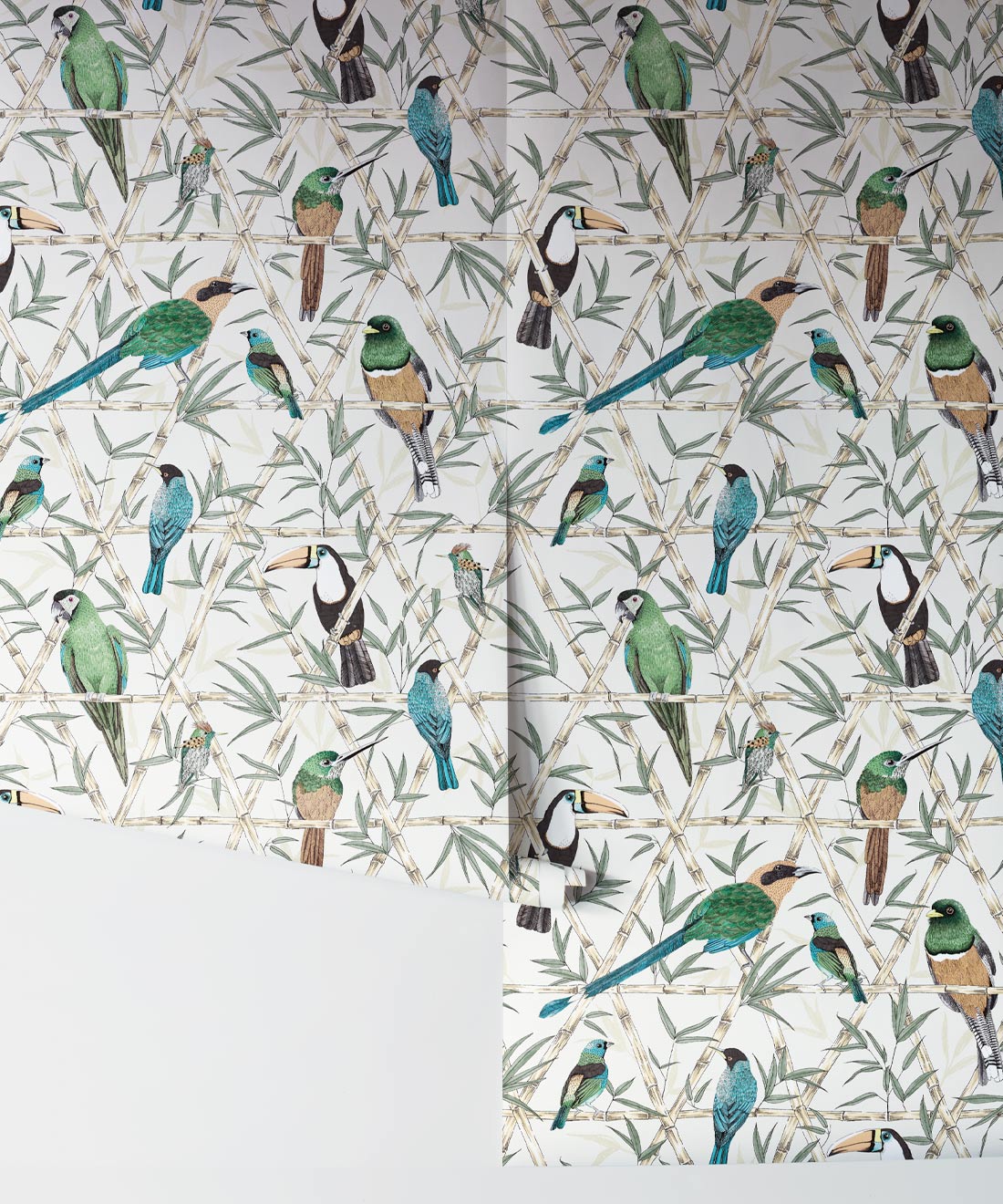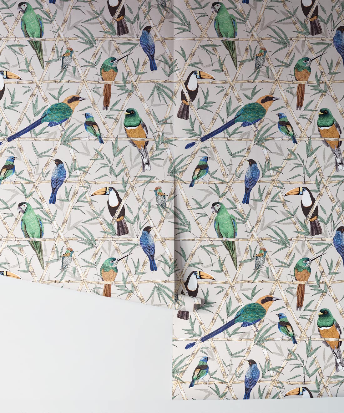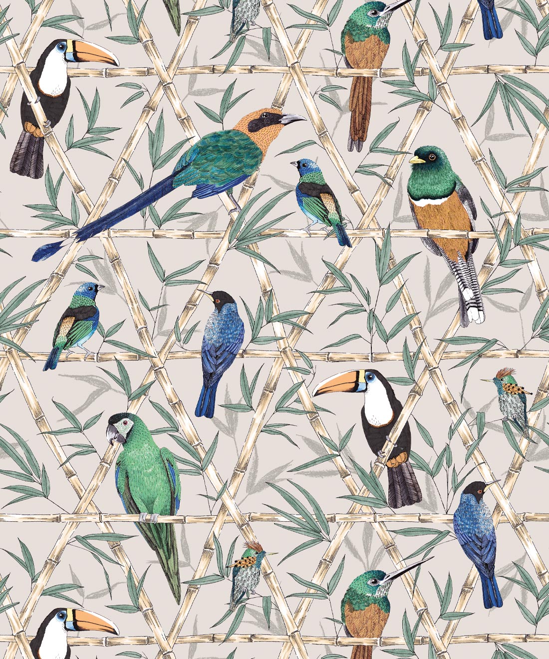 Bamboo Birds Wallpaper captures the true beauty of Amazon birdlife. A gorgeous bird wallpaper by Jacqueline Colley features Toucans, Macaws, Rufous-tailed Jacamars, and Amazon Kingfishers perched upon a trellis of bamboo.