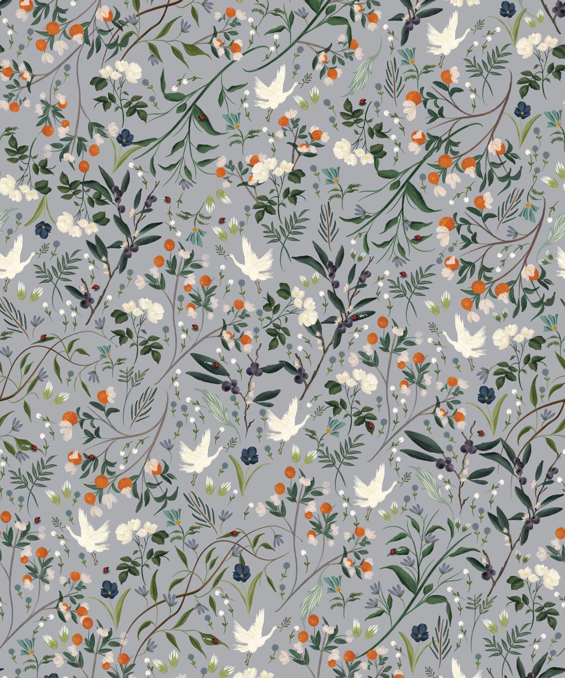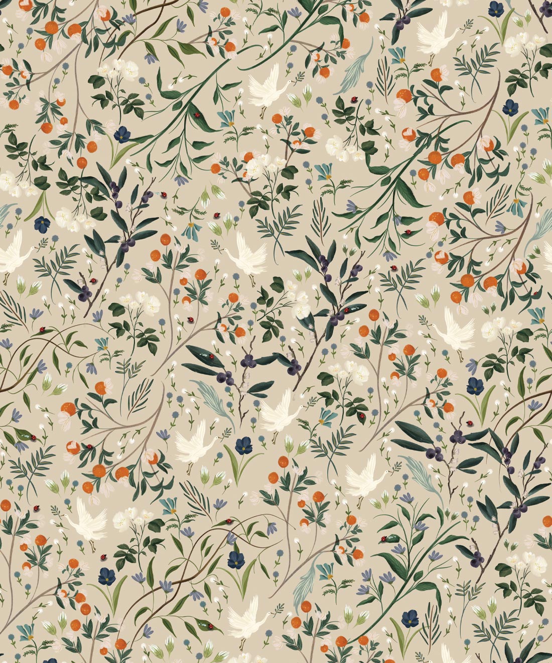 The Bespoke Cranes wallpaper from Bespoke Letterpress depicts a serene landscape featuring graceful cranes surrounded by vibrant orange blossoms. The intricately detailed illustration showcases the majestic birds and clusters of delicate flowers, creating soft shades and a peaceful scene of beauty and harmony. The elements work together seamlessly to create a stunning visual tapestry that will bring joy and tranquility to any room. Nancy Noreth’s skillful artistry truly shines in this masterpiece, capturing the essence of nature’s majesty in every brushstroke.