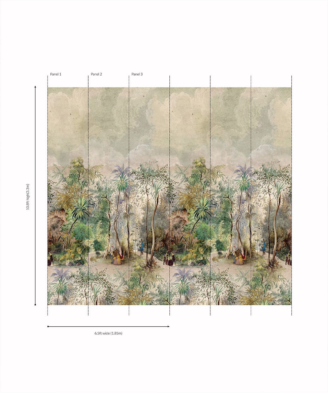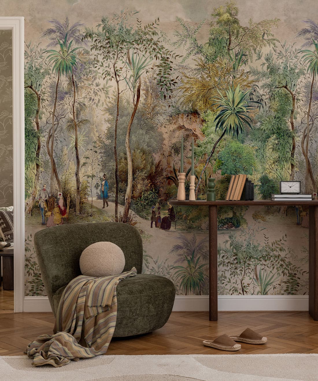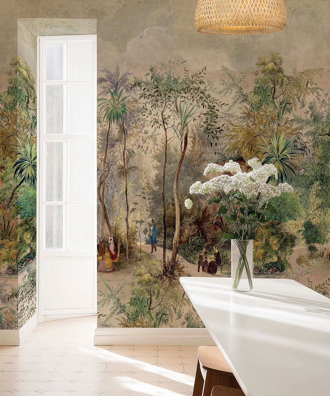 Step into a serene and timeless oasis with the Botanical Gardens Mural, a reimagining of an original 18th-century illustration. Inspired by designer Bethany Linz’s tranquil escapes to Sydney’s Royal Botanic Garden, this mural features delicate foliage, manicured pathways, and elegantly dressed guests basking in the beauty of nature. Blending historical charm with modern sophistication, Botanical Gardens Mural transforms walls into a painterly retreat, perfect for creating interiors that exude grace and calm.