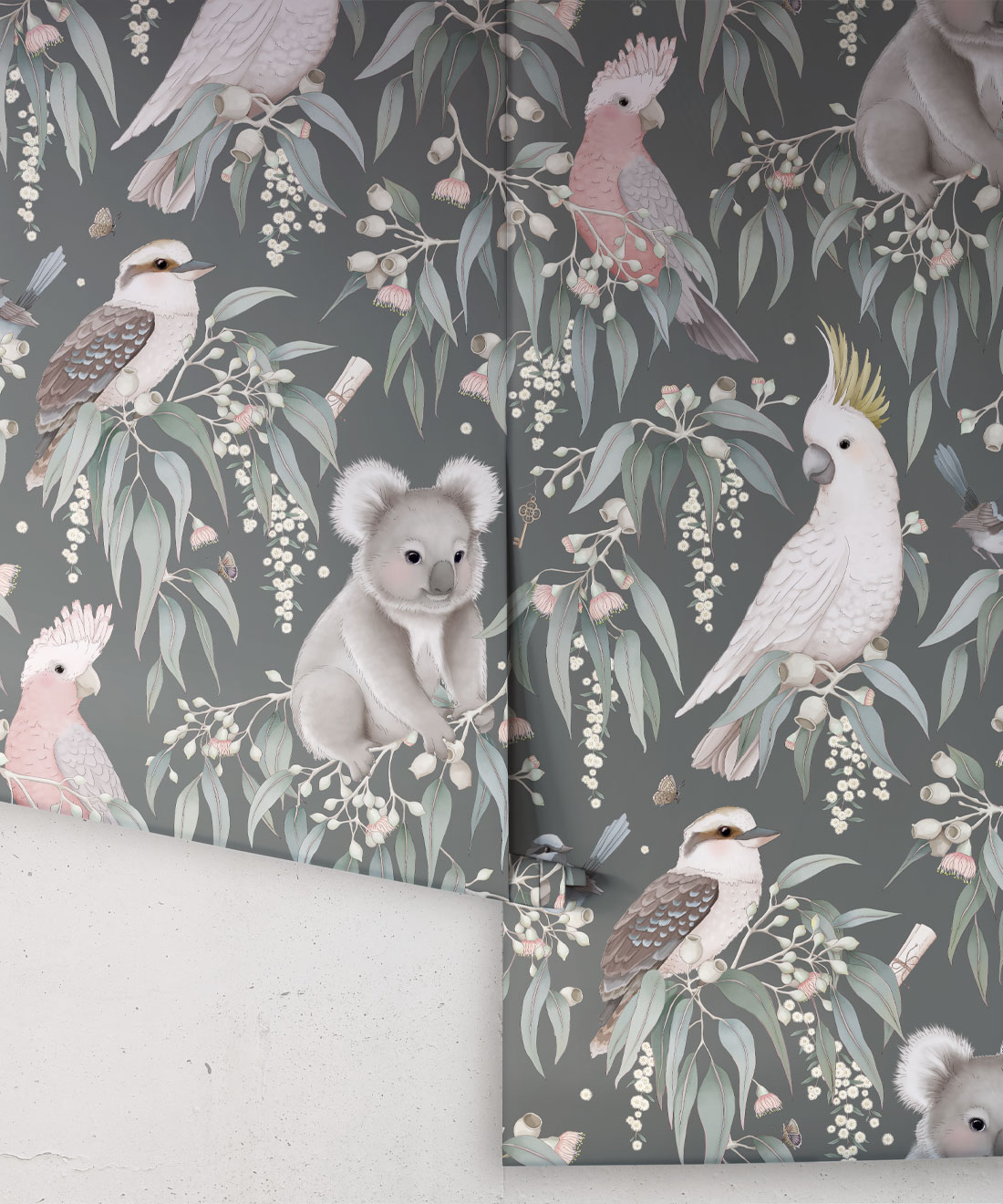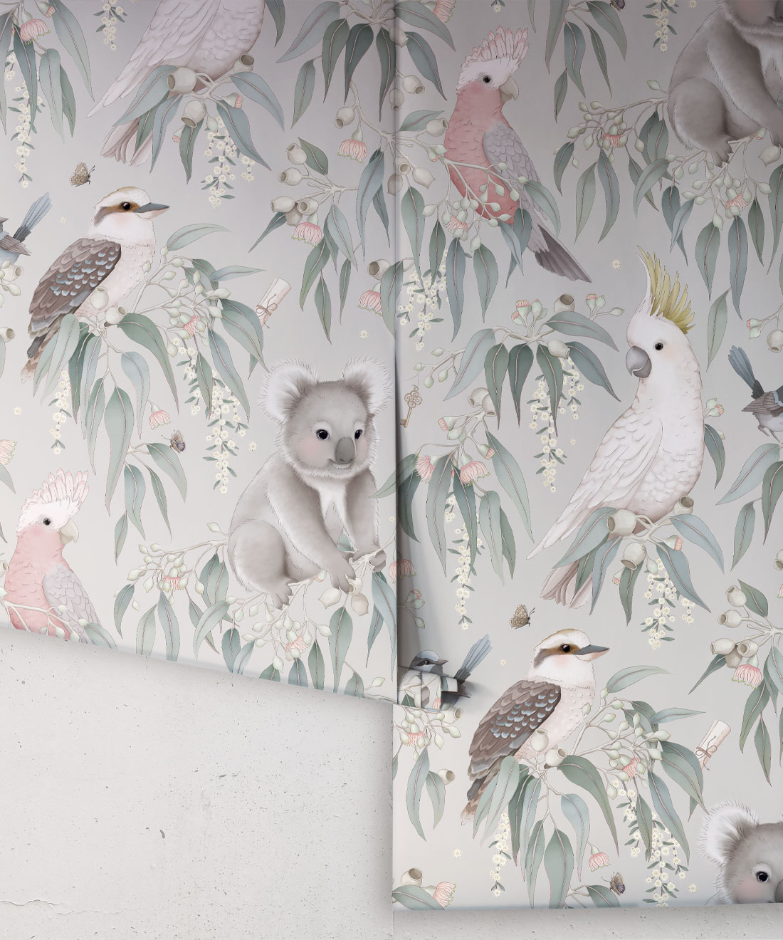 Meander through the gum trees and into the Bush Babies Wallpaper collection by Fleur Harris. Abundant with magnificent foliage and blossoms, this gentle bush scene is home to an array of adorable wildlife like koalas, cockatoos and galahs, ready to welcome you into their world. Whimsical details are woven throughout, while a gentle color palette grounded in smokey greens and neutrals offers broad appeal. Destined to be treasured for years to come, the Bush Babies Collection is perfect for creating magical spaces such as a delightful nursery or rumpus room wonderland.