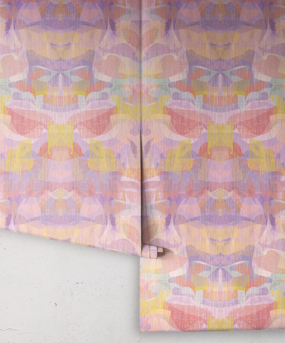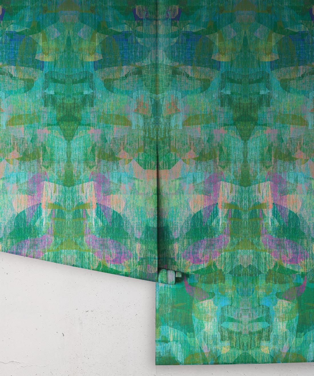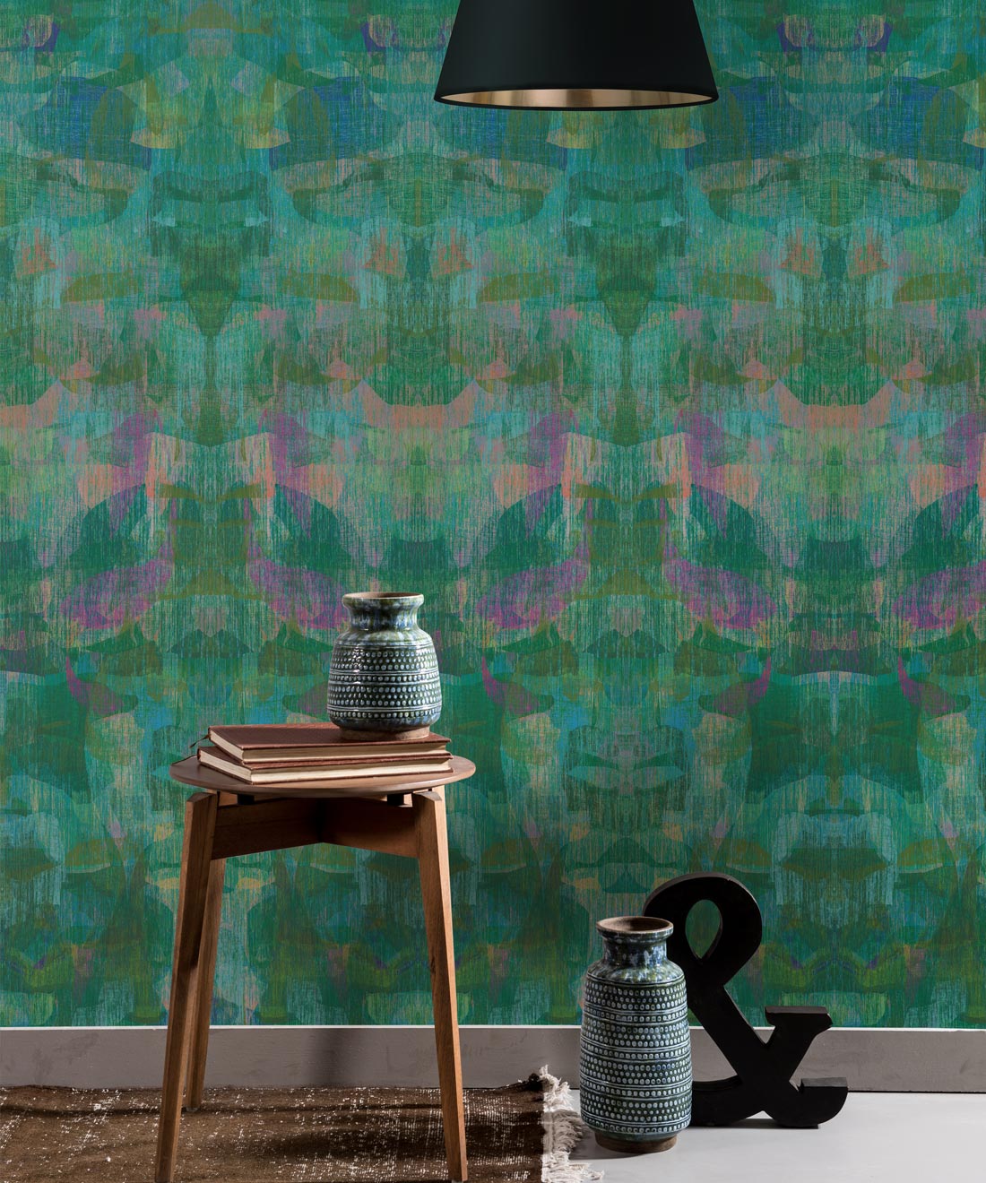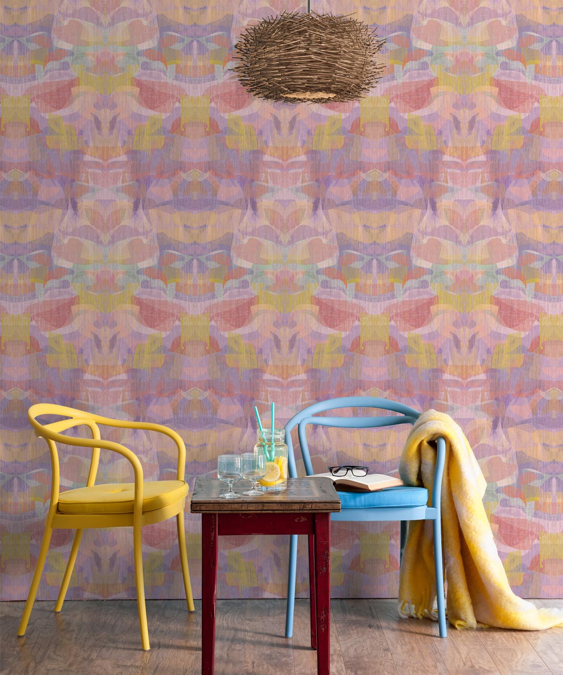 Camoufleur has a soft, abstract and almost iridescent quality that draws inspiration from plants and colors of the natural world. It is perfect for a colorful feature wall and adapts to a variety of styles. This energetic wallpaper vibrates with color and light with abstract shapes that allude to the dynamic energy of nature, with a cool twist of retro.
