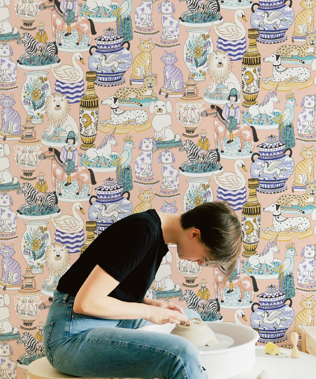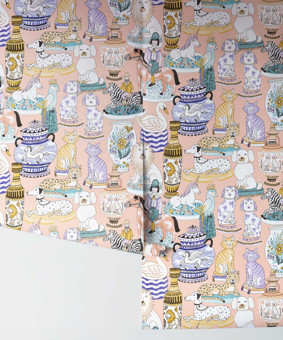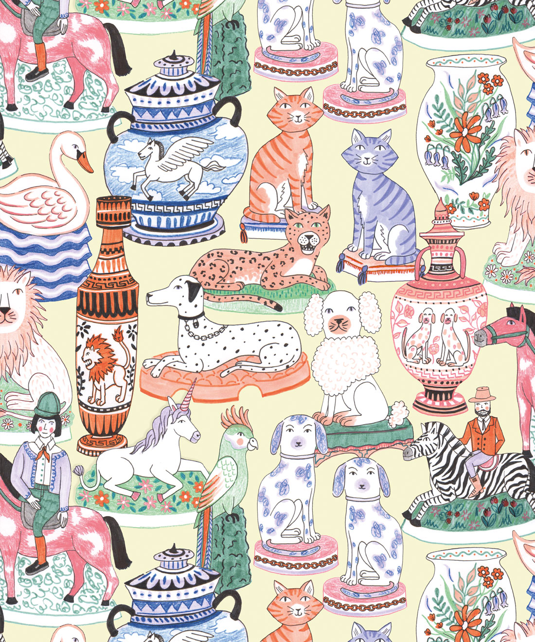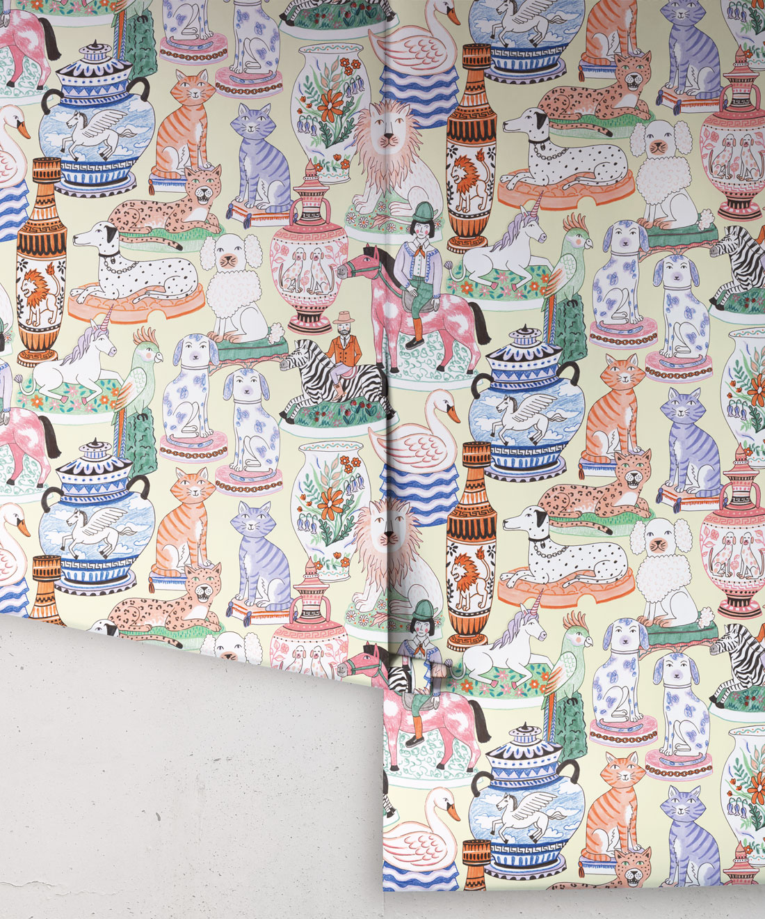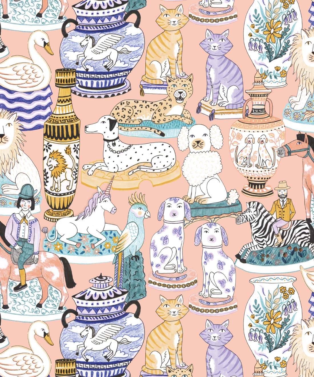 Ceramics Wallpaper is a joyful take on the maximalist trend. This graphic wallpaper design by Jacqueline Colley demonstrates her love of collecting and illustrating objects. Staffordshire Pottery and earthy hues are combined to create a designer wallpaper that celebrates english eccentricities. It features urns, vases and statues of dogs, cats, lions, parrots and unicorns. For lovers of ceramic art, this funky wallpaper design pays homage with a sense of humor.