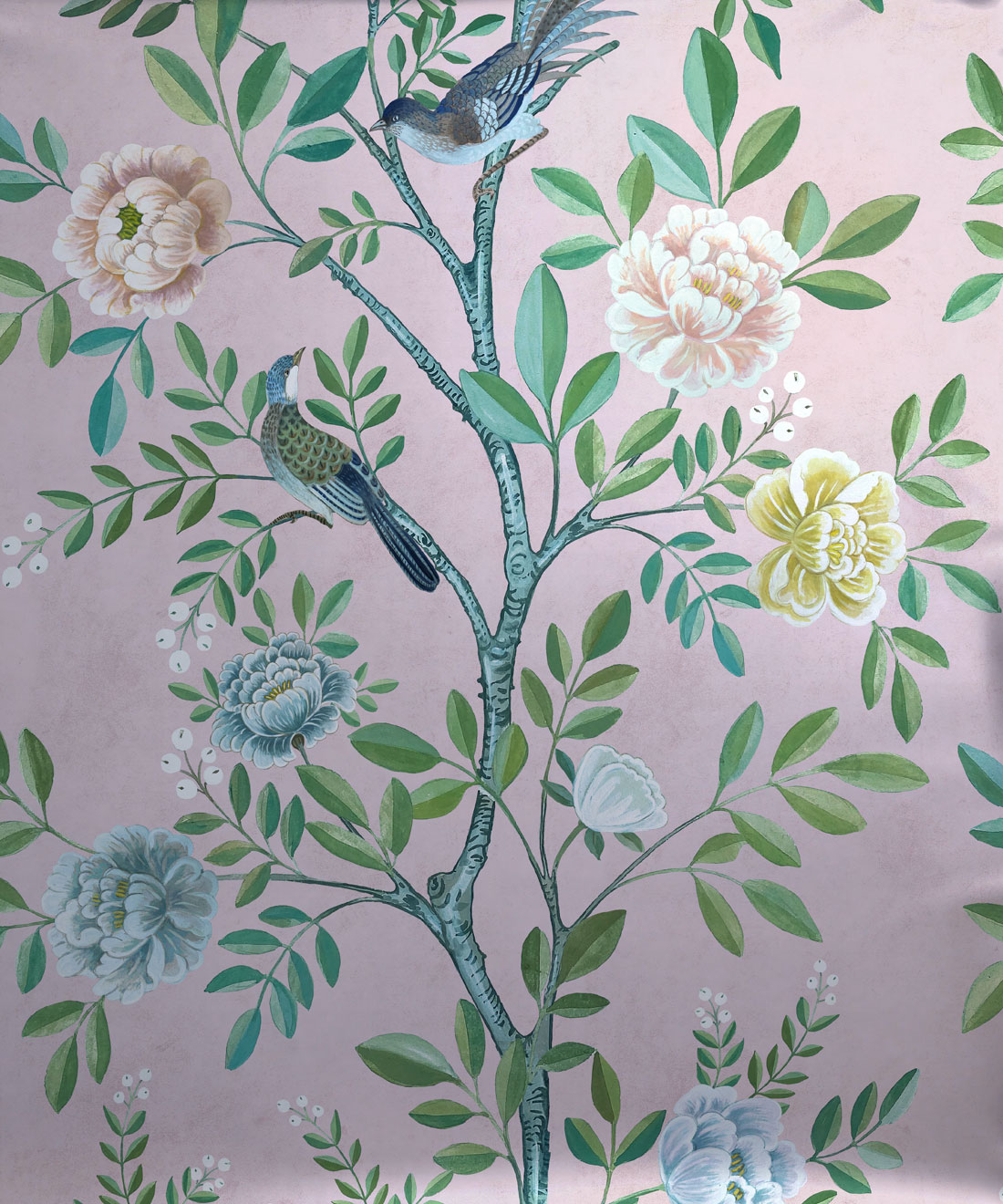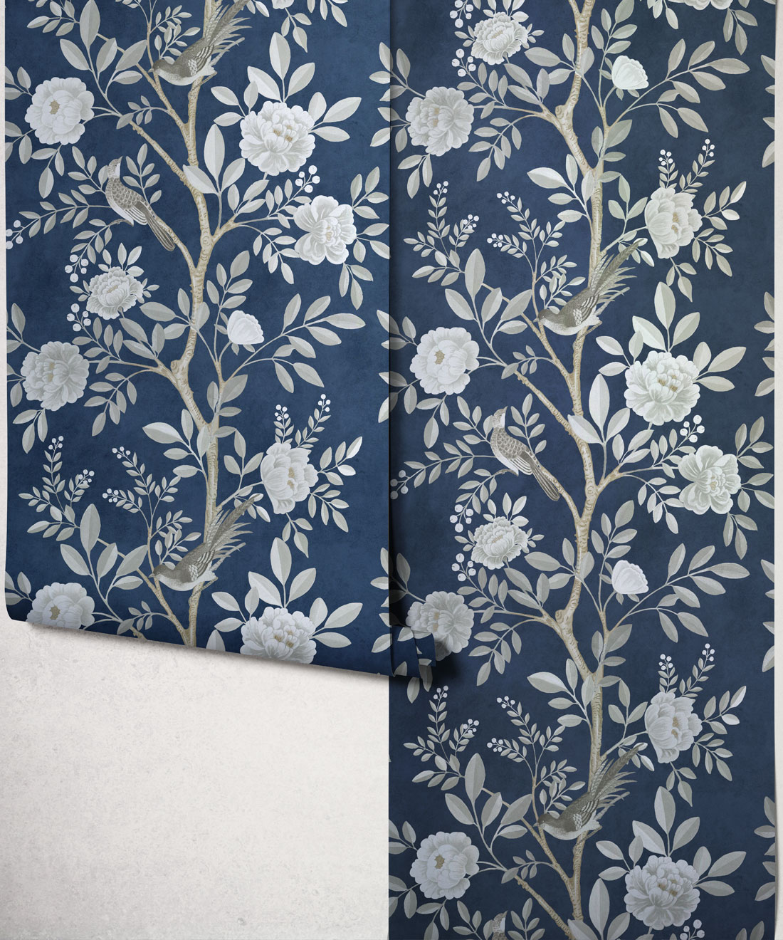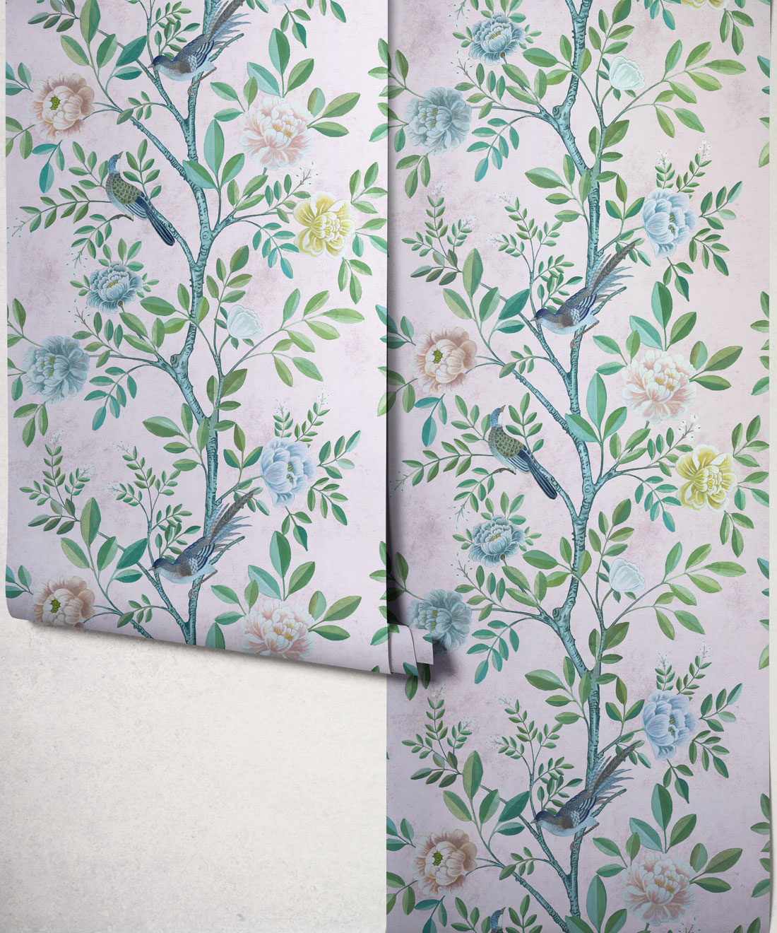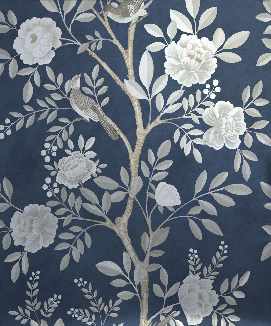 Chinoiserie Wallpaper is a modern interpretation of classic decorative hand-painted panels originally seen in Europe in the mid-17th century. Vertical branches adorned with bold blooms and playful birds are enhanced with refined gold metallic accents. This painterly design introduces colour, pattern and elegance across both traditional and modern interiors.