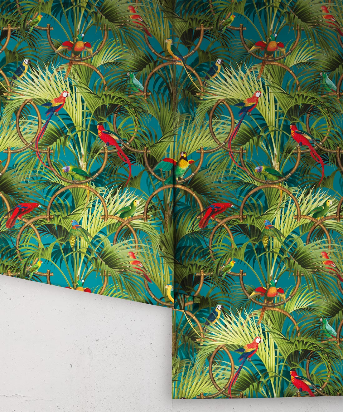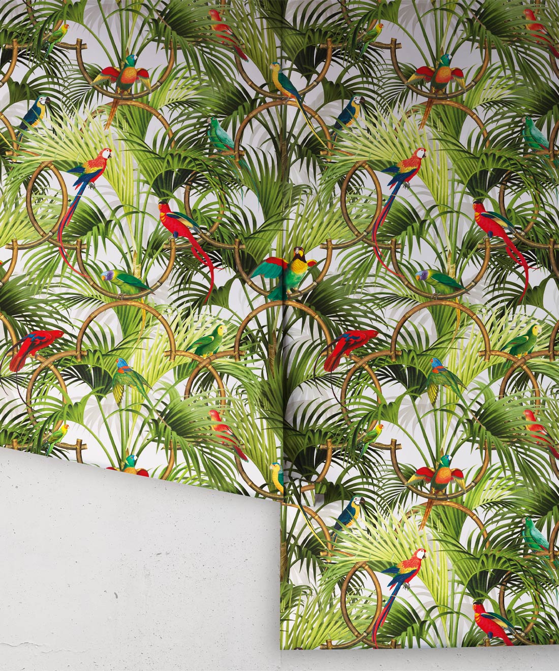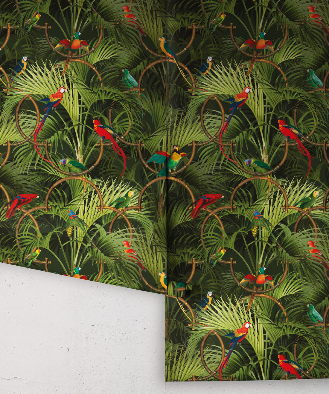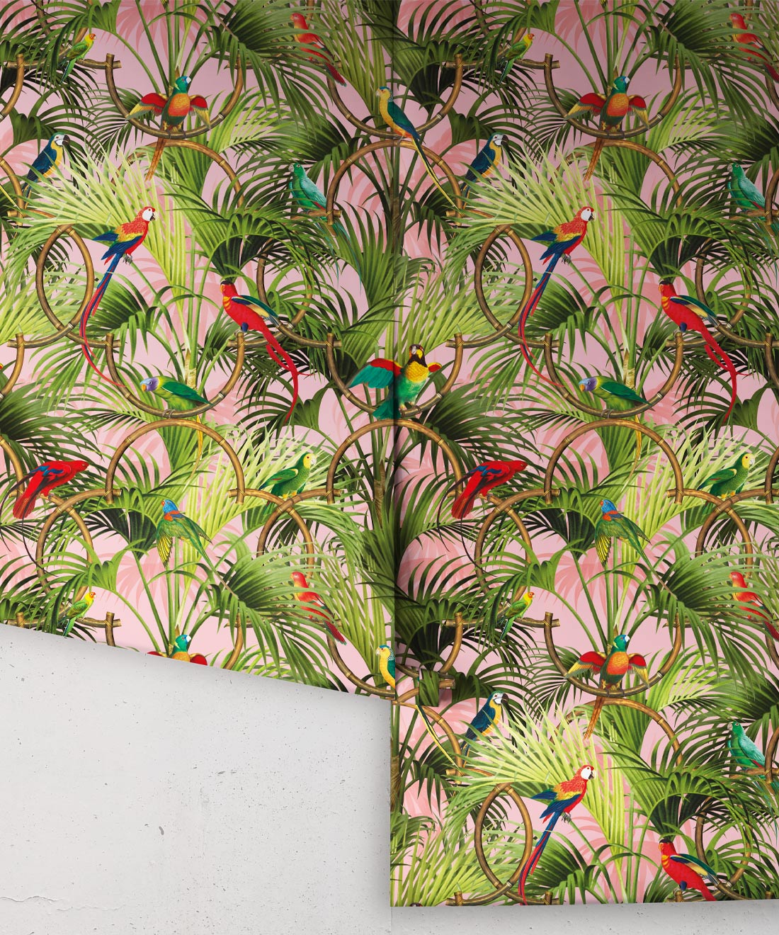 A decadent and exotic ensemble of foliage and exotic birds, the Copacabana Wallpaper brings a touch of lusciousness and tropical flare to any interior. This oasis of flora and fauna draws inspiration from our love of nature and the formation from our very own insignia, a design that represents the balance of refinement and unfiltered nature’s beauty we strive to capture. Add wings to your interior and soar into a world of feathery beauty with the Copacabana tropical parrots wallpaper.