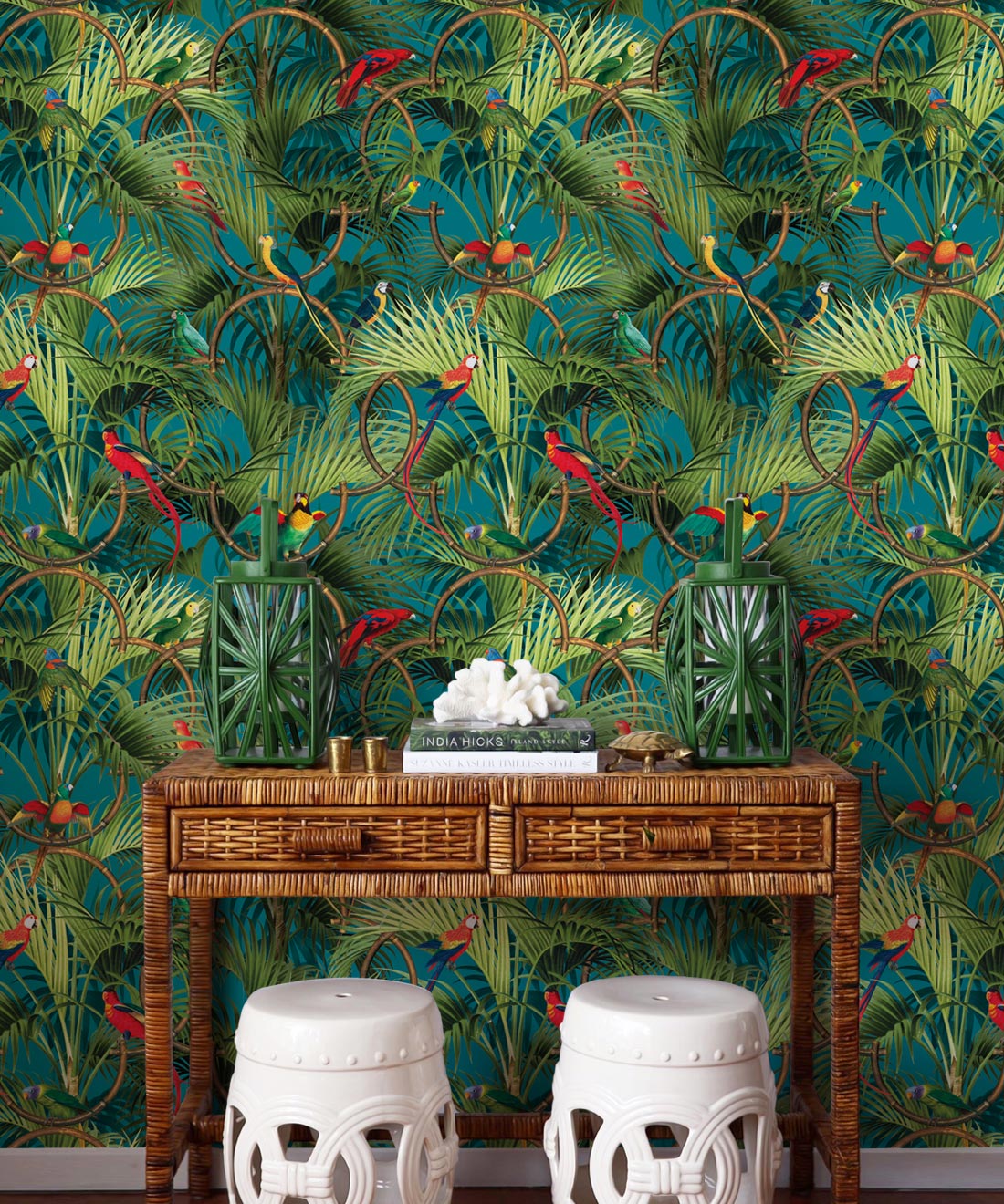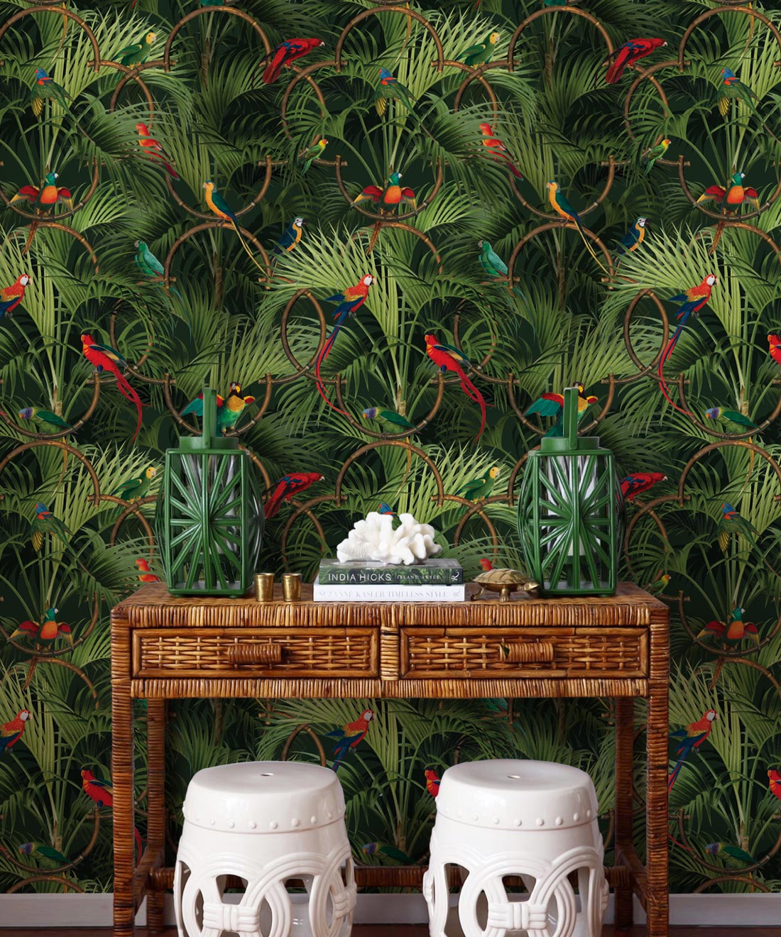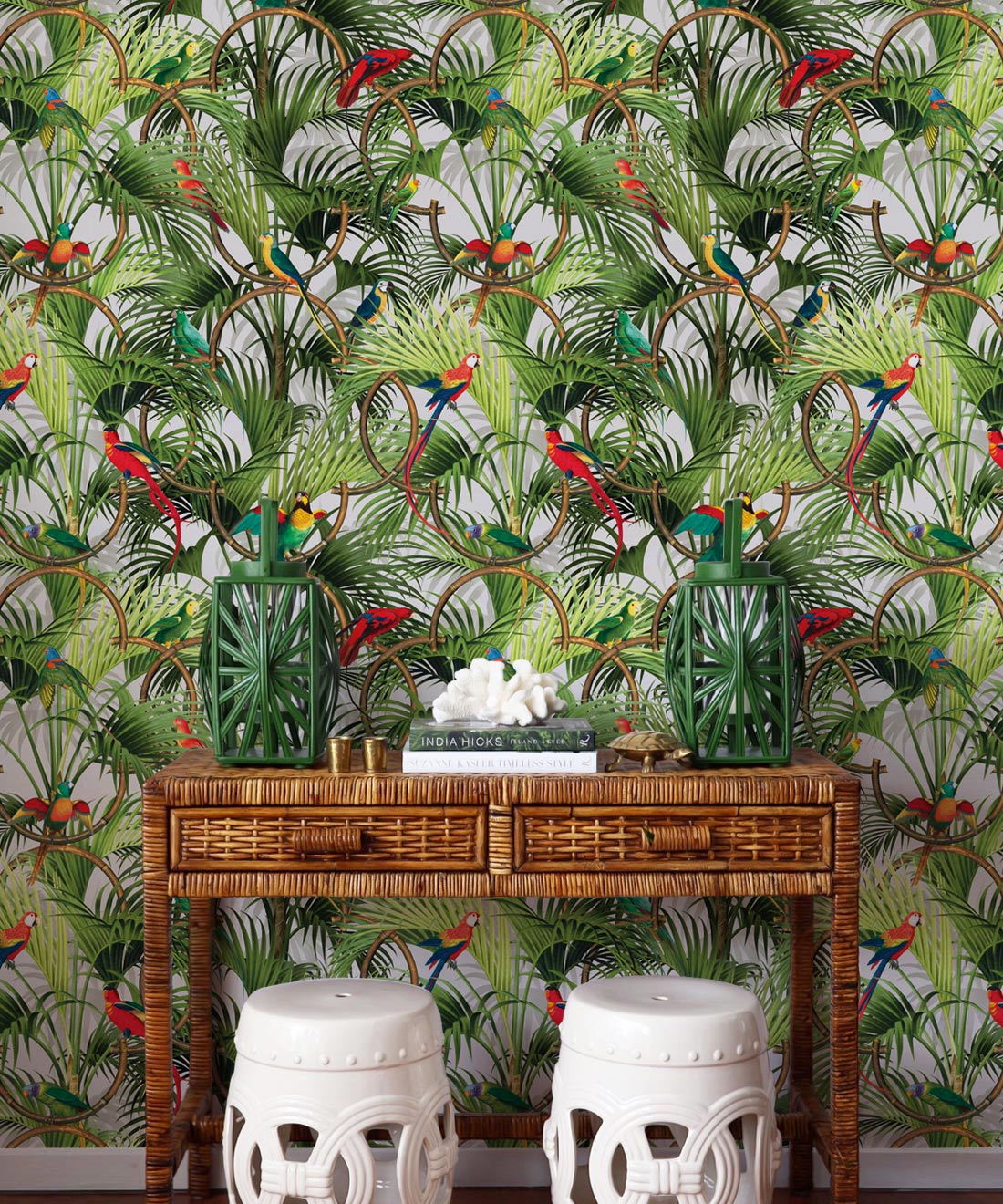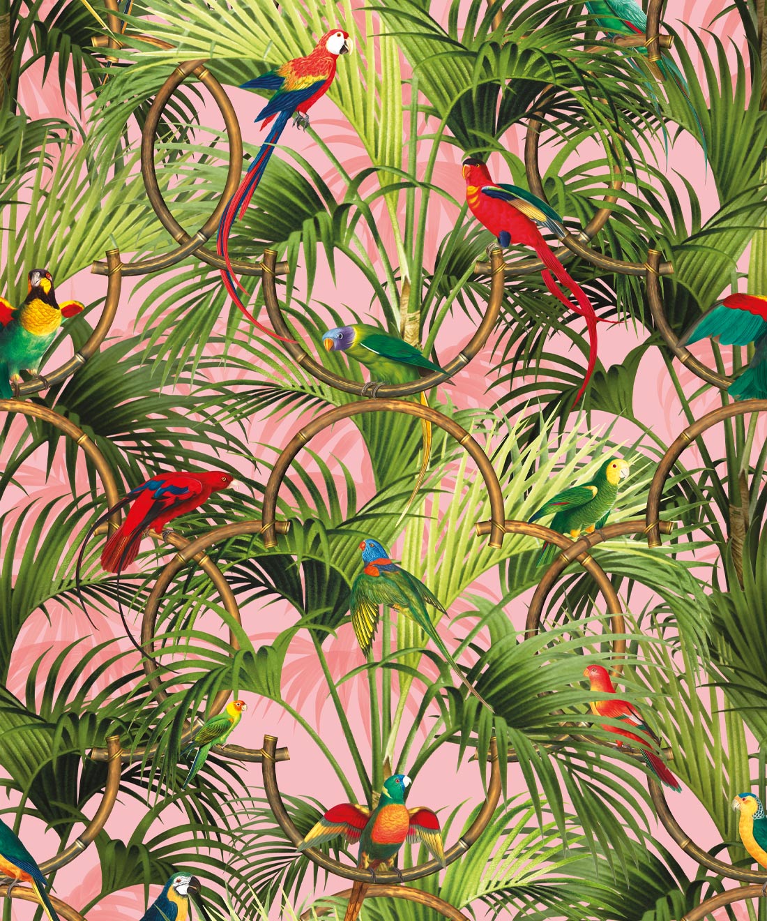 A decadent and exotic ensemble of foliage and exotic birds, the Copacabana Wallpaper brings a touch of lusciousness and tropical flare to any interior. This oasis of flora and fauna draws inspiration from our love of nature and the formation from our very own insignia, a design that represents the balance of refinement and unfiltered nature’s beauty we strive to capture. Add wings to your interior and soar into a world of feathery beauty with the Copacabana tropical parrots wallpaper.