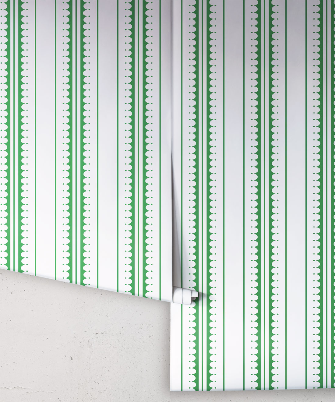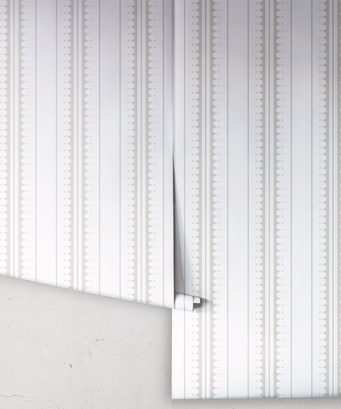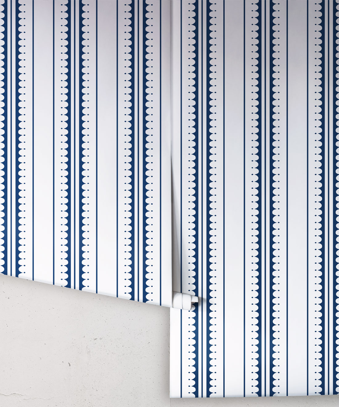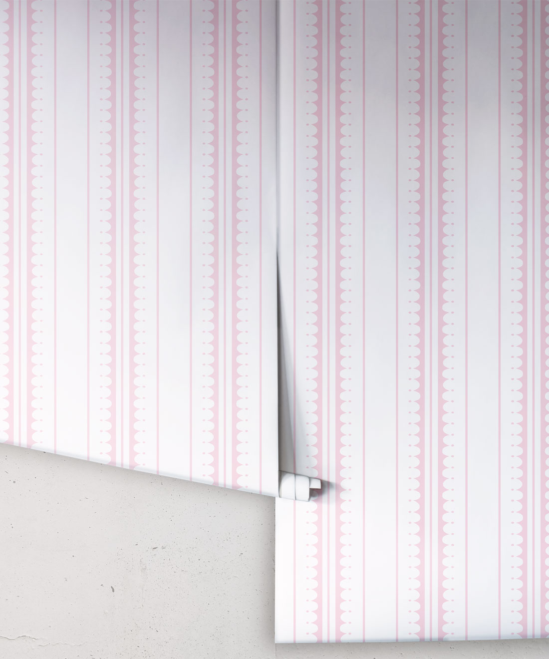Coquille Wallpaper is the kissing cousin of La Grand Coquille Wallpaper. A simpler but no less charming scallop wallpaper ready to decorate every room in your home. A perfect way to add detail, structure and whimsy to any scenario with this clever combination of scallop and stripe – impossible not to love!