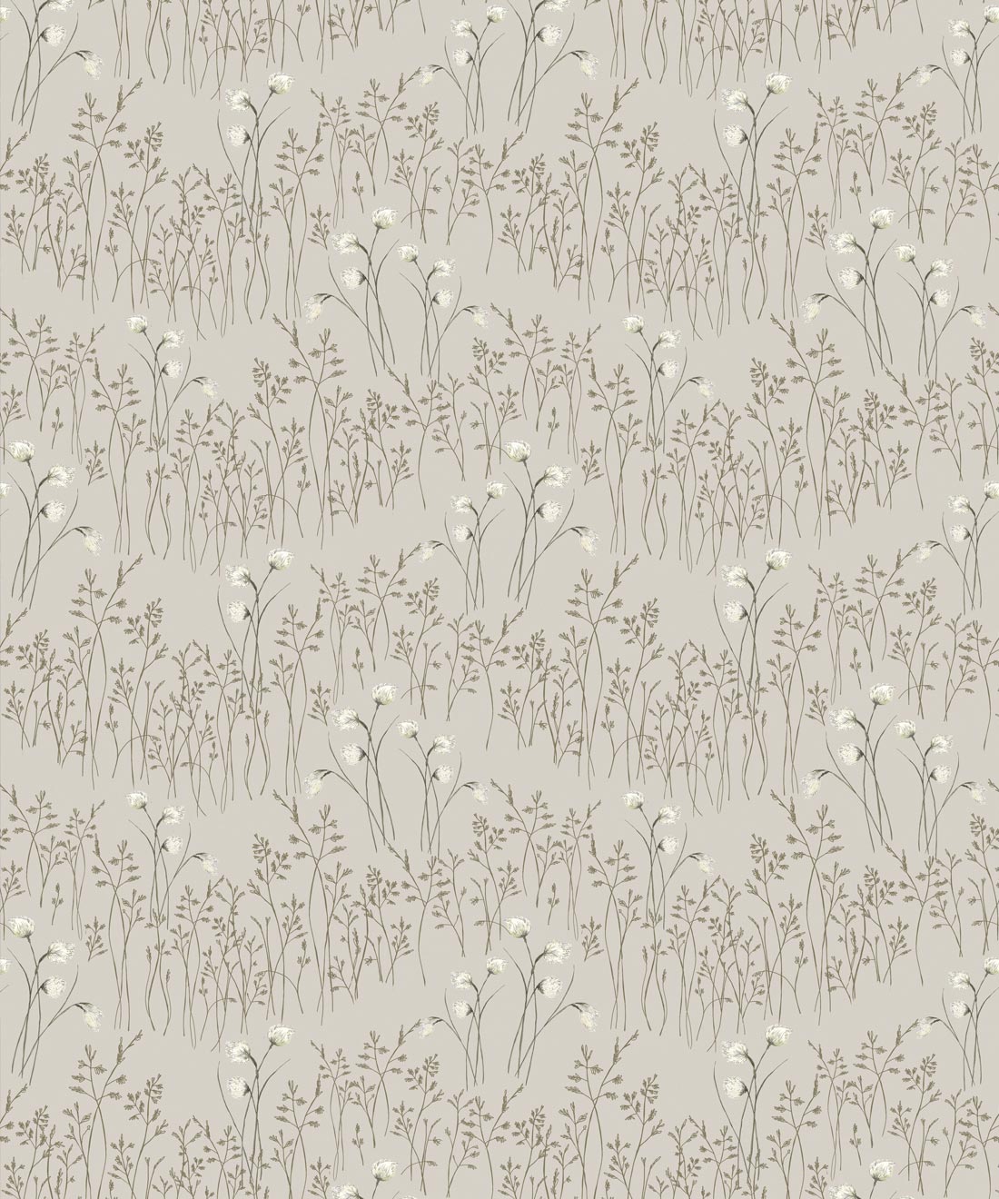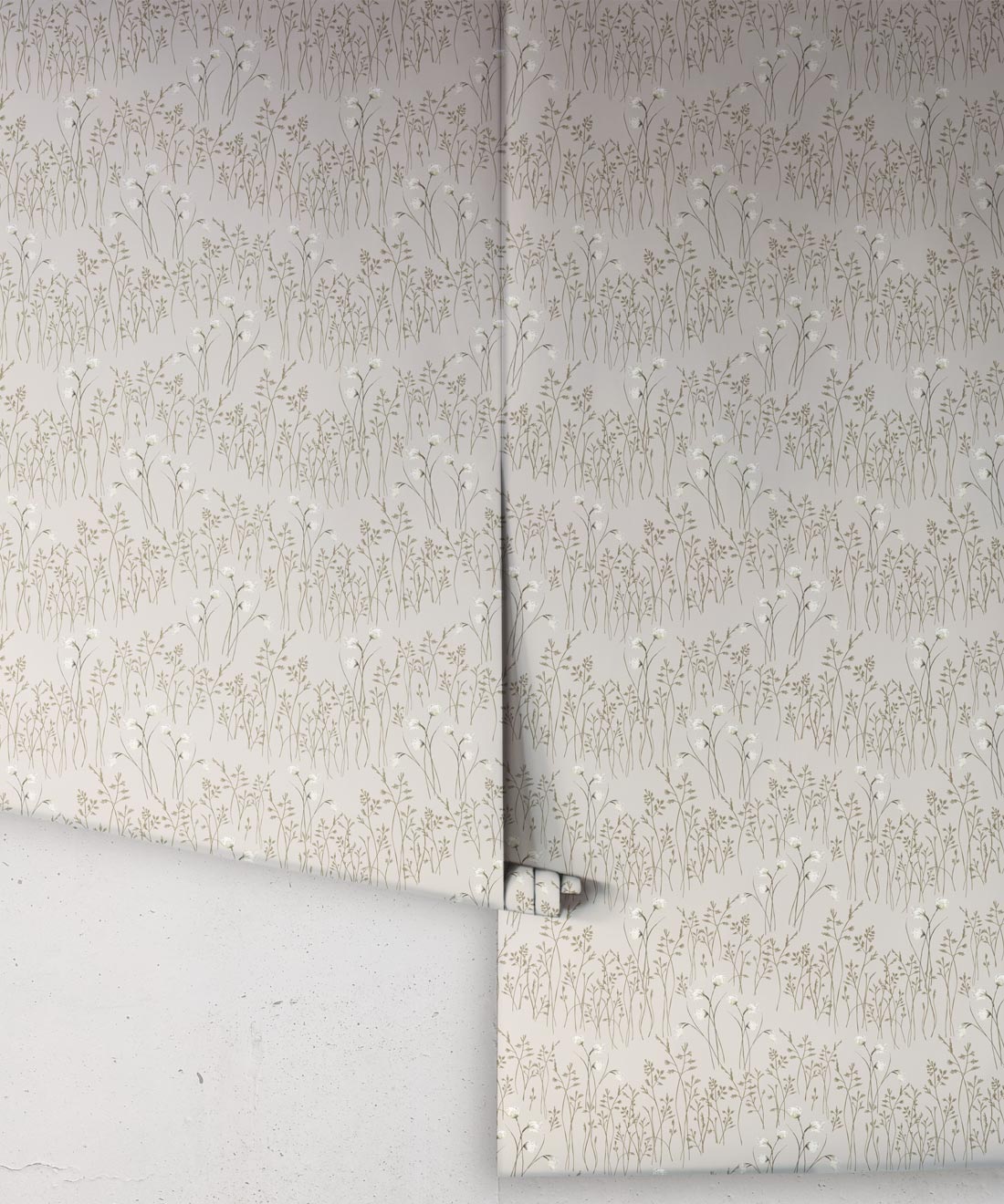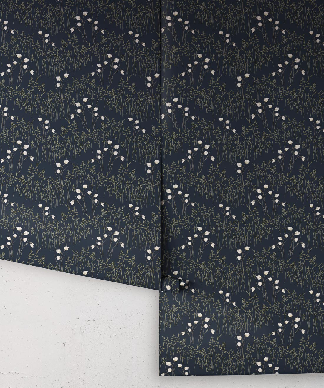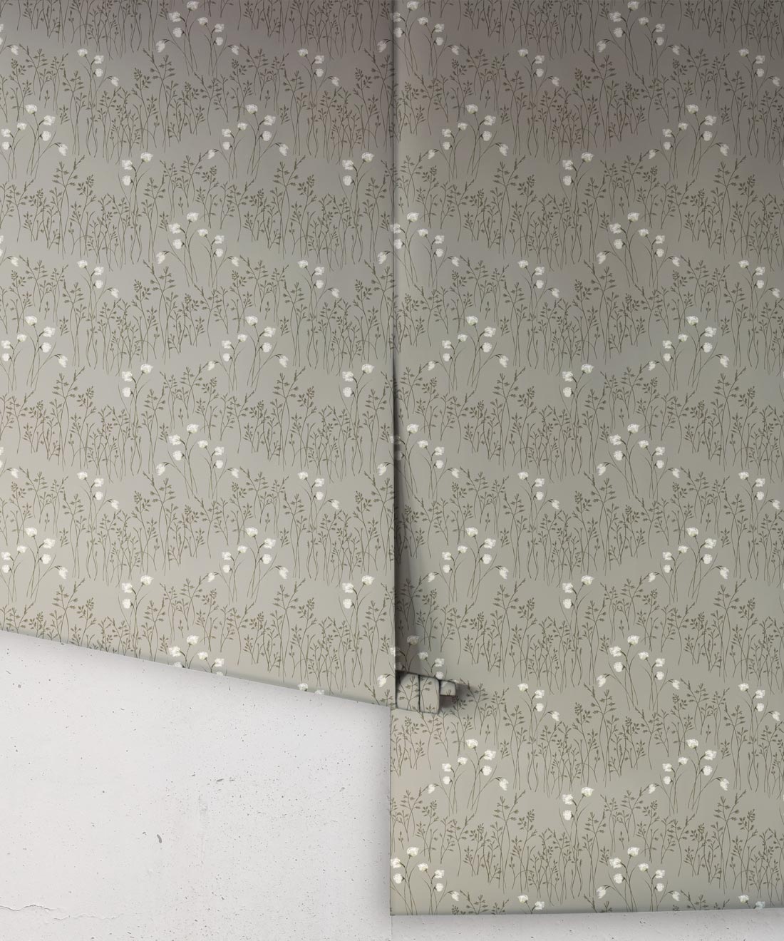 Referencing the peaty bog fields of Scotland and open vistas of long grasses with fluffy white heads, the Cotton Grass wallpaper portrays these slender blooms dancing amongst themselves. Also known as bog cotton, or hares’ tails, cotton grass swaying in the wind is a beautiful sight to behold and the artist has embodied the plant’s delicacy in this flowing grassland wallpaper pattern creating something truly unique by using hand-drawn line work in vintage toned-down hues contrasting the modern zig-zag of horizon lines.
