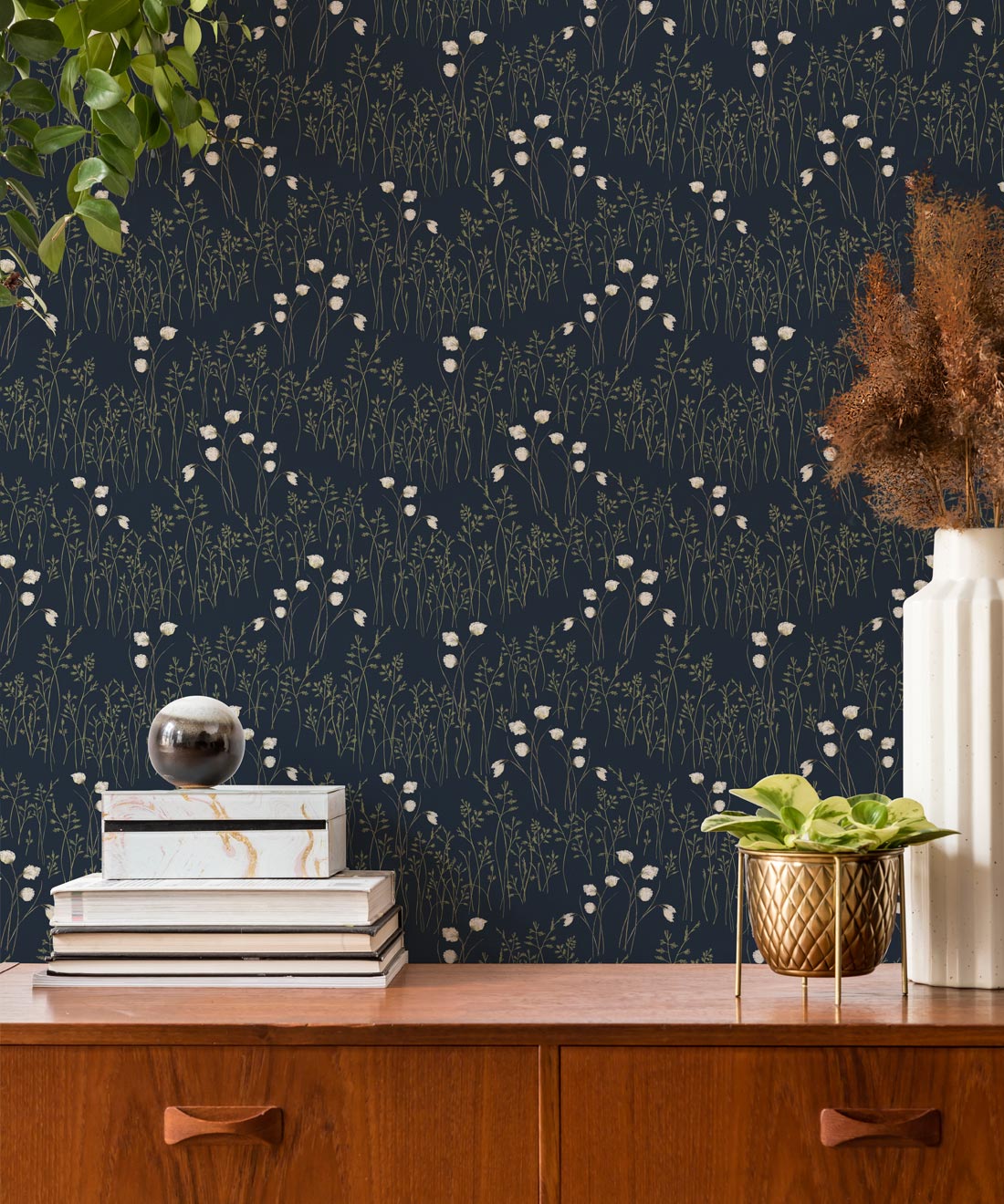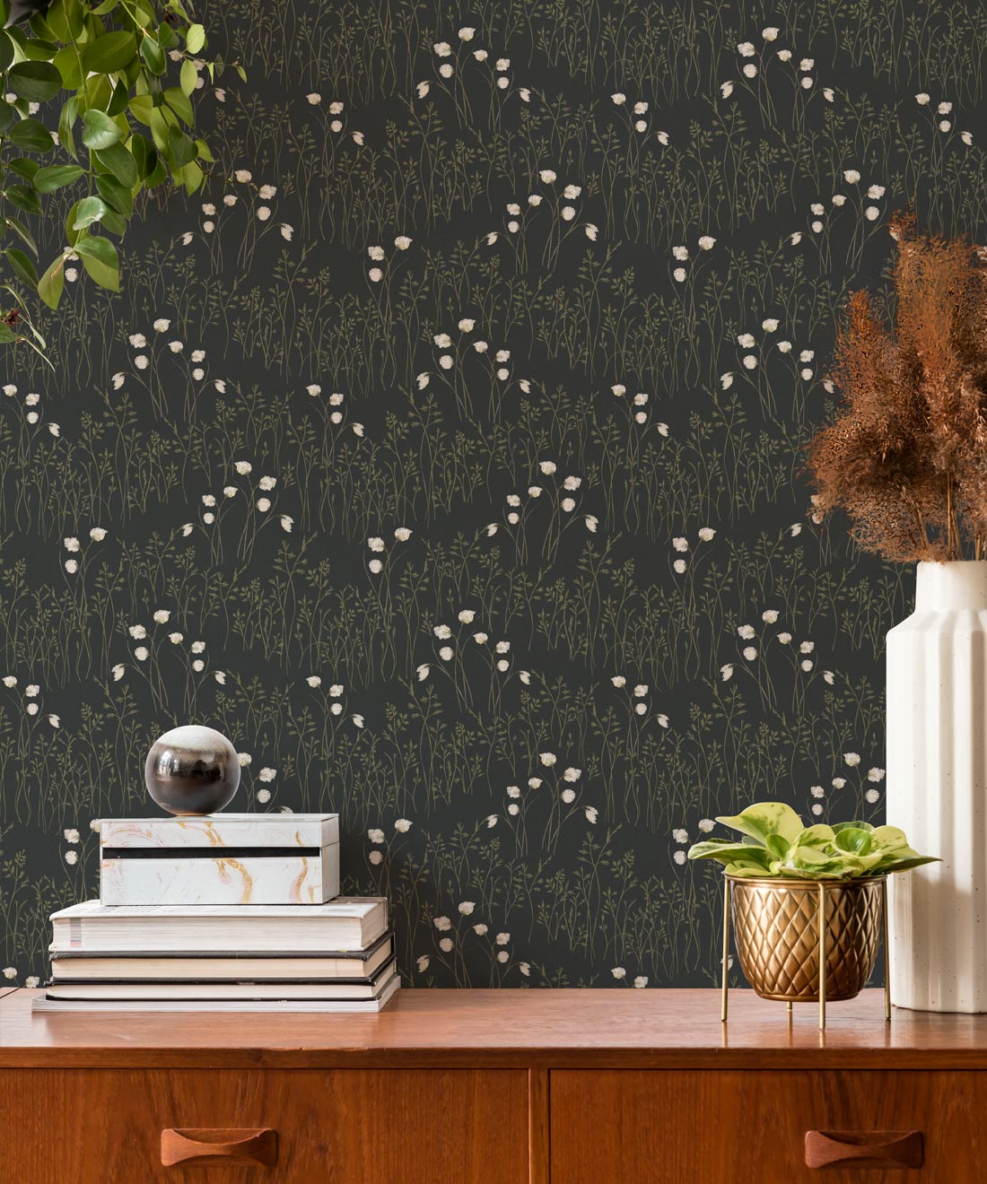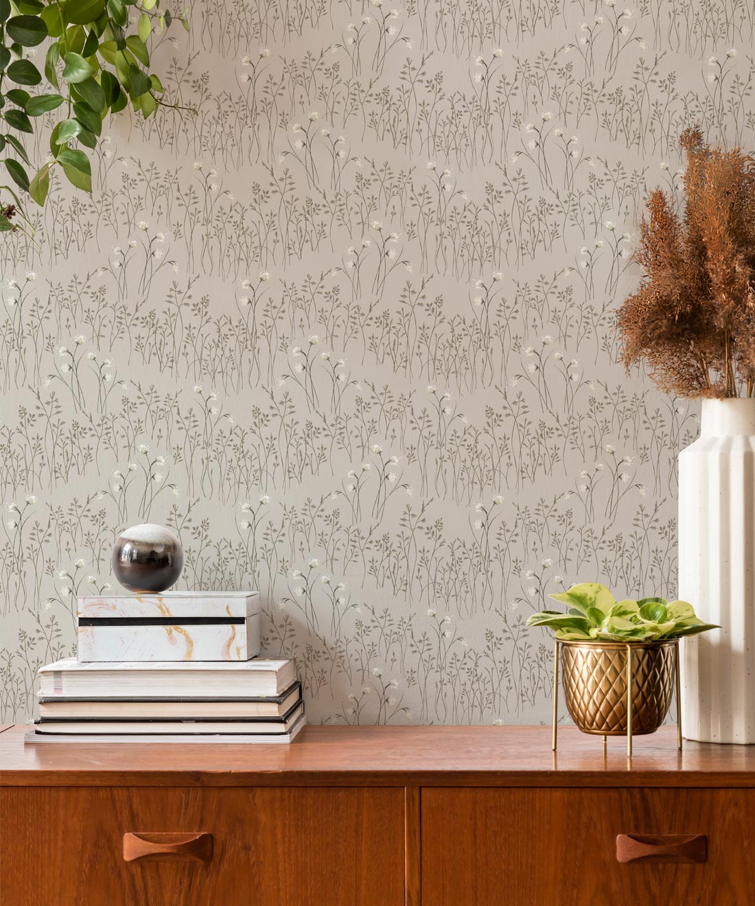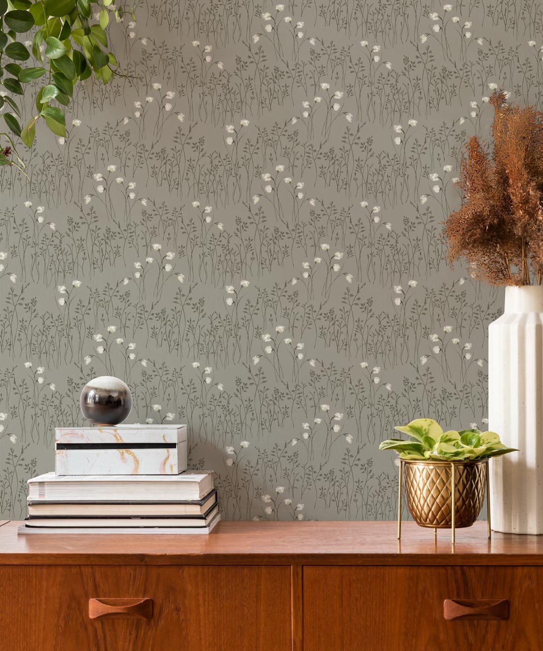 Referencing the peaty bog fields of Scotland and open vistas of long grasses with fluffy white heads, the Cotton Grass wallpaper portrays these slender blooms dancing amongst themselves. Also known as bog cotton, or hares’ tails, cotton grass swaying in the wind is a beautiful sight to behold and the artist has embodied the plant’s delicacy in this flowing grassland wallpaper pattern creating something truly unique by using hand-drawn line work in vintage toned-down hues contrasting the modern zig-zag of horizon lines.
