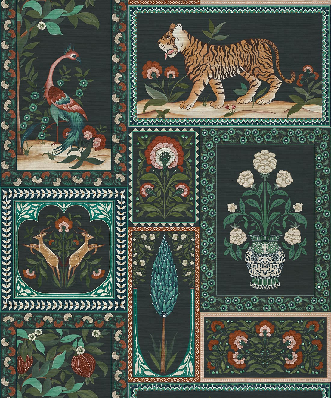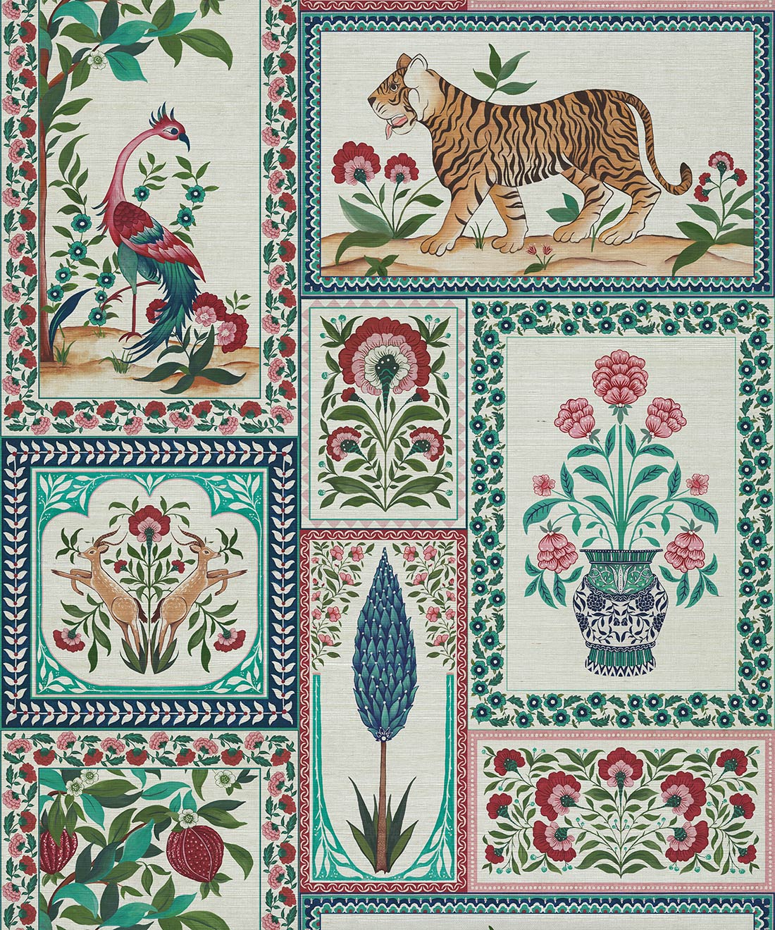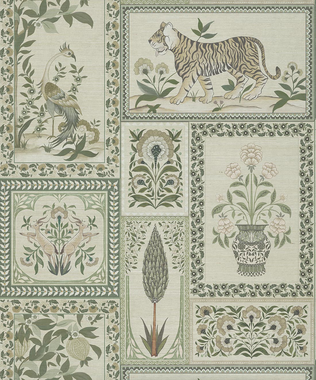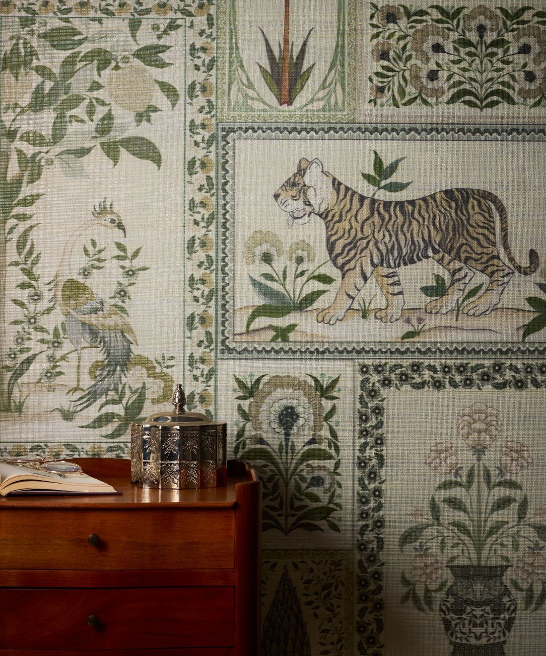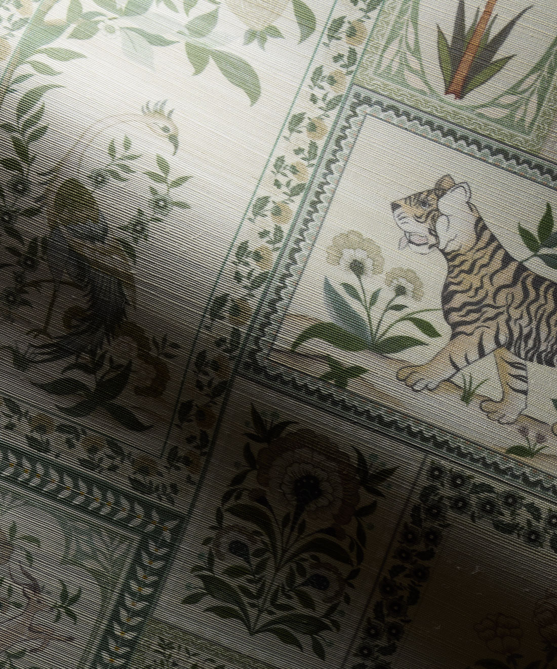 The Courtyard Grasscloth wallpaper is a delicate, hand-painted design inspired by traditional Indo-Persian artworks, featuring delicate flora and fauna native to the region. Individual elements are enveloped in frames of leaves and flowers, effortlessly creating a sense of beauty and balance, and the natural woven background is reminiscent of traditional tapestries and embroidery. This design pairs perfectly with the entire Palace Grove collection, allowing you to create a harmonious and elegant interior that breathes warmth and romance throughout.