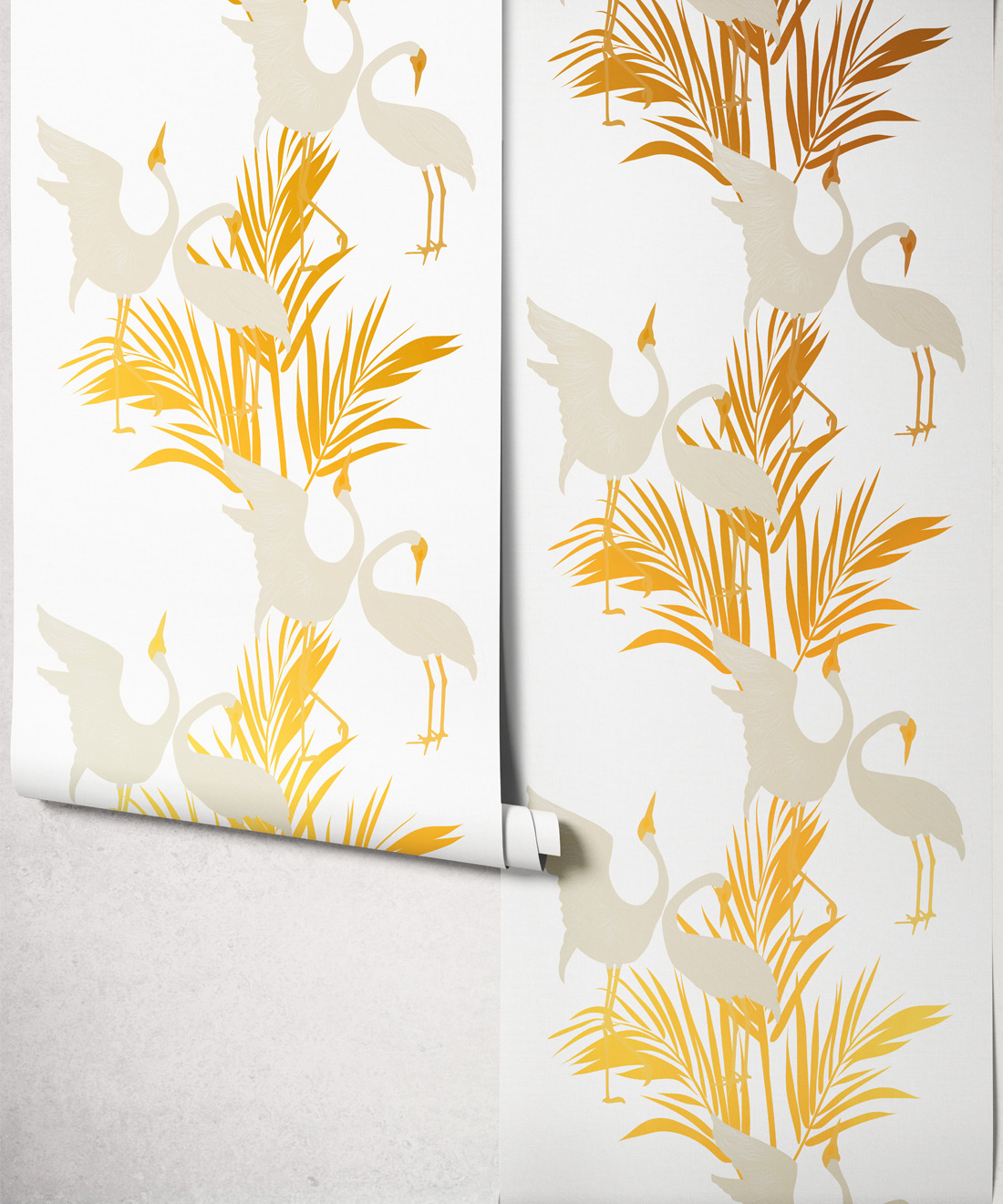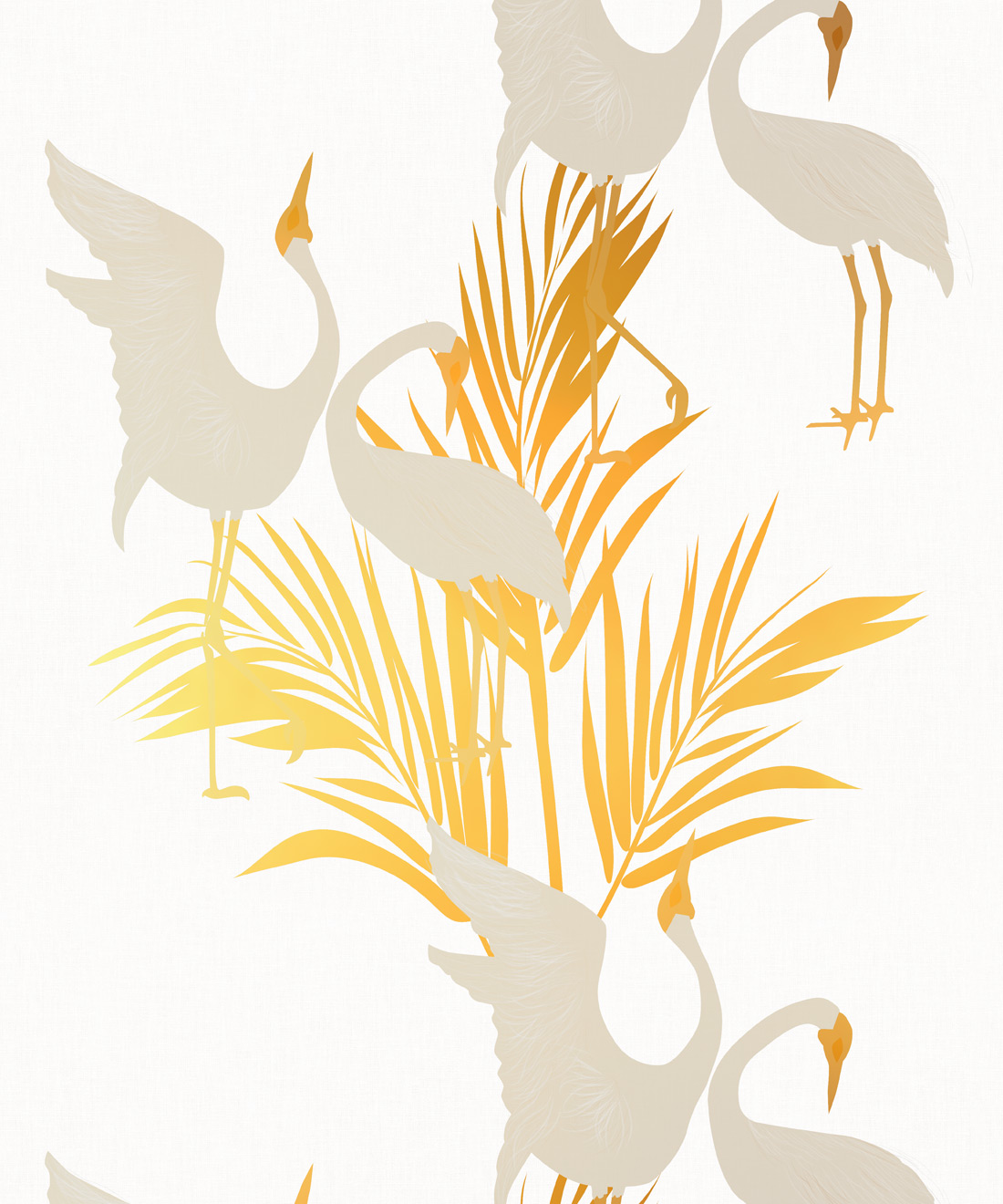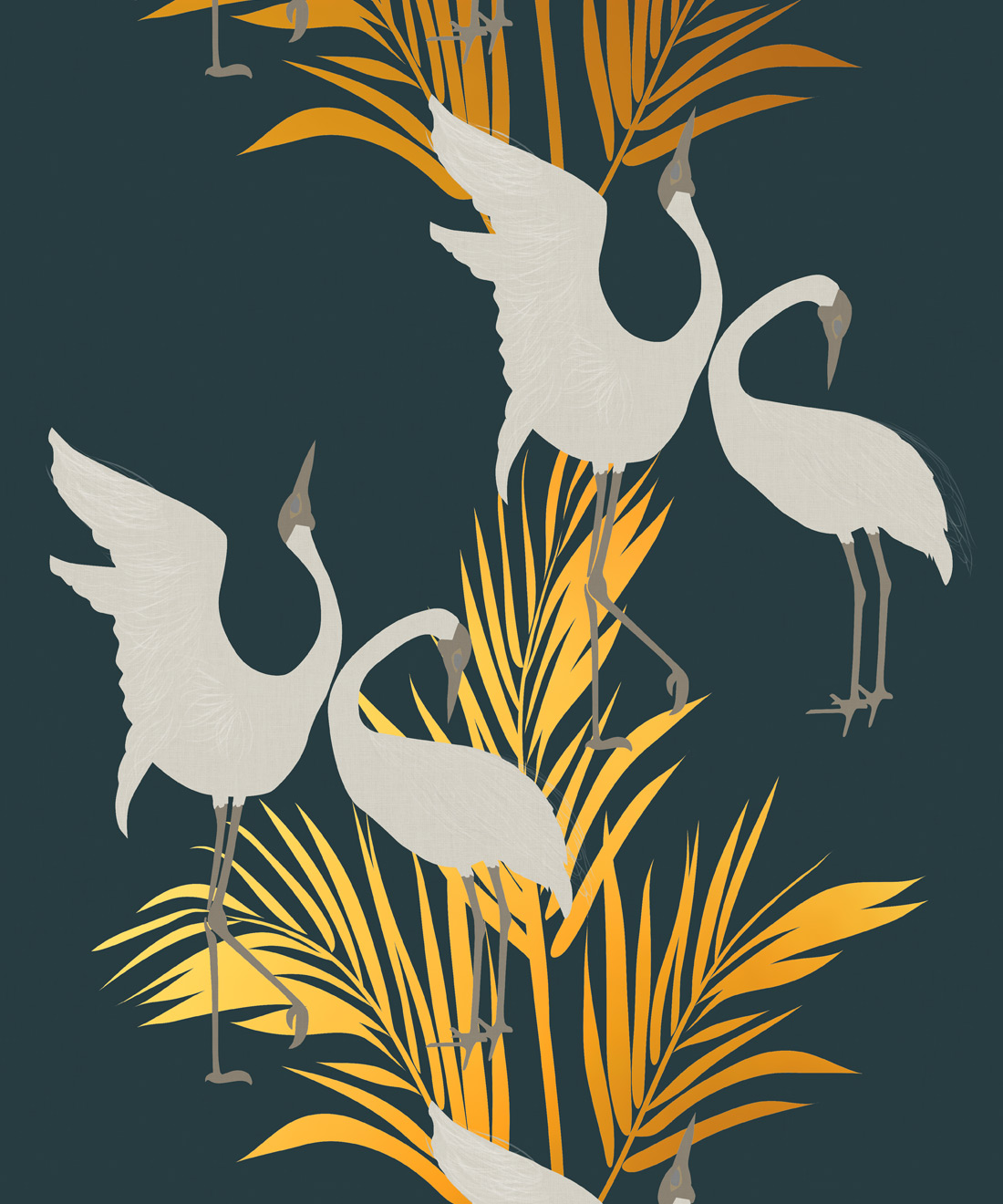 Sometimes referred to as the Australian Crane, Brolgas are tall, slender birds native to wetlands across Australia. Dancing Brolgas Wallpaper by Maeve Oliver is inspired by the birds’ iconic courtship dance, recreated in an Art Deco style. Finished with warm gold metallic detailing, the elegant birds and palm fronds make a striking addition to residential and commercial interiors.
