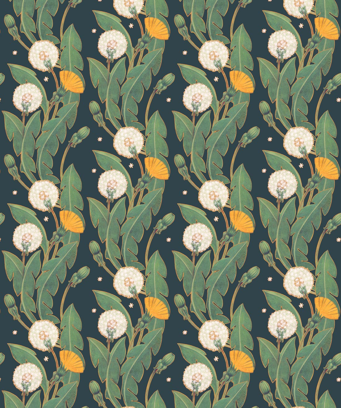 A wallpaper design that has a gorgeous floral trail of dandelions with vigorous curves of scrolling foliage. A rosette of leaves and large bright flowers followed by globular heads of seeds with downy tufts. Available in three unique colorways, this opulent wallpaper is the perfect companion for a classic interior. Manufactured on a hard wearing, non-woven wallpaper. This paste the wall product is perfect for domestic and commercial applications.