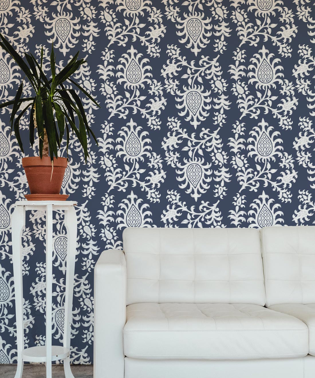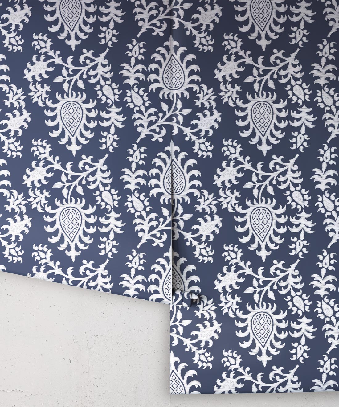Desert Eve wallpaper from Maeve Oliver’s Auchenflower collection features arabesque style artwork with interlacing foliage reminiscent of 9th Century Islamic art. The rhythmic qualities of the interwoven vines and florals will make your interiors feel more open and inviting. A decorative design that combines classic artwork with modern colors, Desert Eve is available in four colours: light blue, olive green, navy and muted gold.