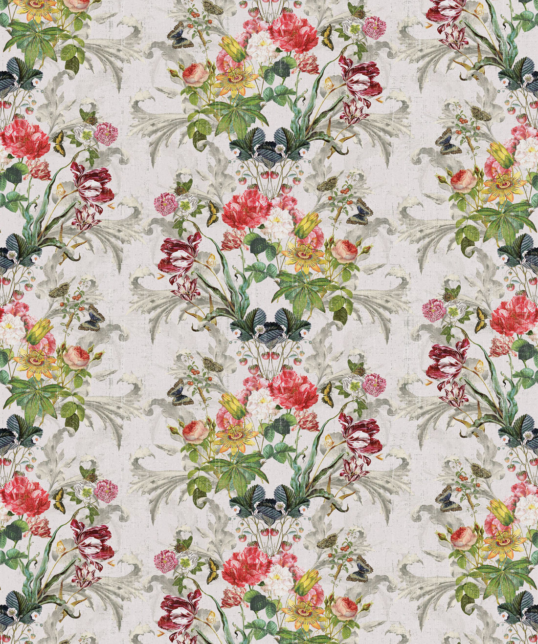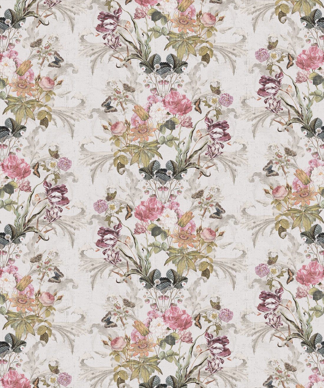 Delightfully romantic with nostalgic echoes of visits to country gardens and parks of times past. This design is gentle, romantic and would instantly fill a room with floral beauty and butterflies. This imagery is reminiscent of a giddy springtime day, fun, light and airy with lots of excitement and possibilities to come. Luxurious in its simplicity this palette of delicate Colors and uplifting hues will brighten any space, from small and intimate to open spaces hosting large events, perfect for celebrations. Multiple meanings have been attributed to flowers for thousands of years throughout Europe, Asia and the Middle East. Floral blooms, foliage, plants and specific arrangements were used to send a coded messages to special recipients, allowing the sender to express feelings which could not be spoken aloud in polite Victorian society. A romantic floral wallpaper sure to enliven any room.
