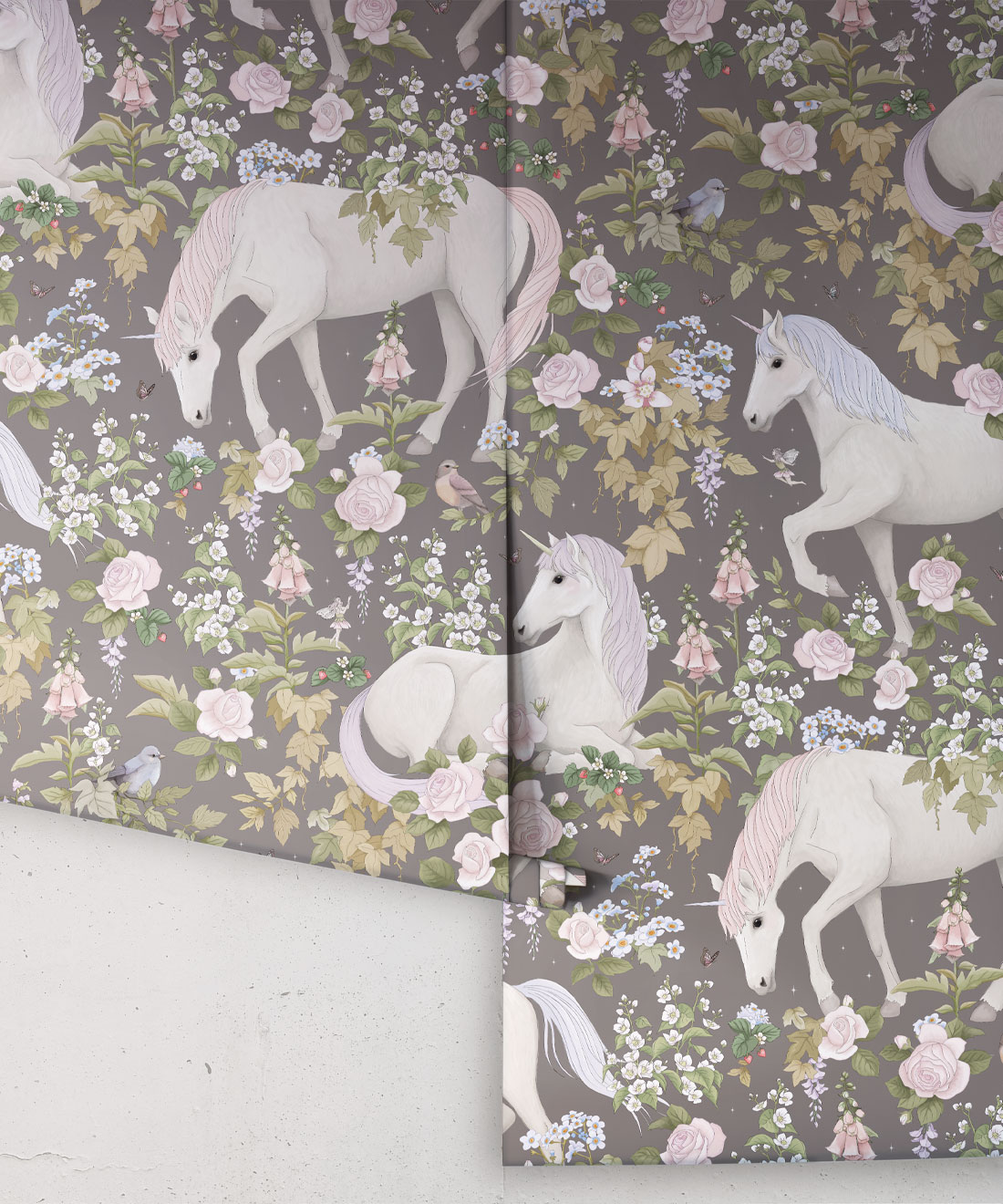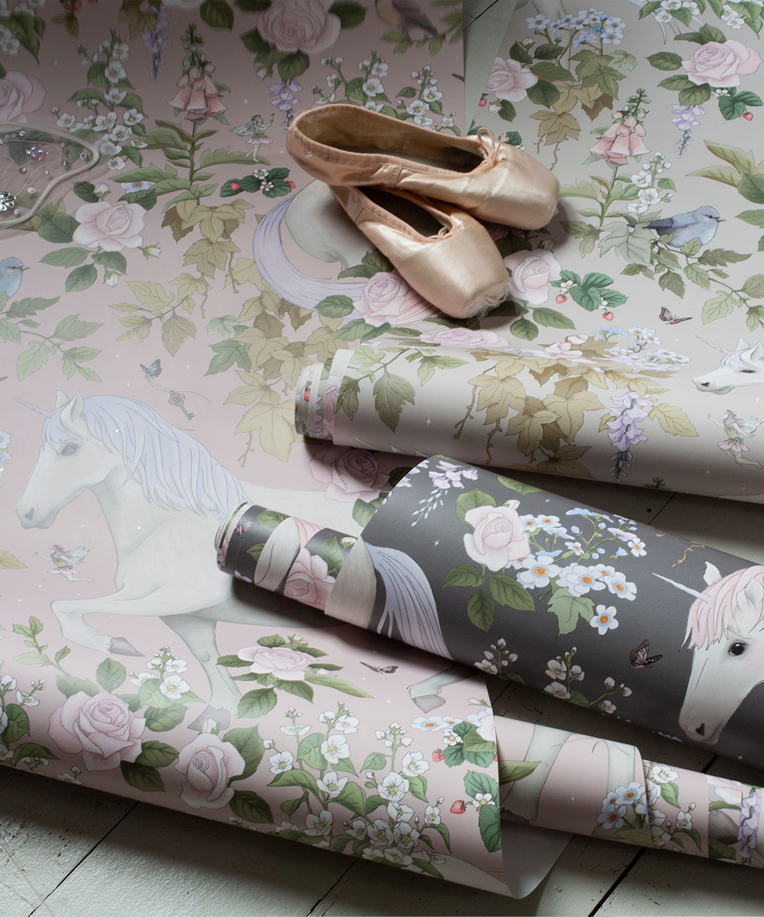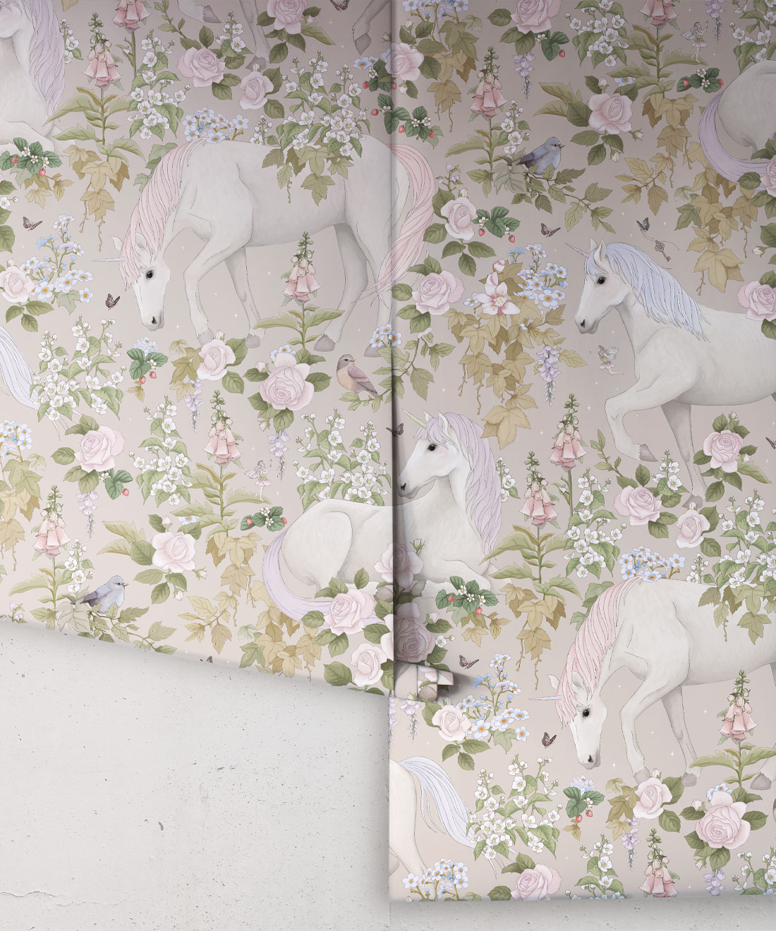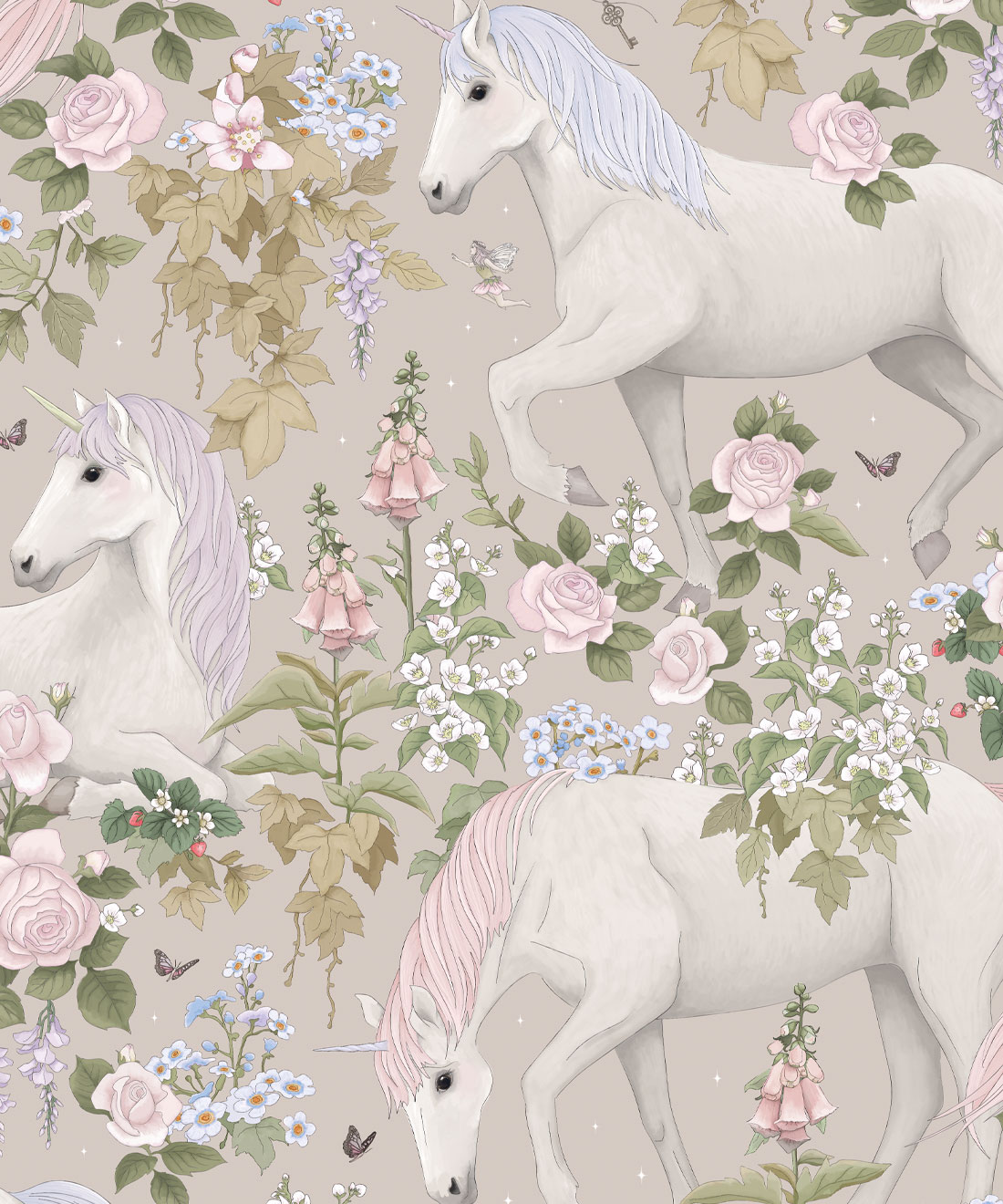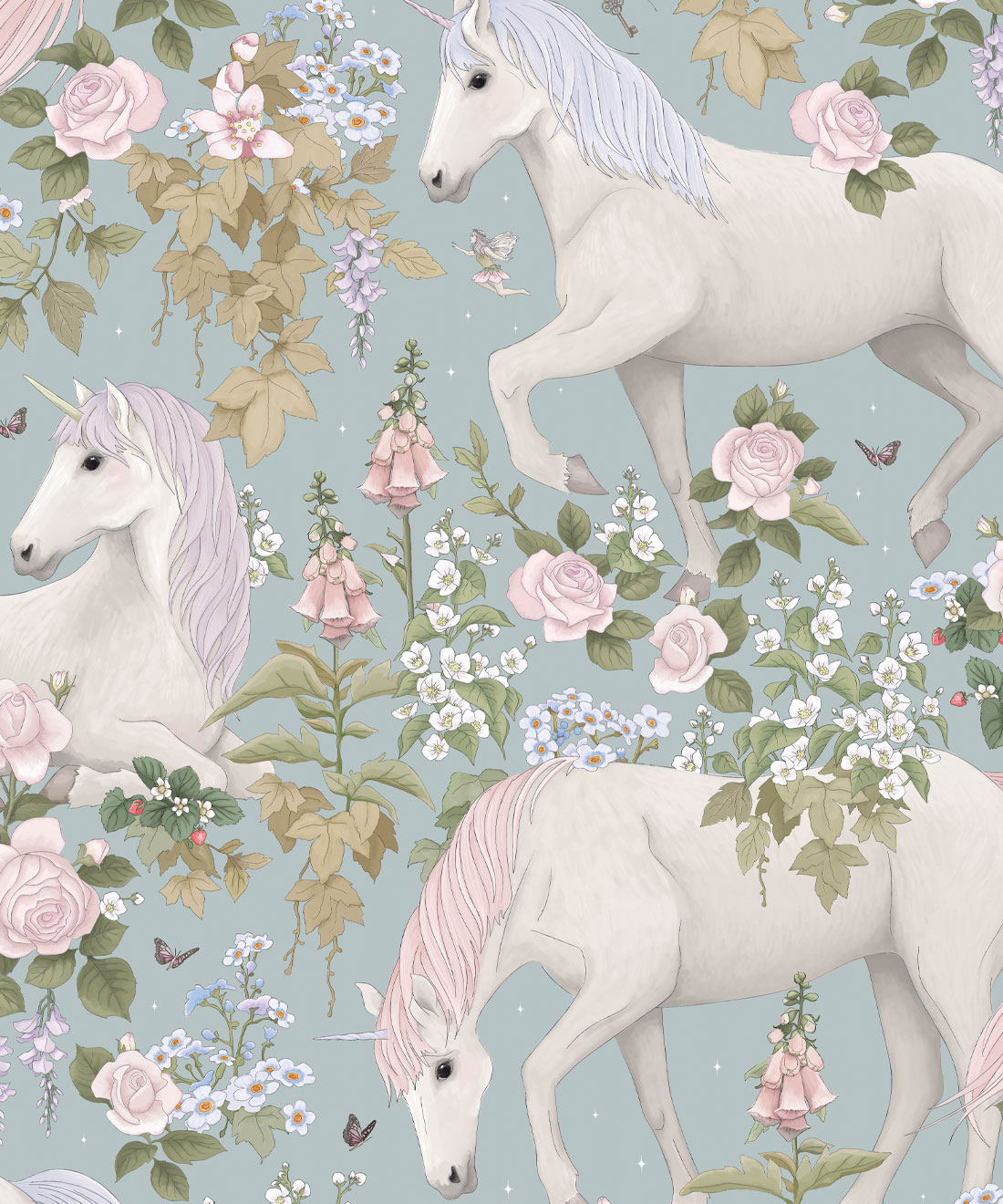 Come away to a magical land where gentle unicorns live amongst a dreamy garden setting, filled with butterflies, fairies, climbing roses, wisteria, playful forget-me-nots, gorgeous little strawberry plants, foxgloves, and blossoms from the beautiful mock orange tree. Woven into the Field of Dreams Wallpaper artwork is precious details to be discovered, including tiny garden fairies and a delicate butterfly carrying away a magical key. With whispering pinks, gentle dusty greens and delicate cornflower blues twirling around the soft neutral tones of the peaceful unicorns, the Field of Dreams collection creates a calm and comforting atmosphere.