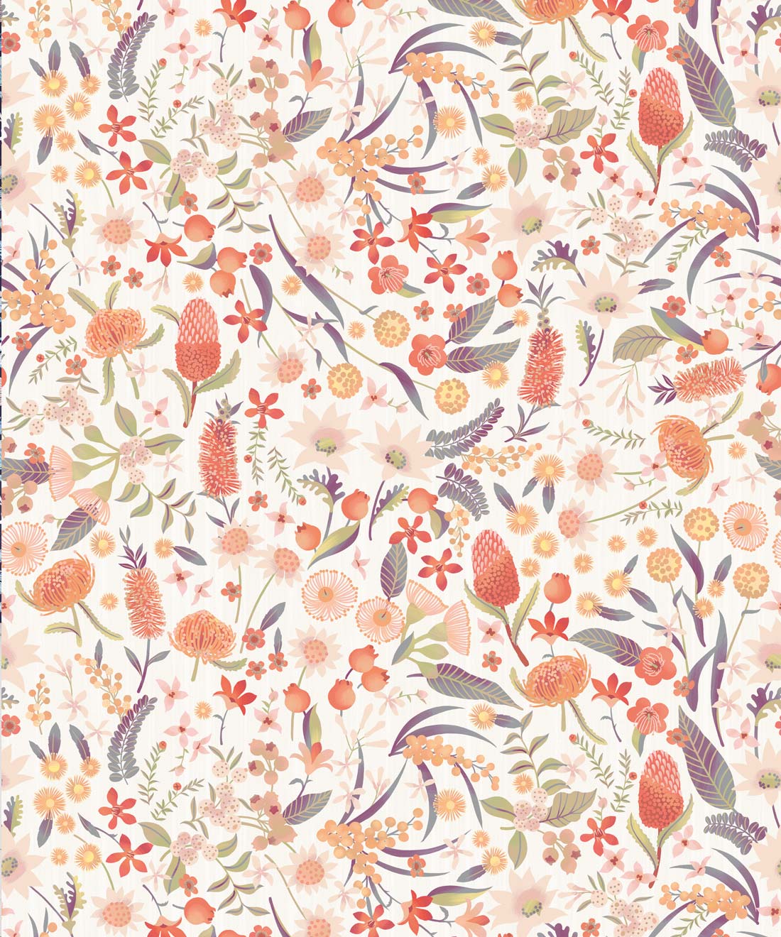 Forest Floral is a rich, full, floral wallpaper design, featuring a smorgasbord of stunning Australian native flowers. With an intricate interlocking pattern and organic, flowing composition, its effect is dramatic. You’ll find Banksias, Flannel Flowers, Bottlebrush, Wattle, Gum Blossoms, and Christmas Bush, to name just a few of the flowers in this lush design. Combining a modern aesthetic with a hint of folk, Forest Floral will work in a wide variety of spaces. With numerous color palettes to choose from, you will find something perfect for your space.