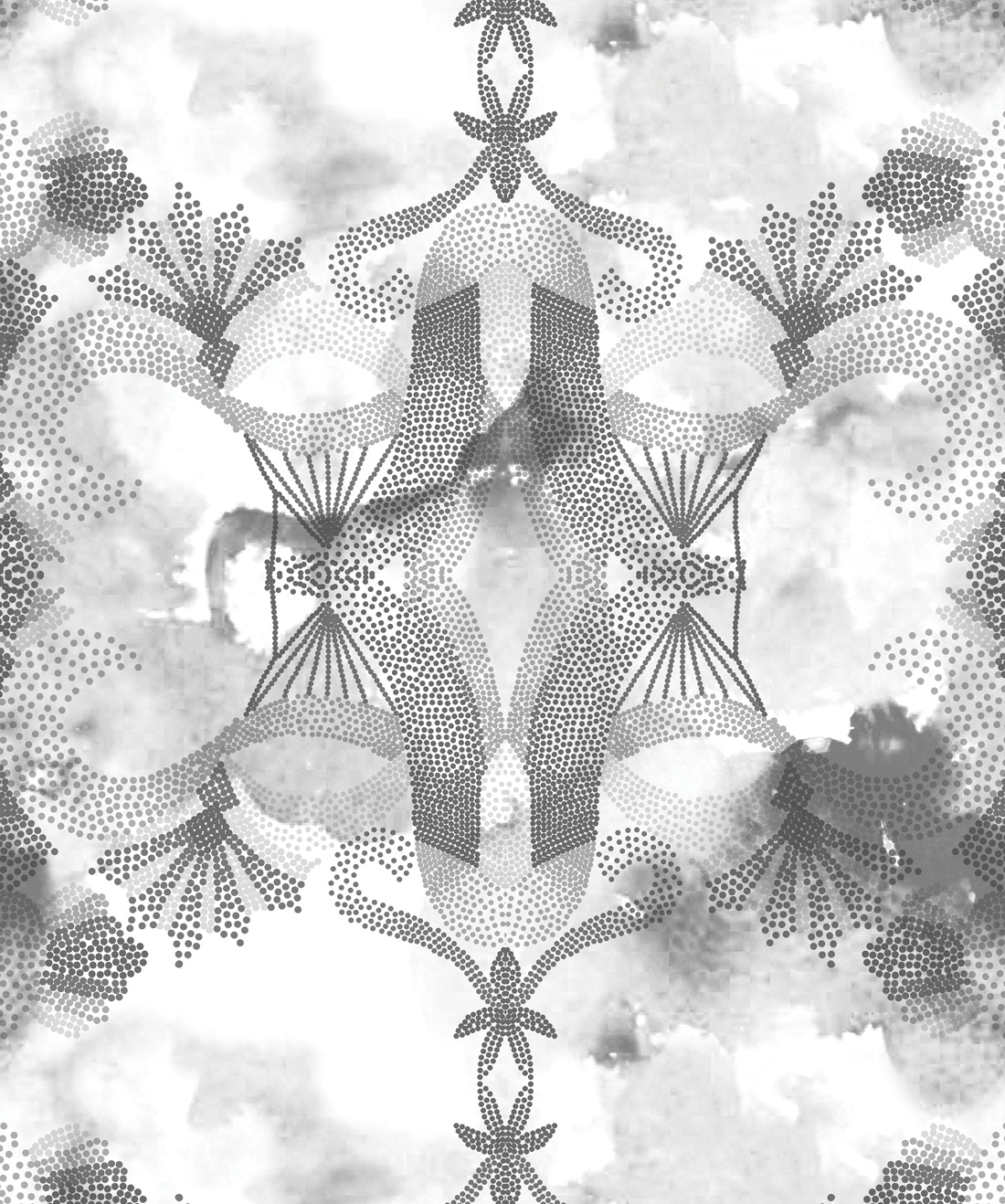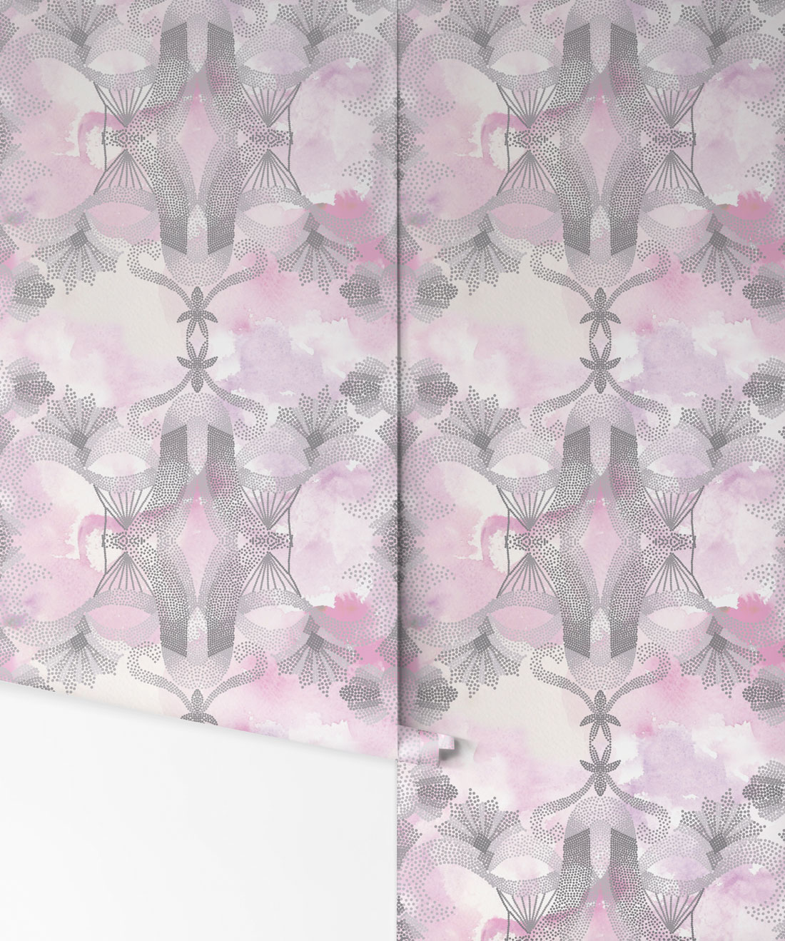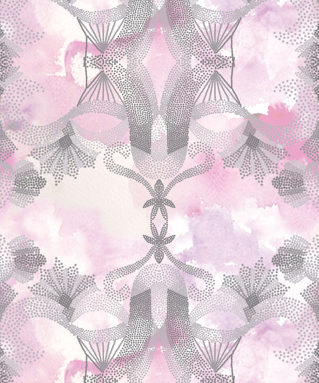 A 1920s abstract wallpaper frieze by the Sydney Wallpaper and Decorating Company ‘Morrisons’ has been the inspiration for the Ella and Sofia ‘Gadara’ design. Black charcoal and white forms the structure of the Gadara design and provides both a masculine and feminine feel. The dots represent a pathway from our history to the present day. A pink color way has been incorporated to soften the design and resemble the nouveau style of the original piece from which it was inspired.