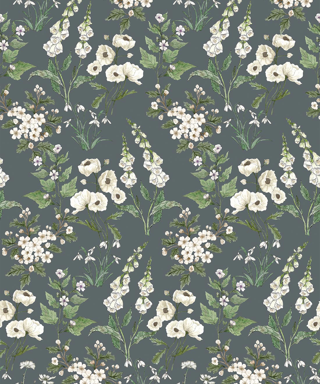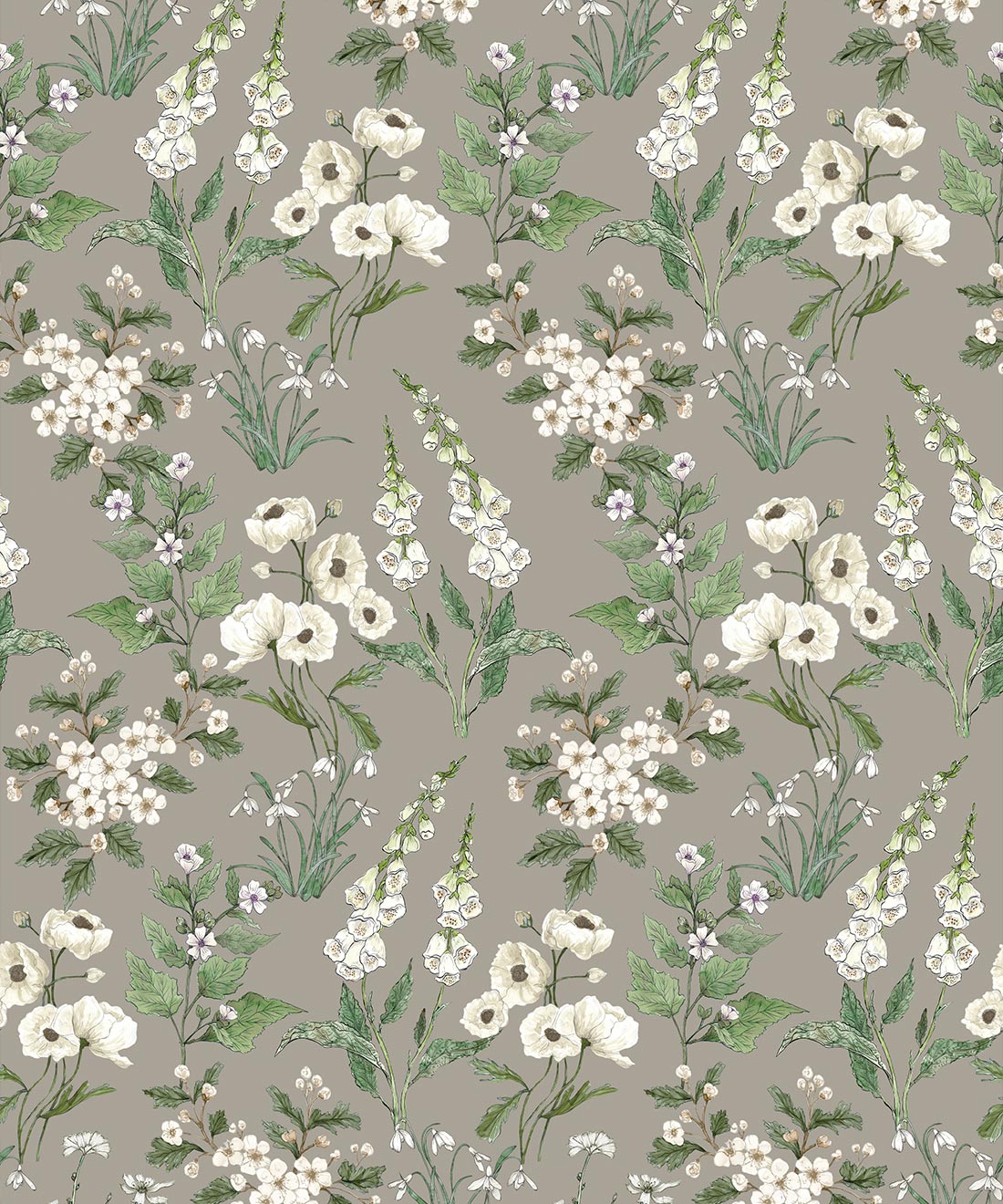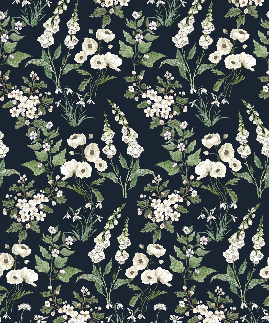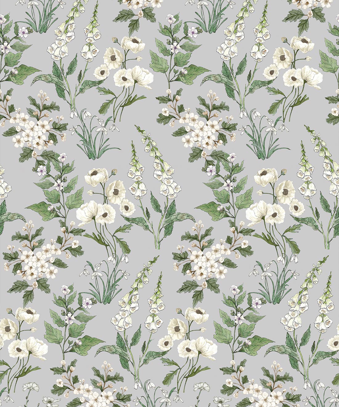 The enchanting Garden Delight design shows a delicate interplay of moonlit whites and subtle cream floral motifs creating a serene design that evokes a sense of calm and purity. Poppies, foxgloves, hawthorn blossoms, snowdrops and mallows are just some of the botanical elements delicately illustrated in this design bringing the essence of a moonlit garden indoors. The timeless elegance and neutral tones make it a versatile choice for any room, providing a canvas for both modern and classic styles.