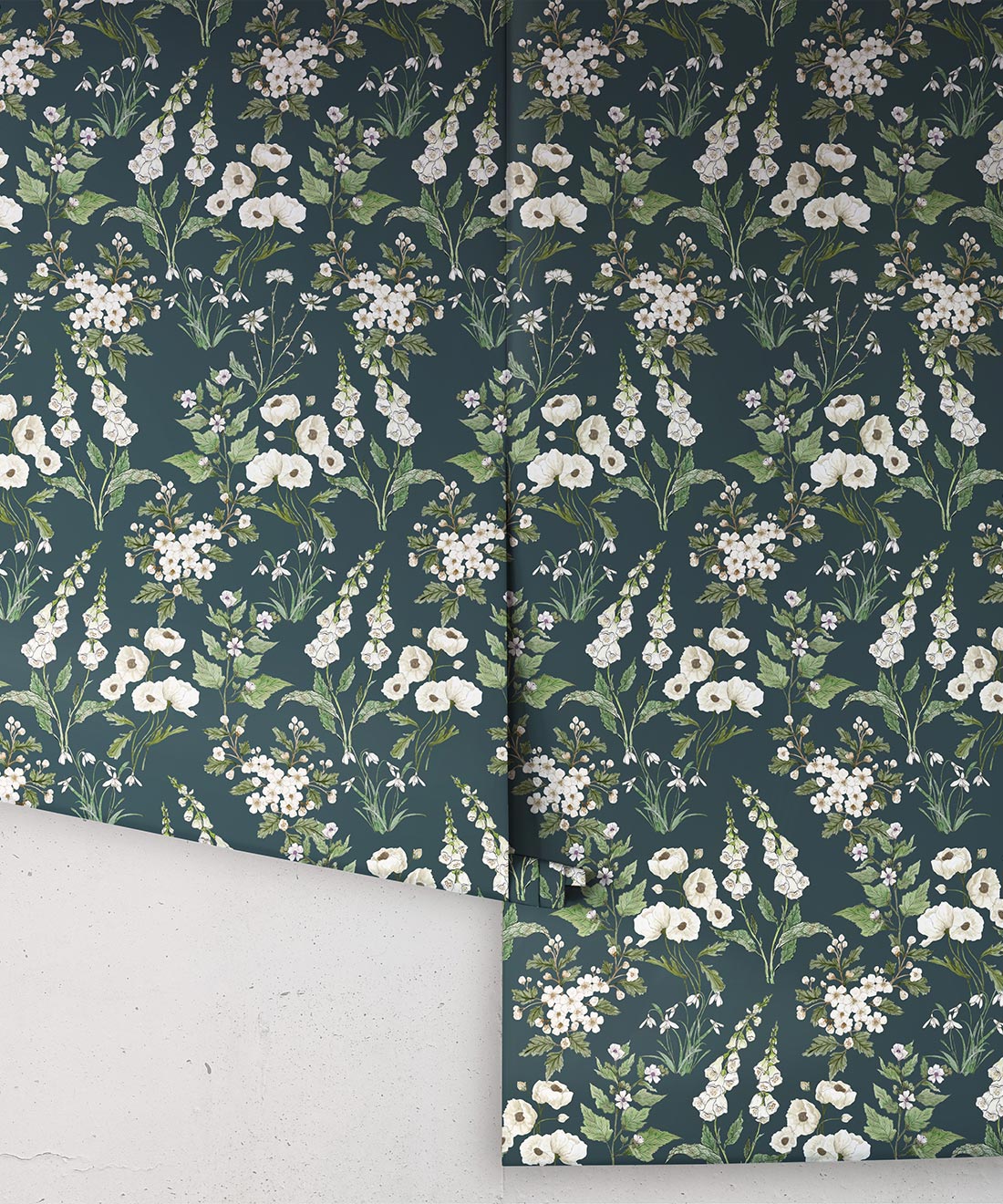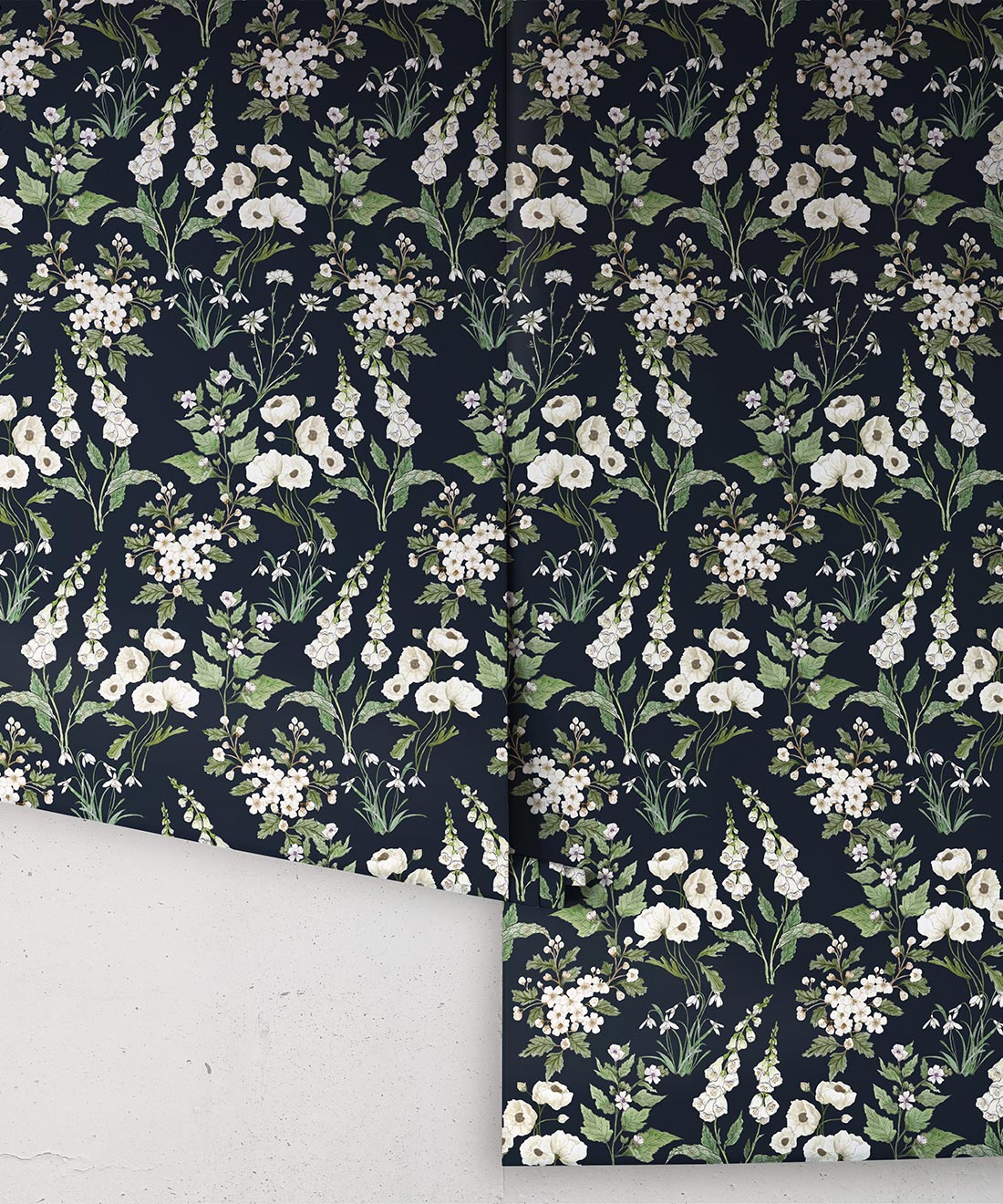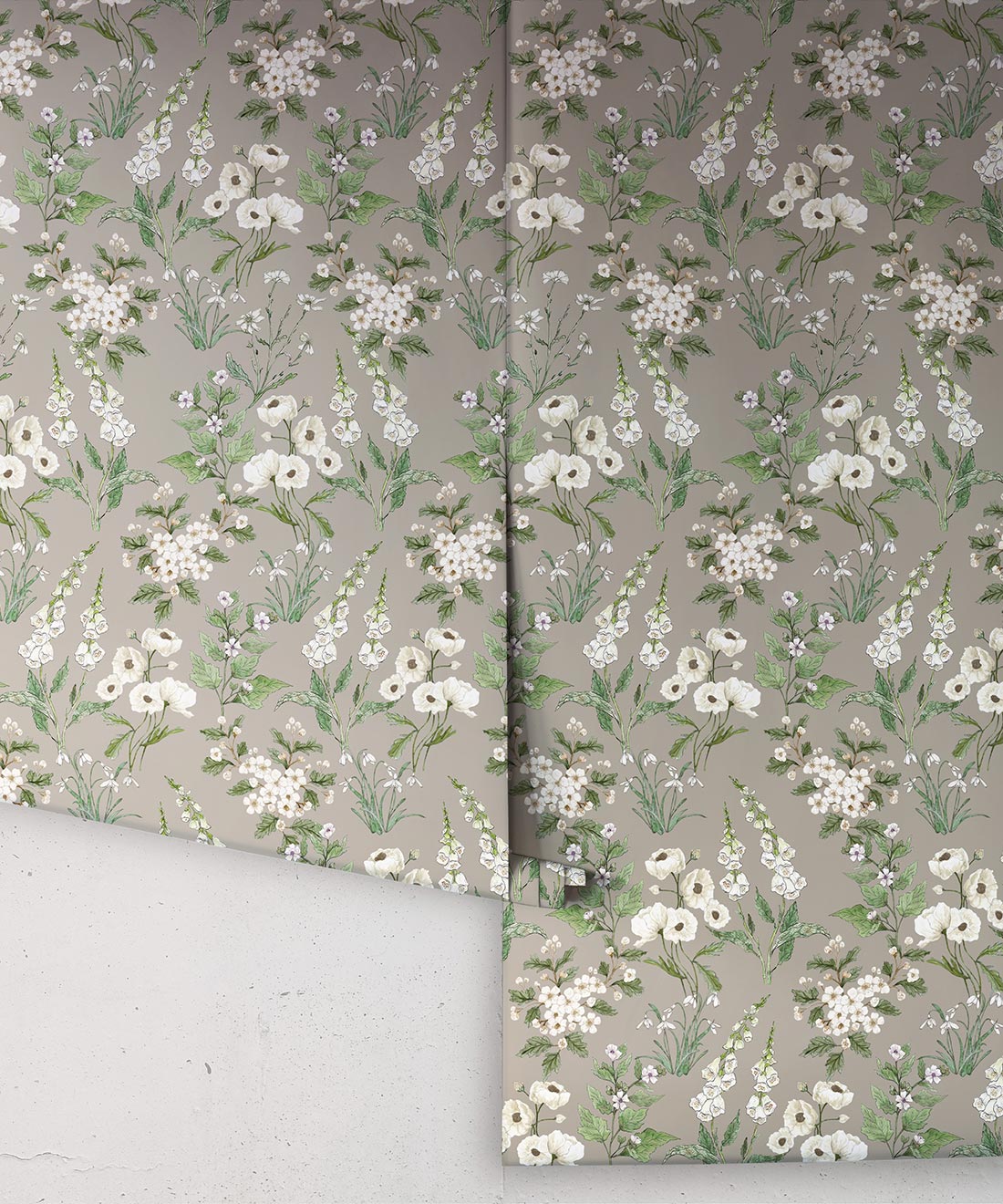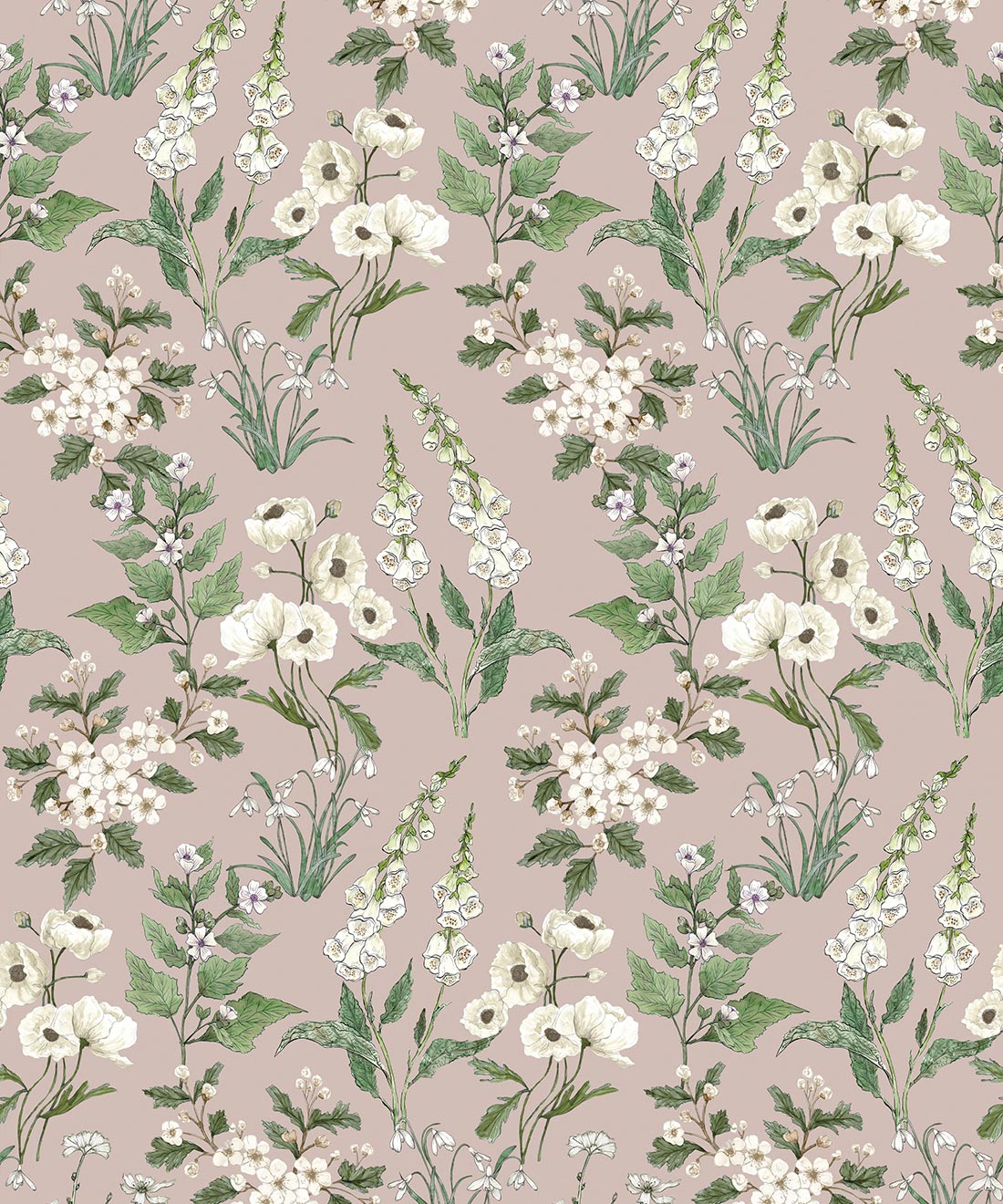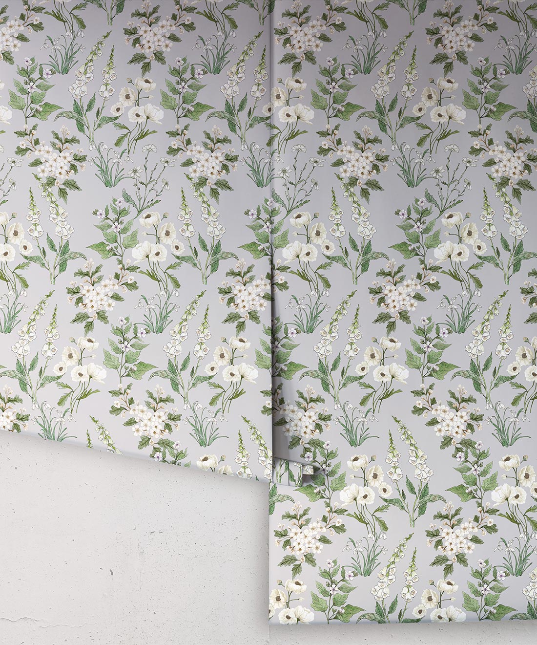 The enchanting Garden Delight design shows a delicate interplay of moonlit whites and subtle cream floral motifs creating a serene design that evokes a sense of calm and purity. Poppies, foxgloves, hawthorn blossoms, snowdrops and mallows are just some of the botanical elements delicately illustrated in this design bringing the essence of a moonlit garden indoors. The timeless elegance and neutral tones make it a versatile choice for any room, providing a canvas for both modern and classic styles.