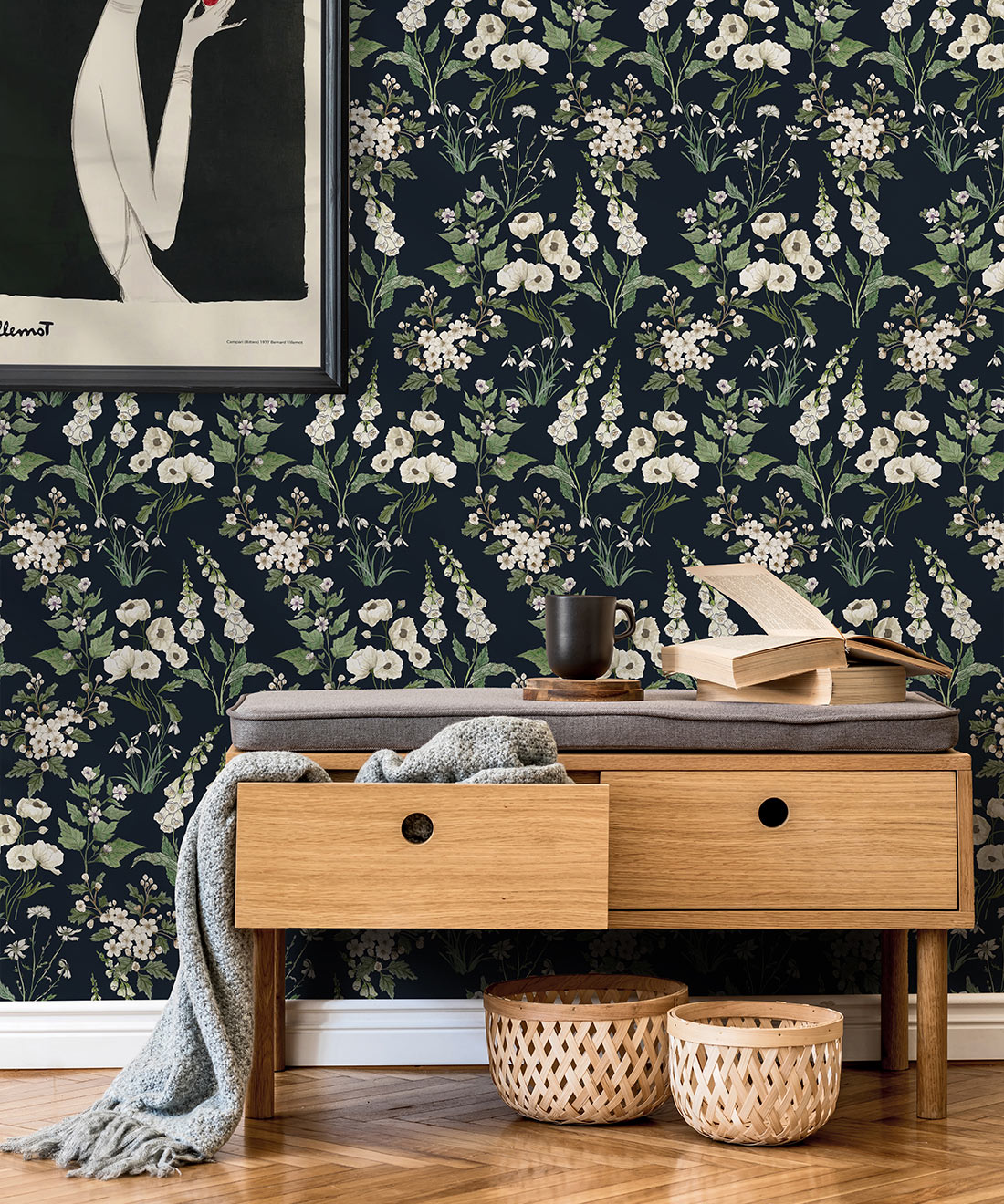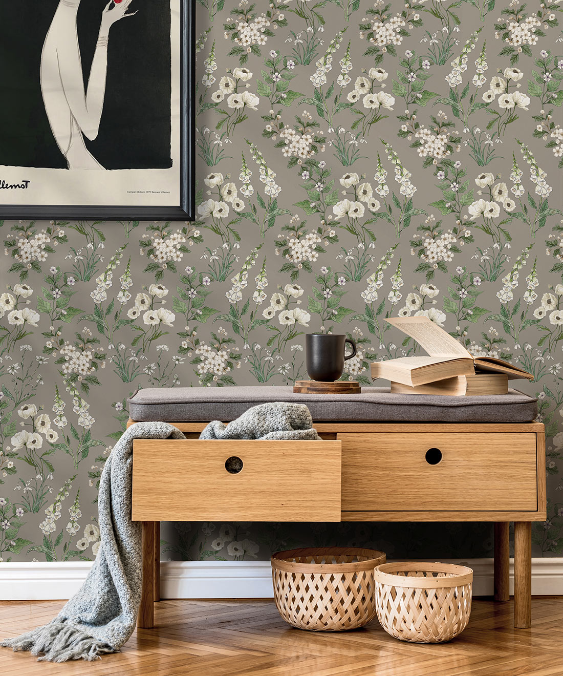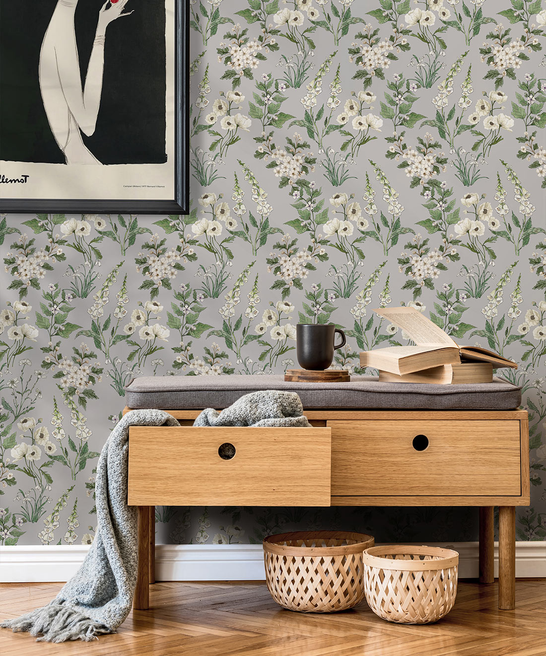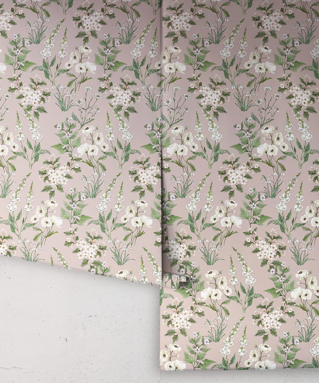 The enchanting Garden Delight design shows a delicate interplay of moonlit whites and subtle cream floral motifs creating a serene design that evokes a sense of calm and purity. Poppies, foxgloves, hawthorn blossoms, snowdrops and mallows are just some of the botanical elements delicately illustrated in this design bringing the essence of a moonlit garden indoors. The timeless elegance and neutral tones make it a versatile choice for any room, providing a canvas for both modern and classic styles.