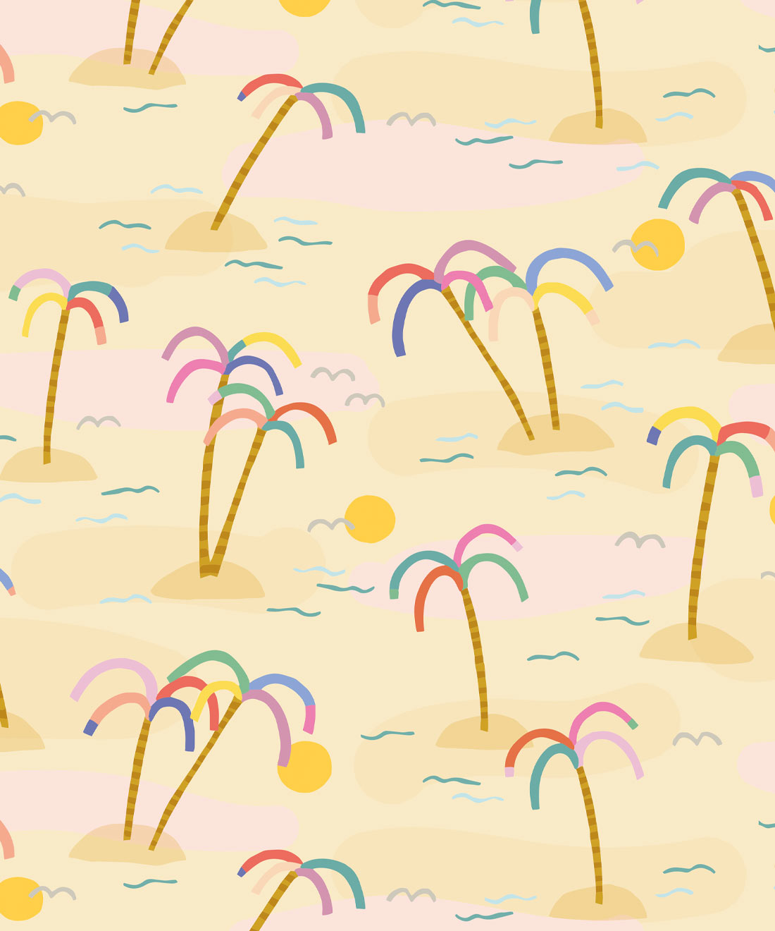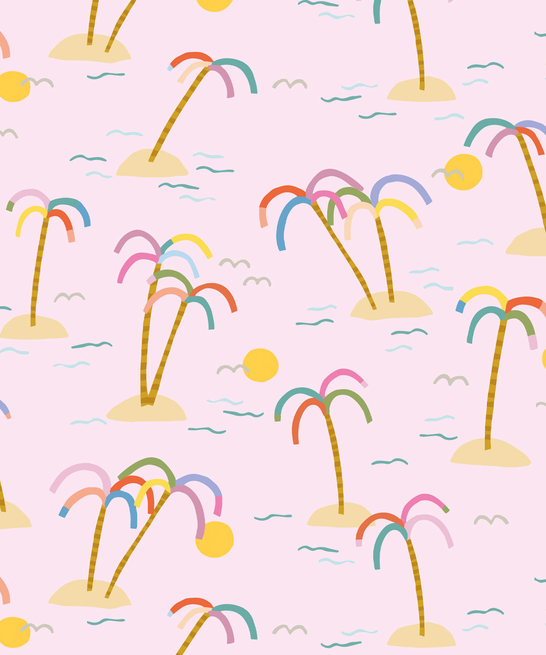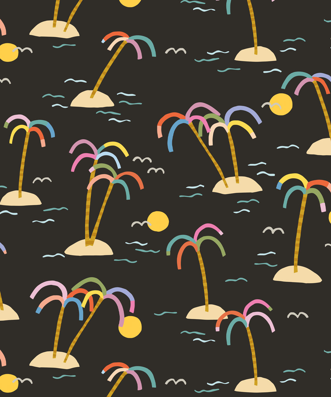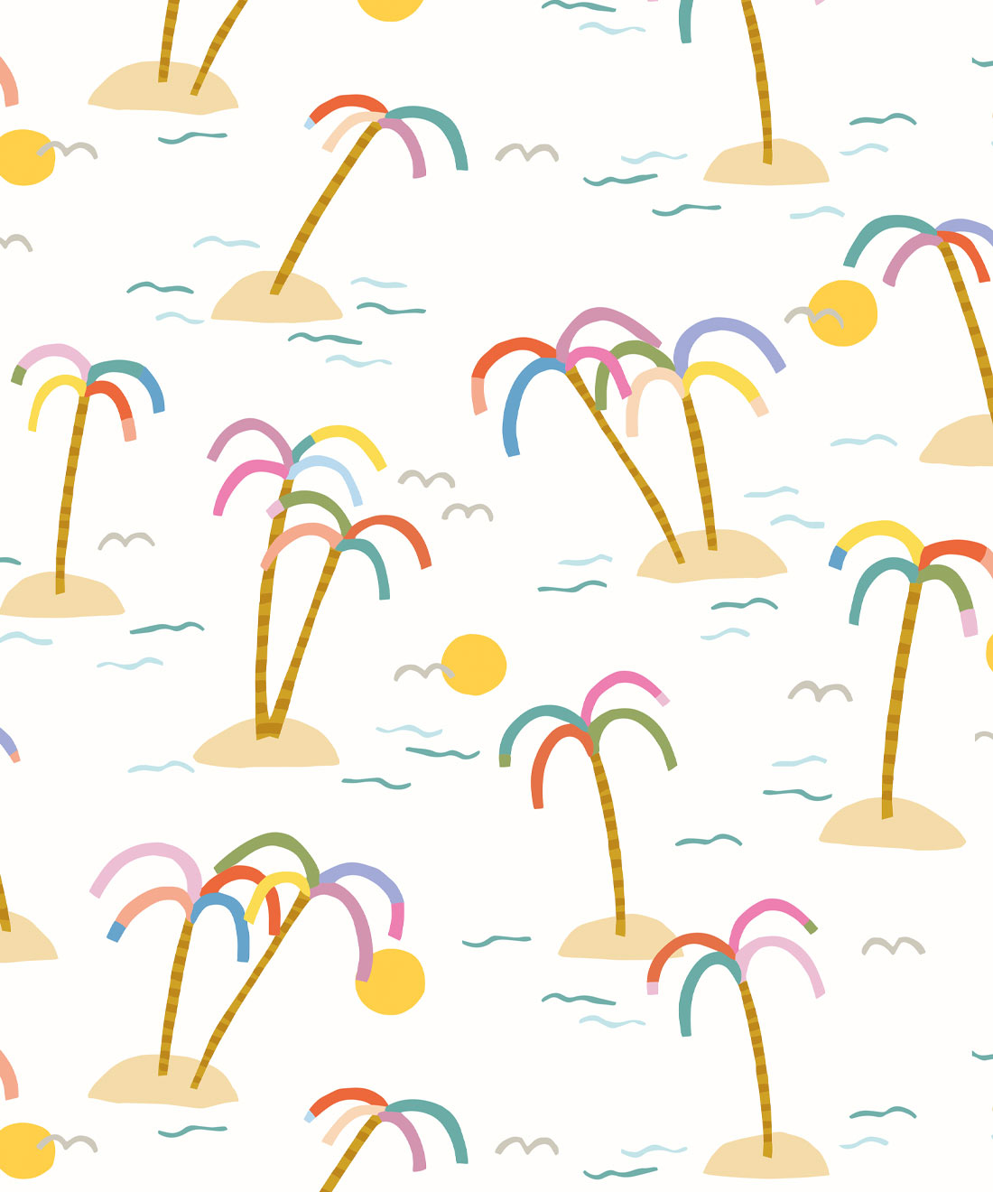 Happy like a Holiday from Brook Gossen is a modern and playful tropical island wallpaper print. This isn’t your traditional palm tree design, but rather a pattern that evokes happy times by the beach.