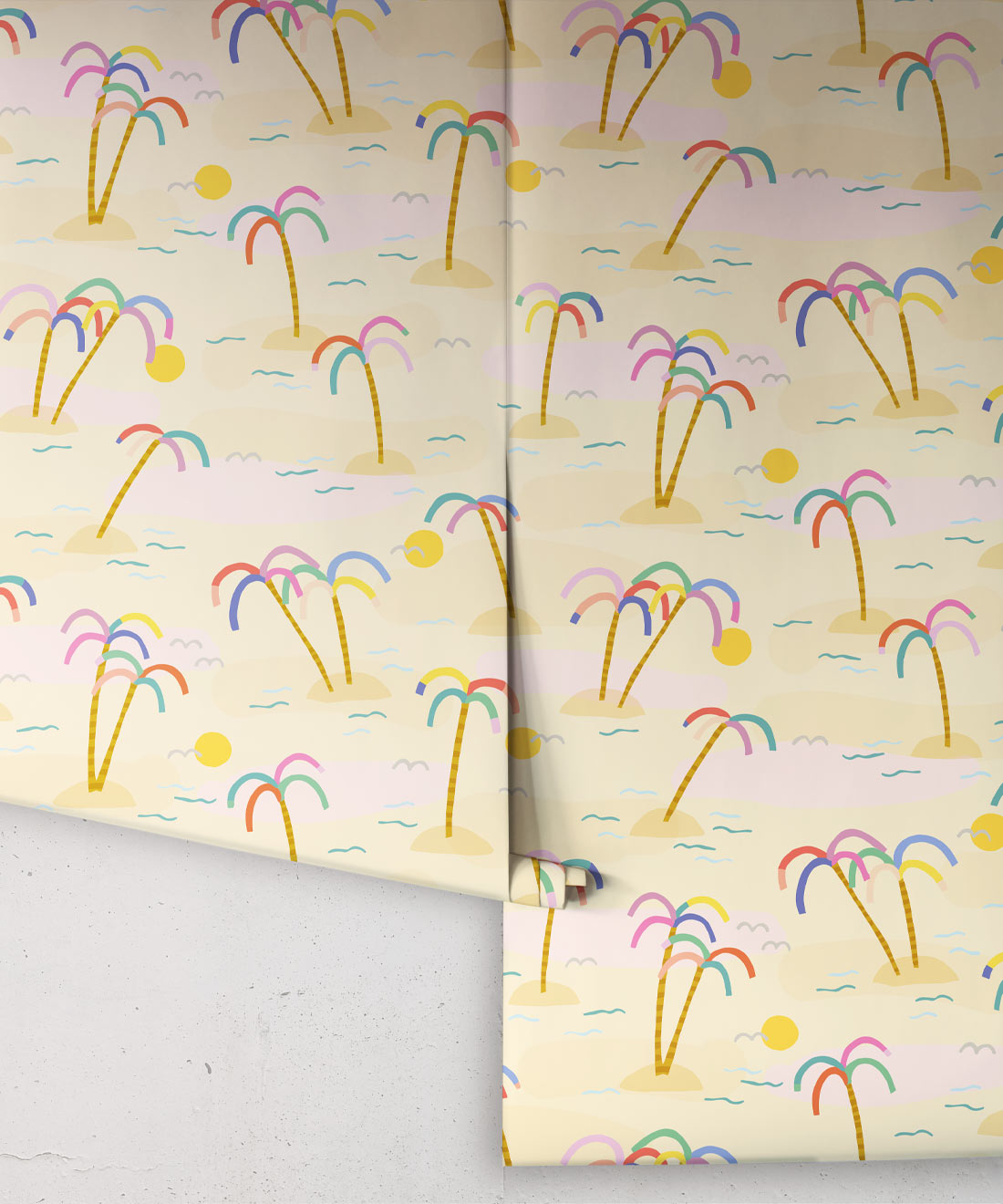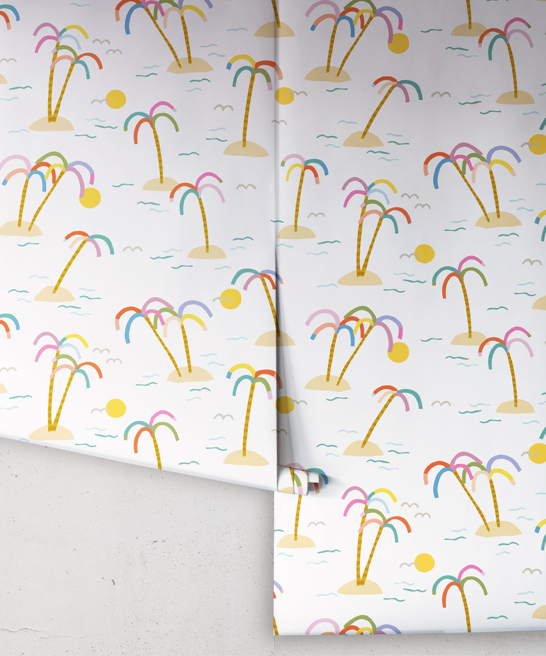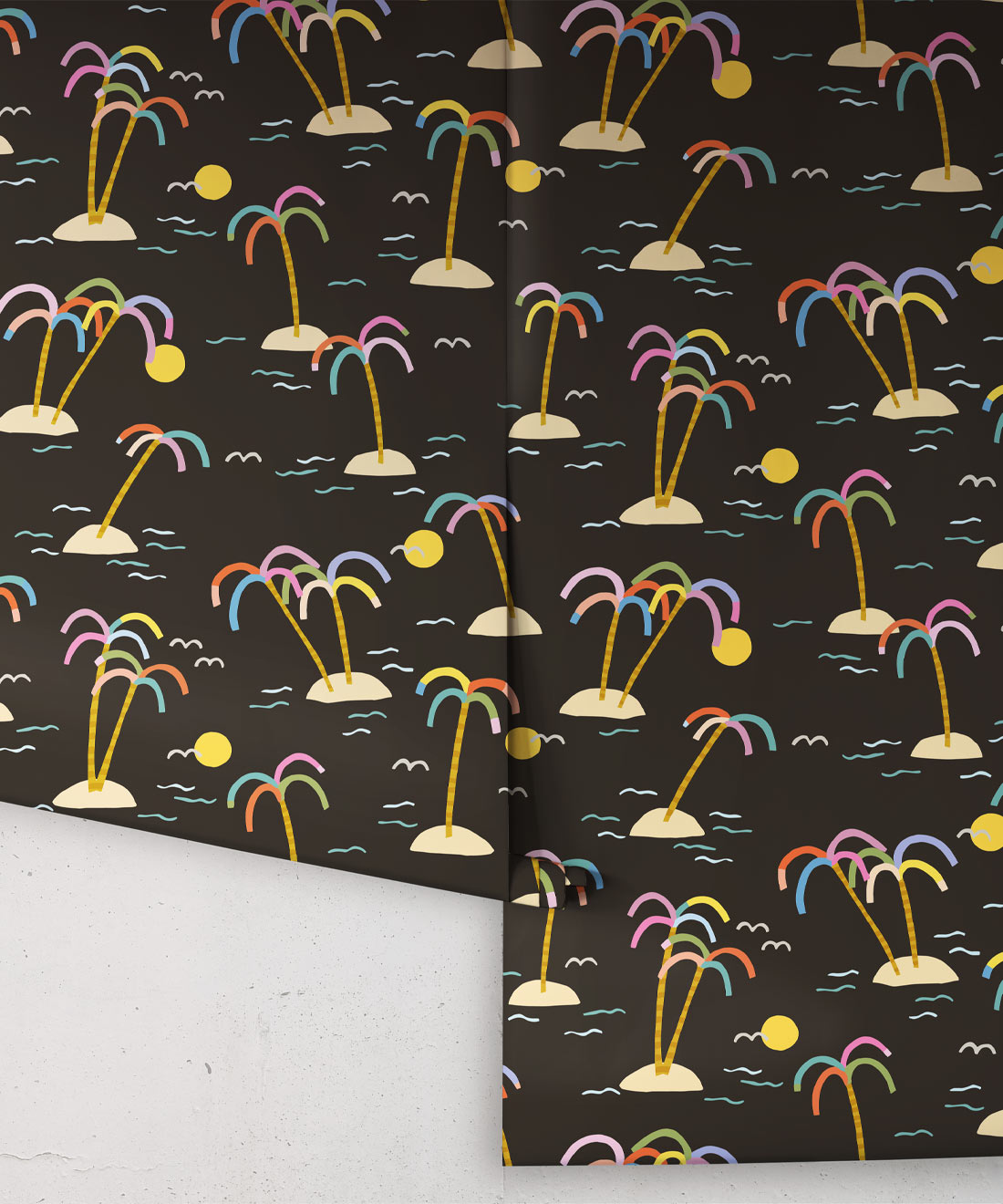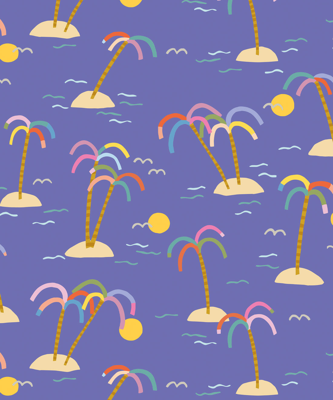 Happy like a Holiday from Brook Gossen is a modern and playful tropical island wallpaper print. This isn’t your traditional palm tree design, but rather a pattern that evokes happy times by the beach.