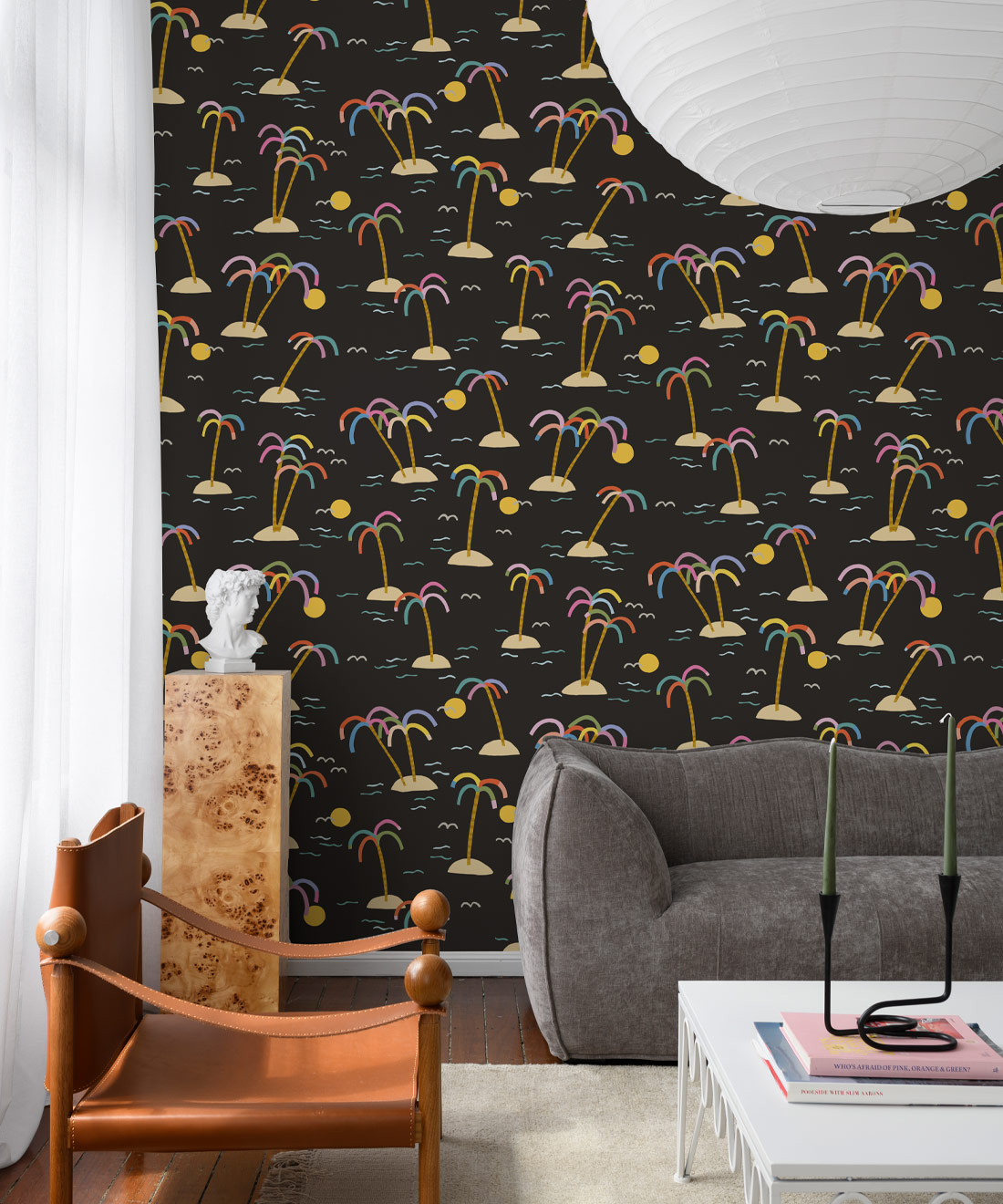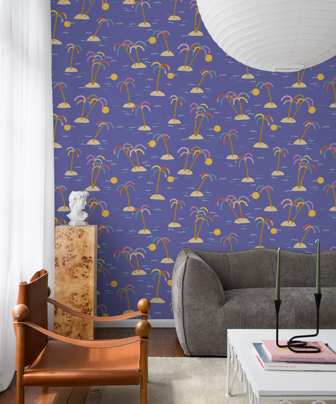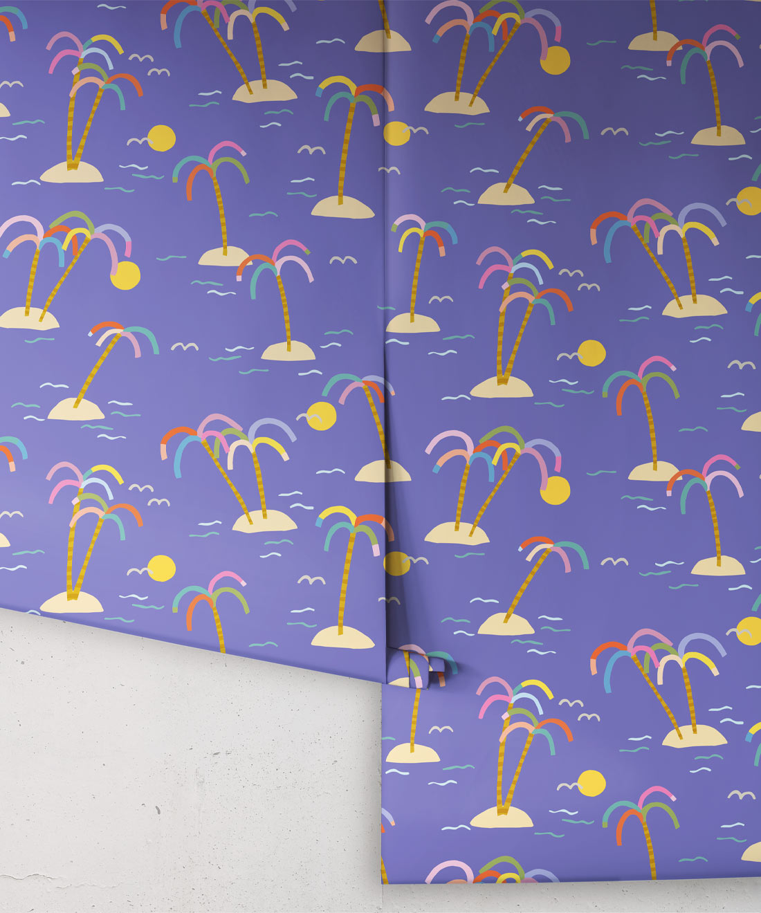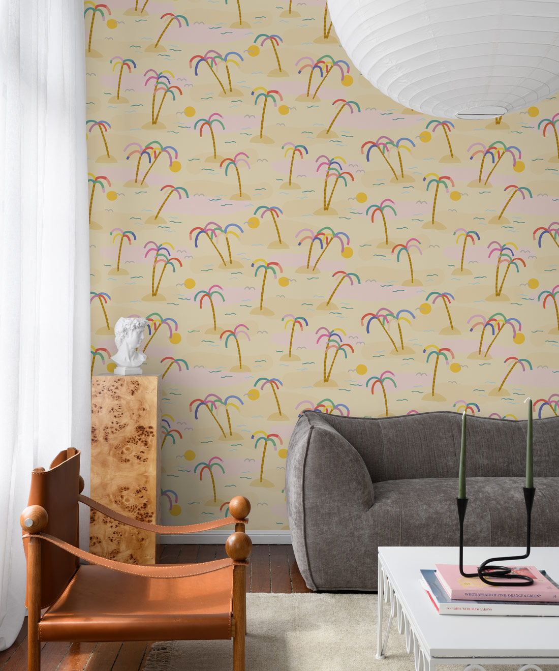 Happy like a Holiday from Brook Gossen is a modern and playful tropical island wallpaper print. This isn’t your traditional palm tree design, but rather a pattern that evokes happy times by the beach.