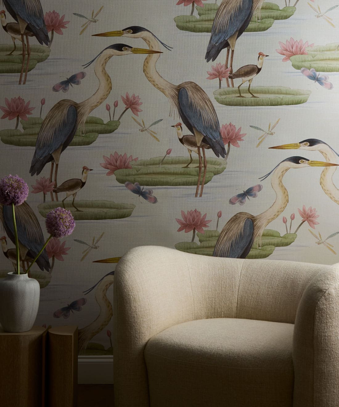 Inspired by travels to the Amazon Rainforest, the Heron, Jacana & Giant Lilypad Grasscloth wallpaper is an exploration of natural beauty. Jacana and insects frolic on giant lilypads, while majestic herons stand firm in the gently flowing water.