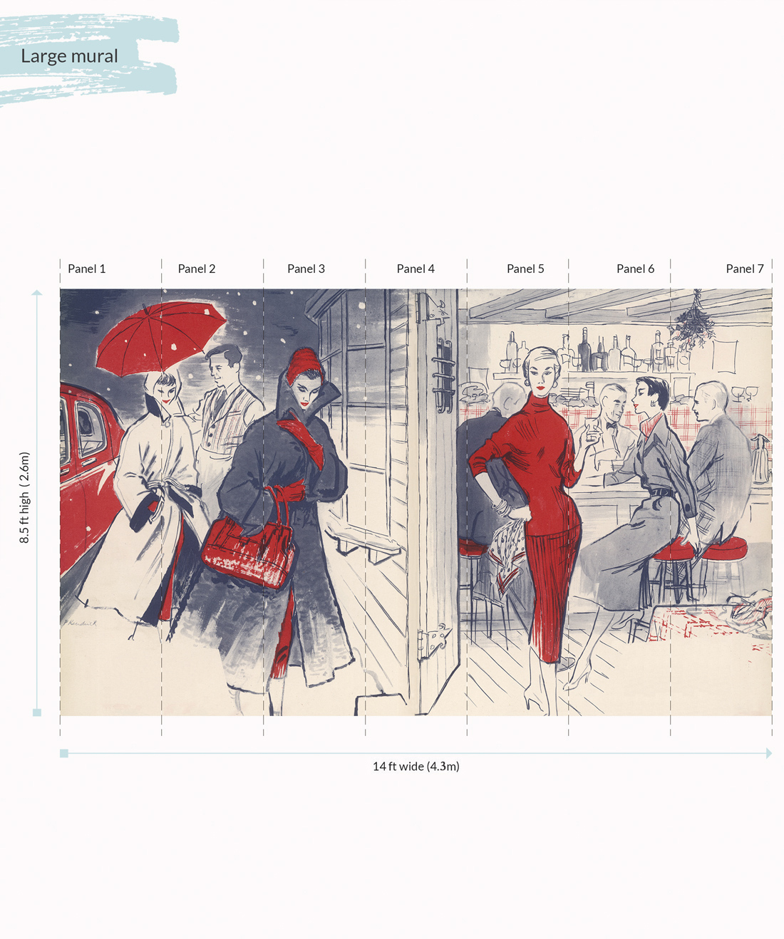 In this illustrated retro mural, fashionable friends and acquaintances congregate for a night cap, a good way to escape the inclement weather and show off your latest fashions. A awesome wall mural that looks like it is from the cover of Vogue.