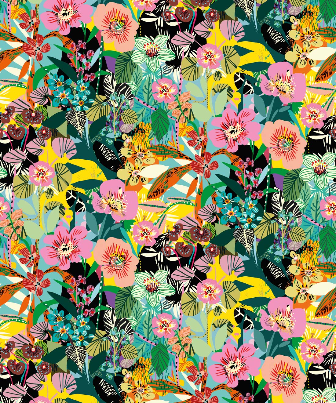 Jardin de Fleurs Wallpaper “Garden of Flowers” is a new and eccentric design from Kitty McCall. This wallpaper print invites you to travel to a luscious french landscape filled with a variety of stylized foliage and flowers. Created to bring the beauty of nature to your home, hot bright pops of color contrast beautifully against the dark and rich backdrop, developed from original drawings and translated digitally. The joyful color palette will bring instant life to any room.