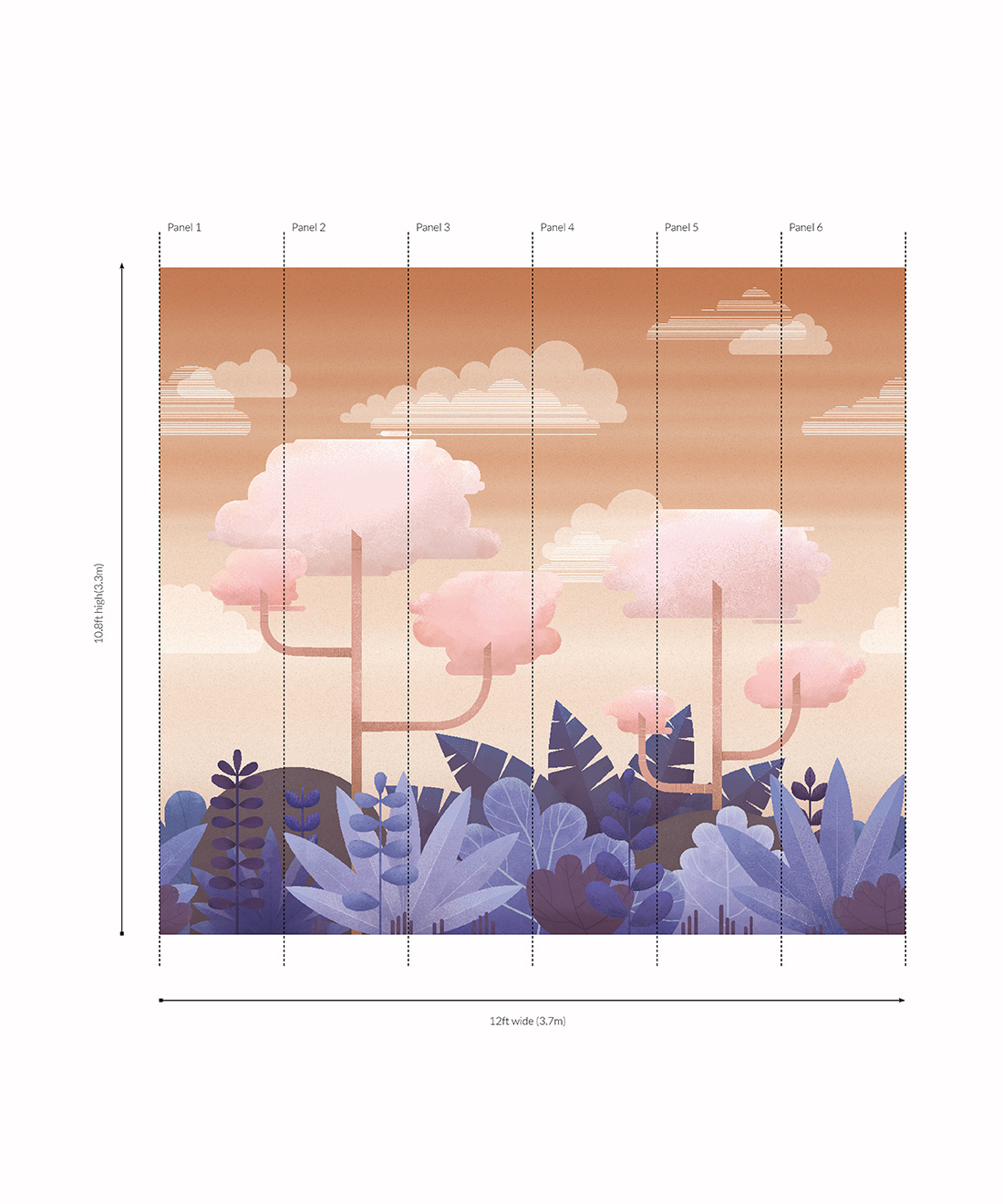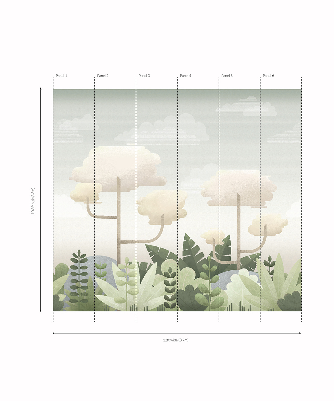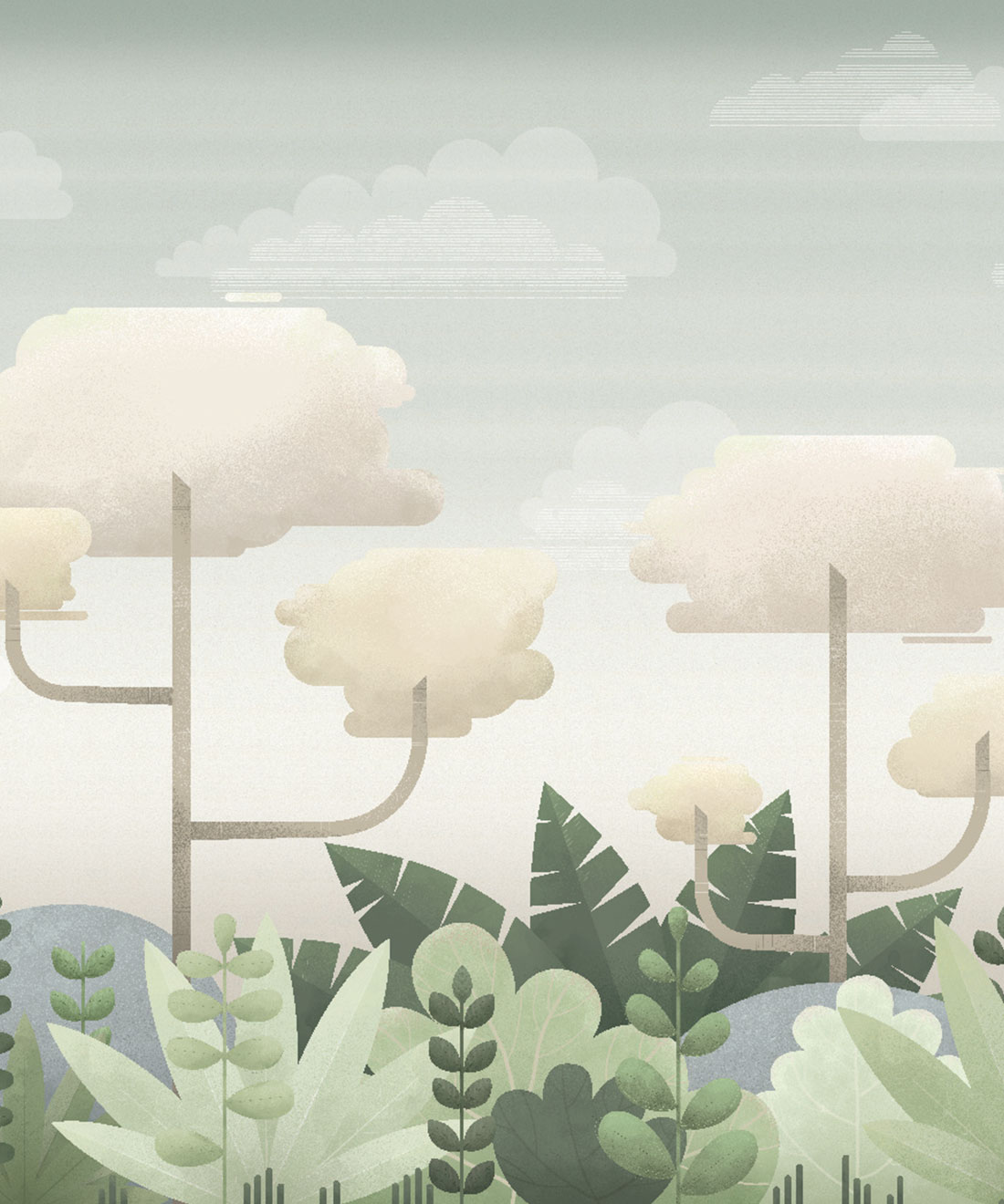 The Jungle Mural originated as a nursery wall mural hand-painted by artist Mairead Murphy. The simple forms and color palette provide a full and beautiful world at first glance, while the depth of texture and detailed linework reveal the intricacy of the image when viewed more closely. Created in two distinct colorways, a pastel-hued jungle with a serene cloudy sky and a deep, dusky foliage with a sunset sky both weave a tale of playful wonders and delightful adventures.