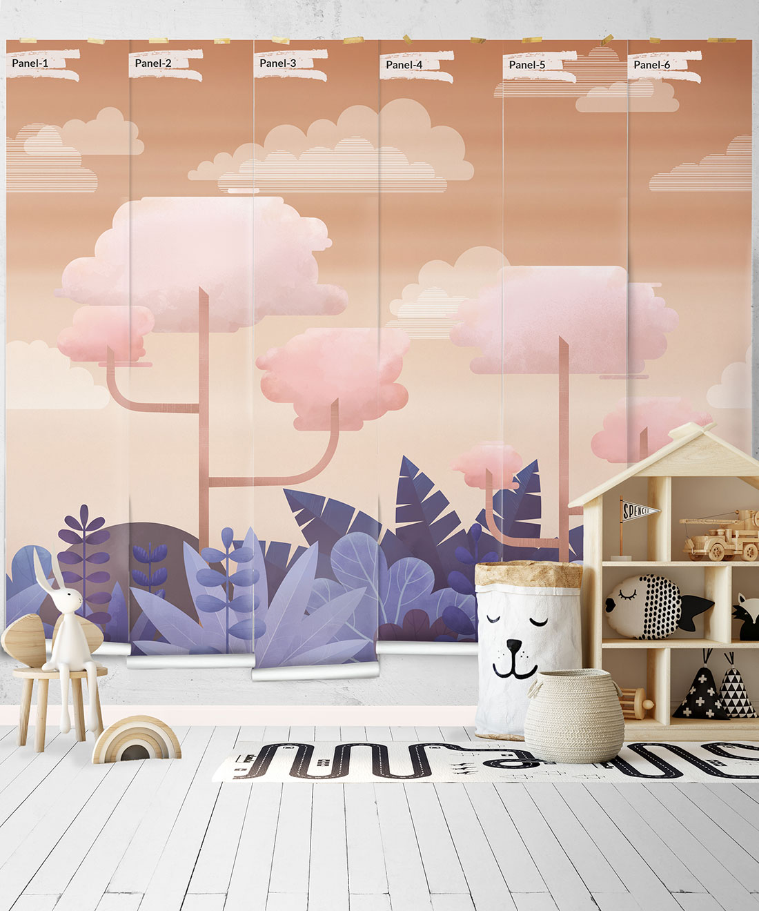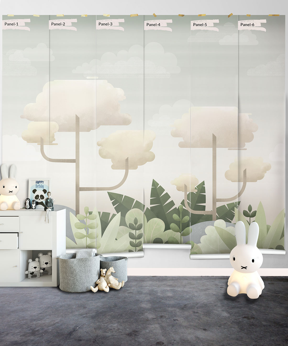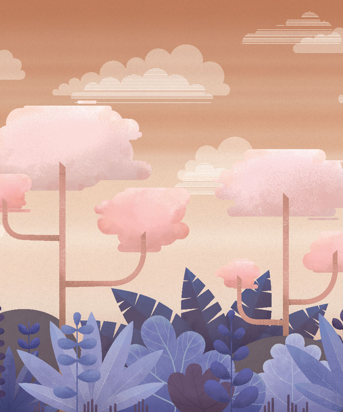 The Jungle Mural originated as a nursery wall mural hand-painted by artist Mairead Murphy. The simple forms and color palette provide a full and beautiful world at first glance, while the depth of texture and detailed linework reveal the intricacy of the image when viewed more closely. Created in two distinct colorways, a pastel-hued jungle with a serene cloudy sky and a deep, dusky foliage with a sunset sky both weave a tale of playful wonders and delightful adventures.