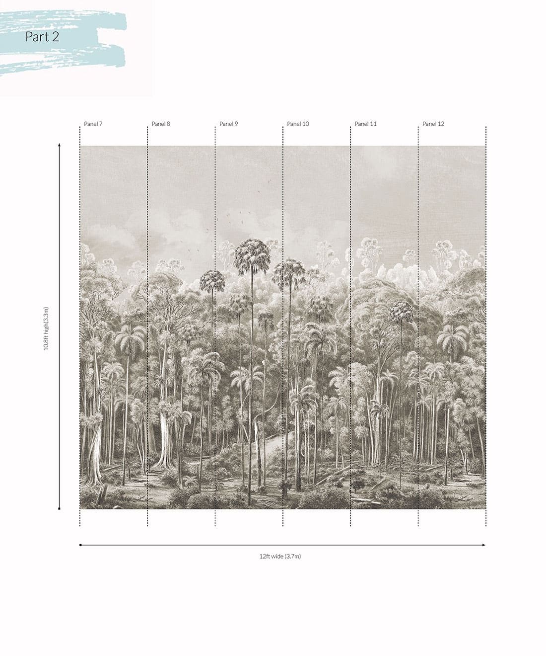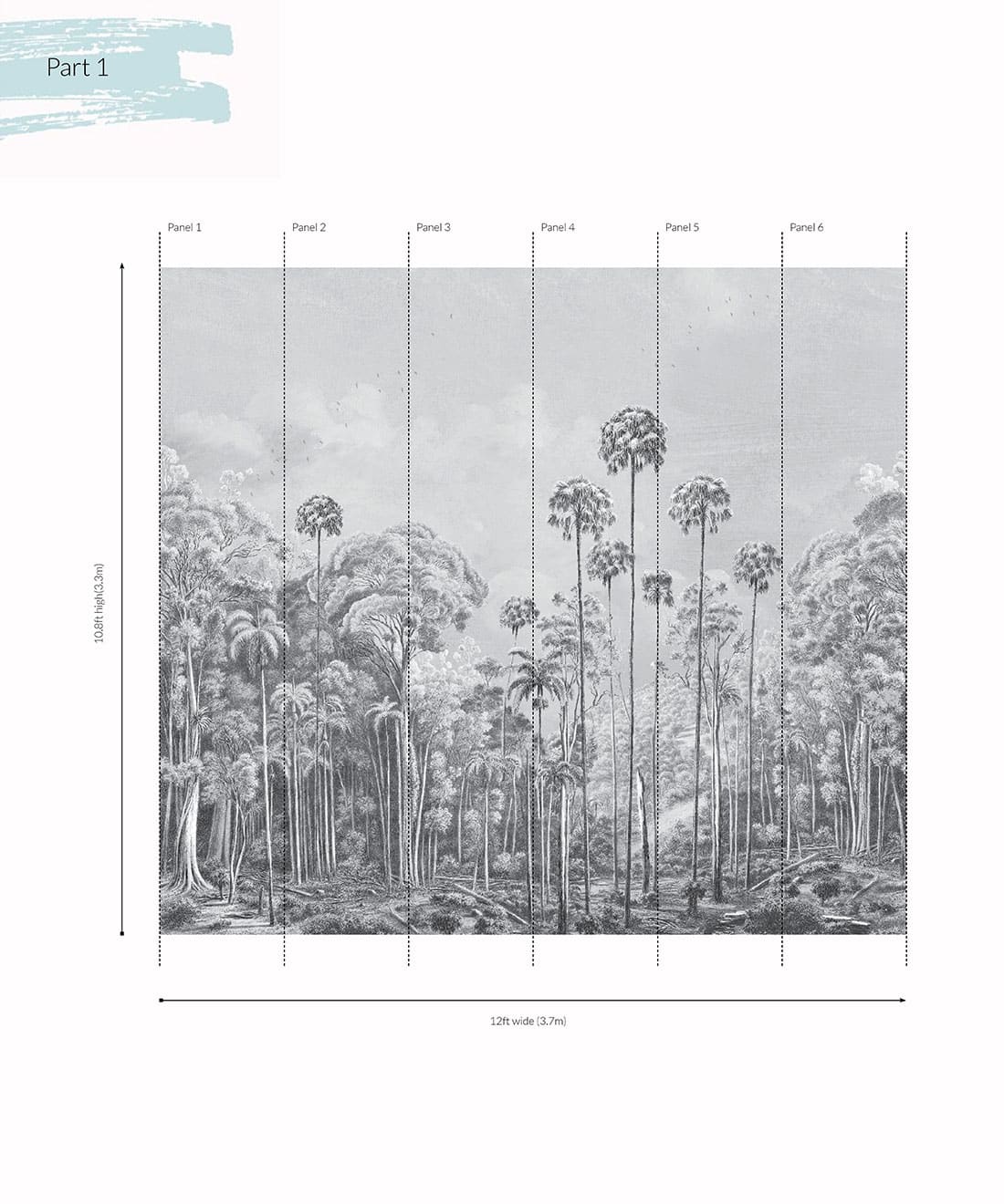 This mural comes as two parts. Either part can be used as a 6-panel repeating mural, or the two parts can be paired together to create a glorious 12 panel landscape. Each panel is 130′′ (330cm) high x 24′′ (61.5cm) wide.