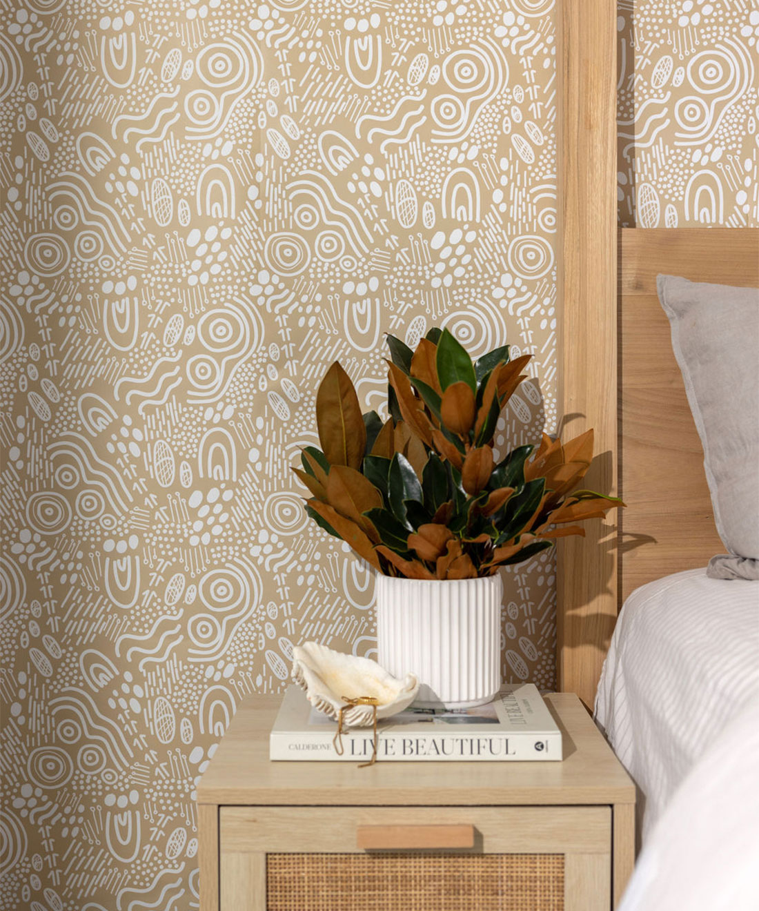 Emro is the brainchild of Emma Rolls. After working for years with community organizations, she officially launched her own collection in 2019. Her art features work by Aboriginal artists who create designs inspired by ancient traditions of indigenous culture. Known for homewares like rugs, cushions and picnic blankets, she now has launched a collection of wallpapers.