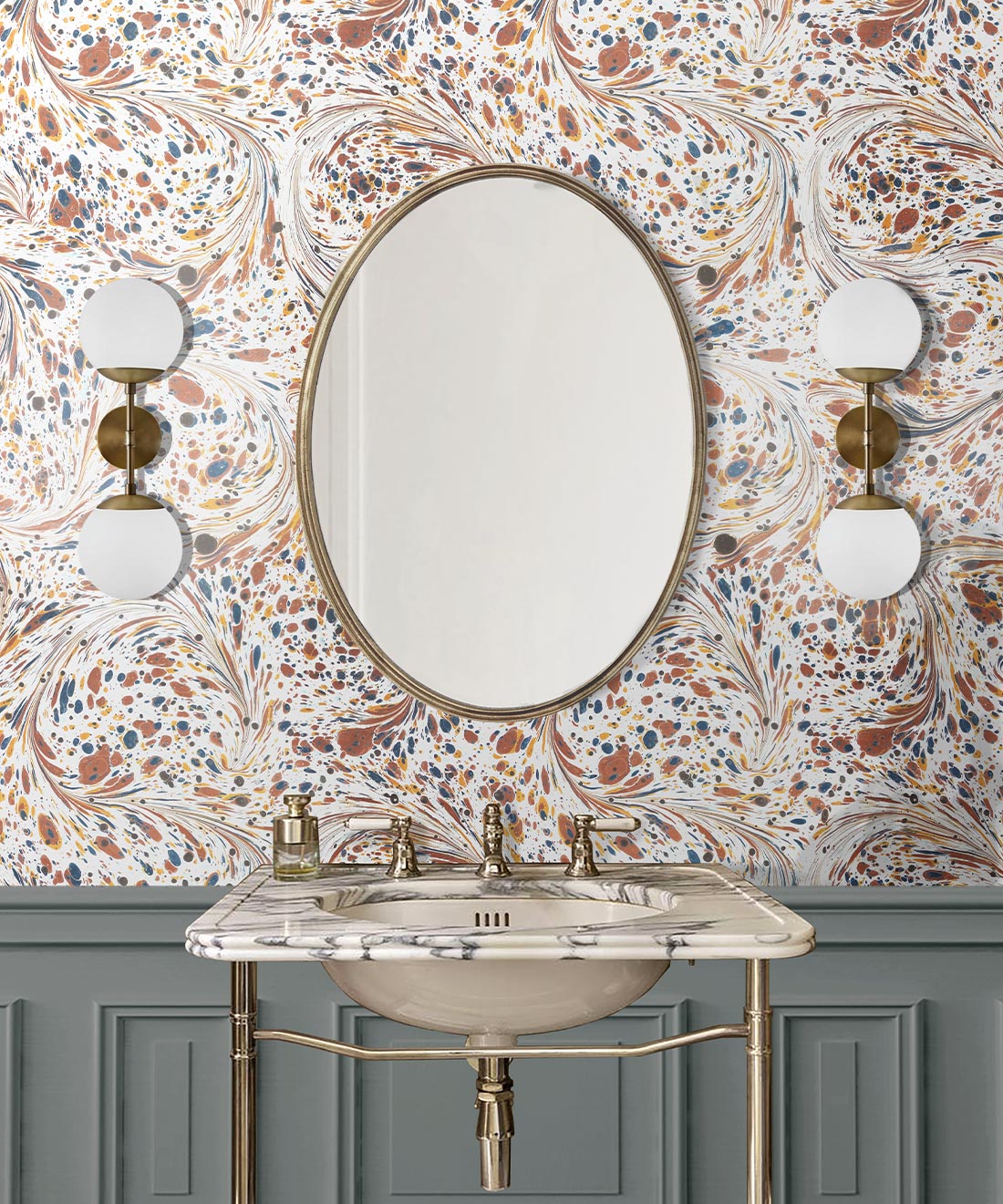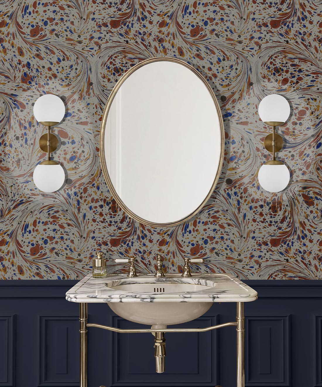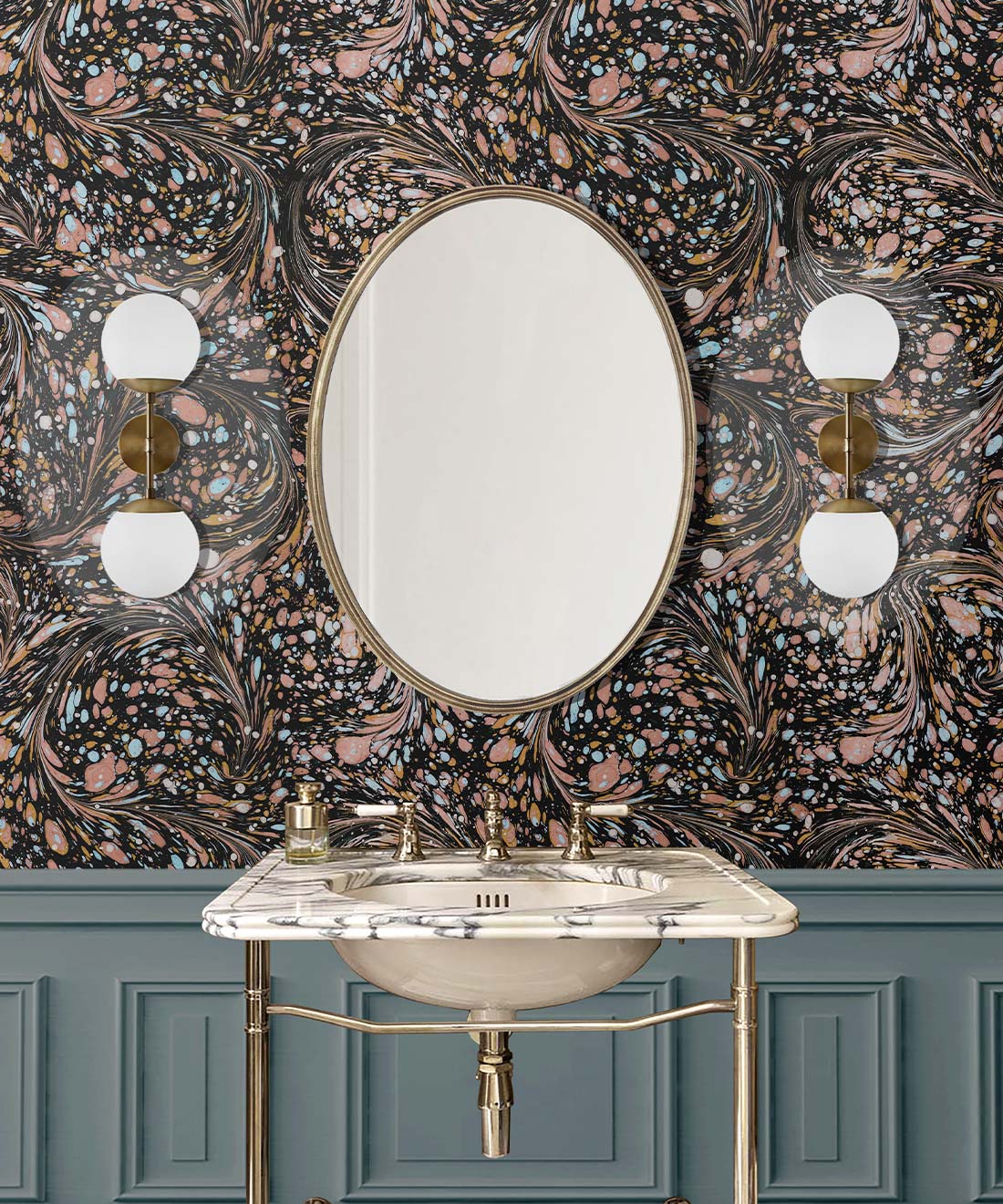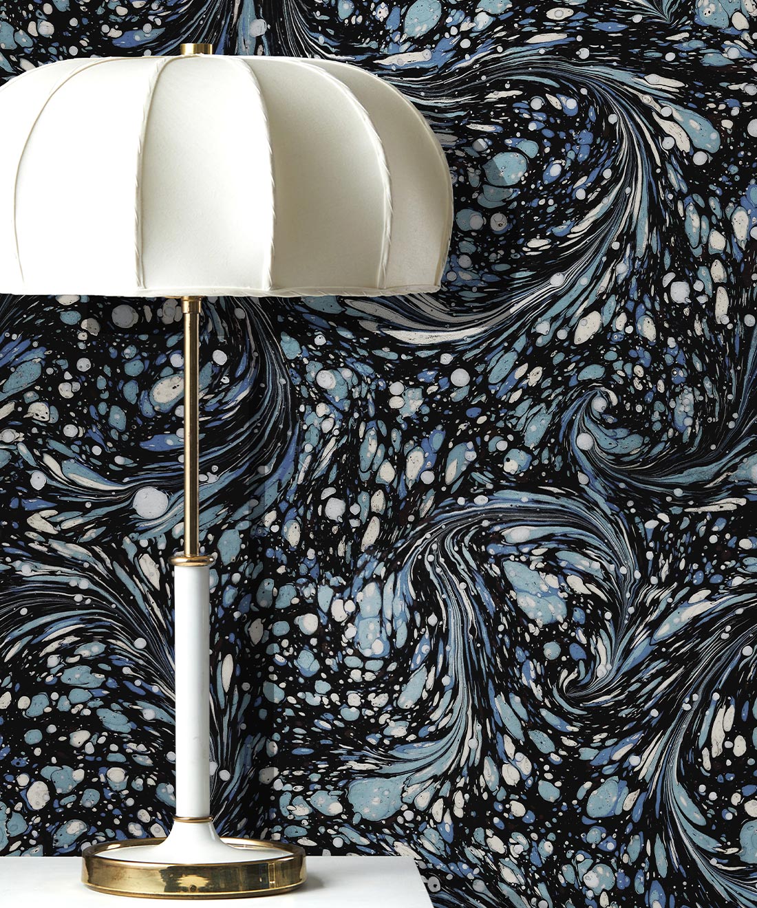 Designer Bethany Linz’s favourite pattern from her 2022 Marbling Collection, Marble Swirls wallpaper, is reminiscent of flowing water and wind blowing through the trees set into stone. Created in collaboration with Japanese marbling artist Izumi, the collection is inspired by nature and its patterns and has been recreated through the use of traditional marbling techniques. The natural motion of ink in water that has been captured in this design will add a sense of movement to a space and would be a perfect addition to a bathroom or powder room.