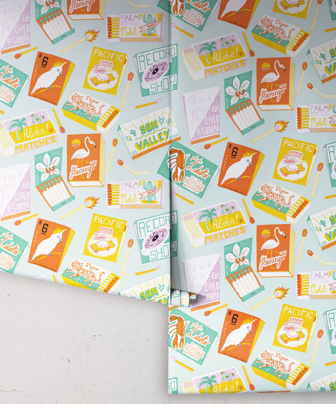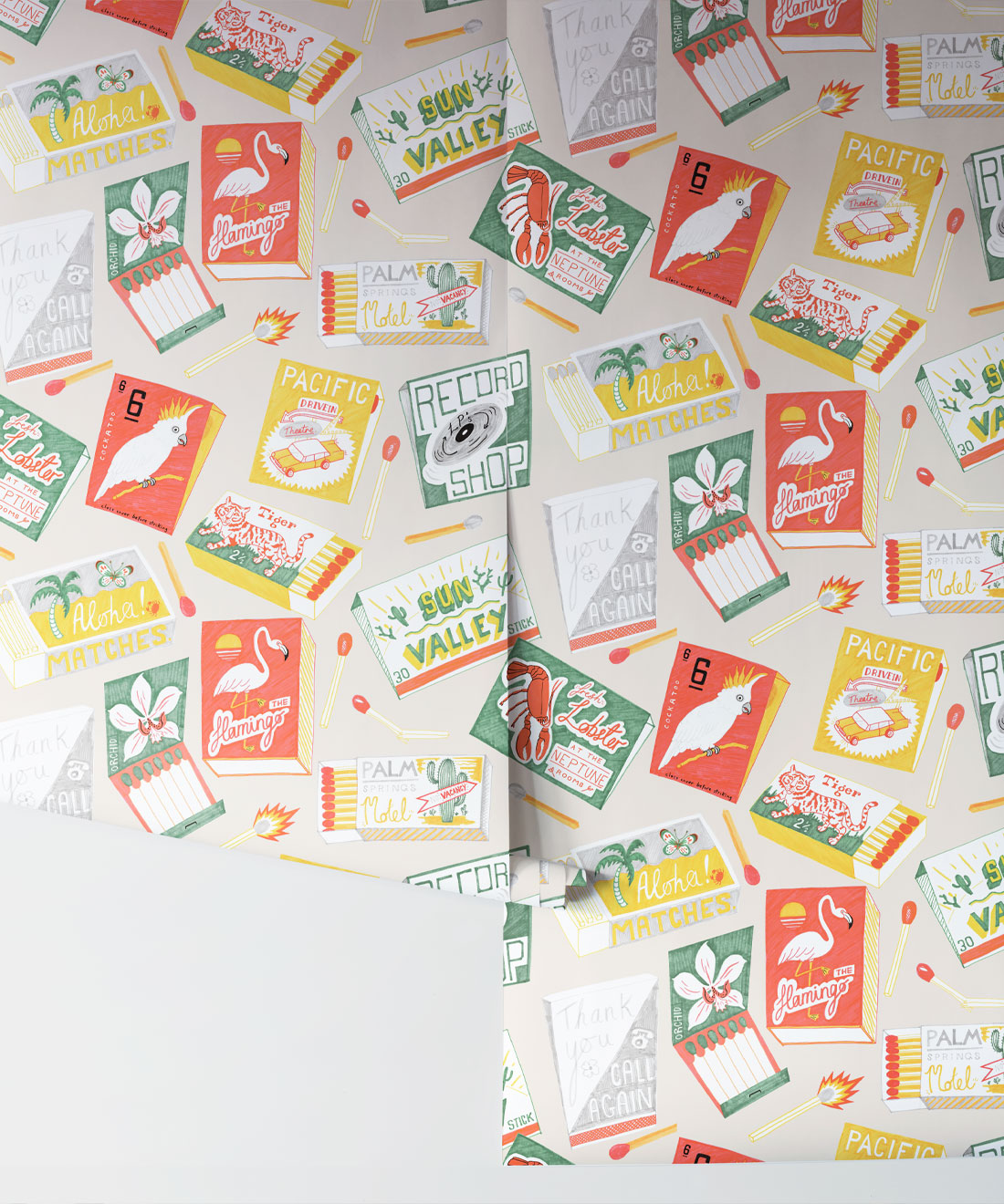 Match Books Wallpaper is a contemporary retro wallpaper design by Jacqueline Colley. It’s nostalgic wallpaper featuring vintage matchbooks that makes you think of a diner on the roadside of Route 66 or an old smoke-filled casino on Fremont Street in Las Vegas. It’s a modern take on the Americana trend that will add color and joy to any room, perfect in commercial spaces like a cocktail bar or burger joint.
