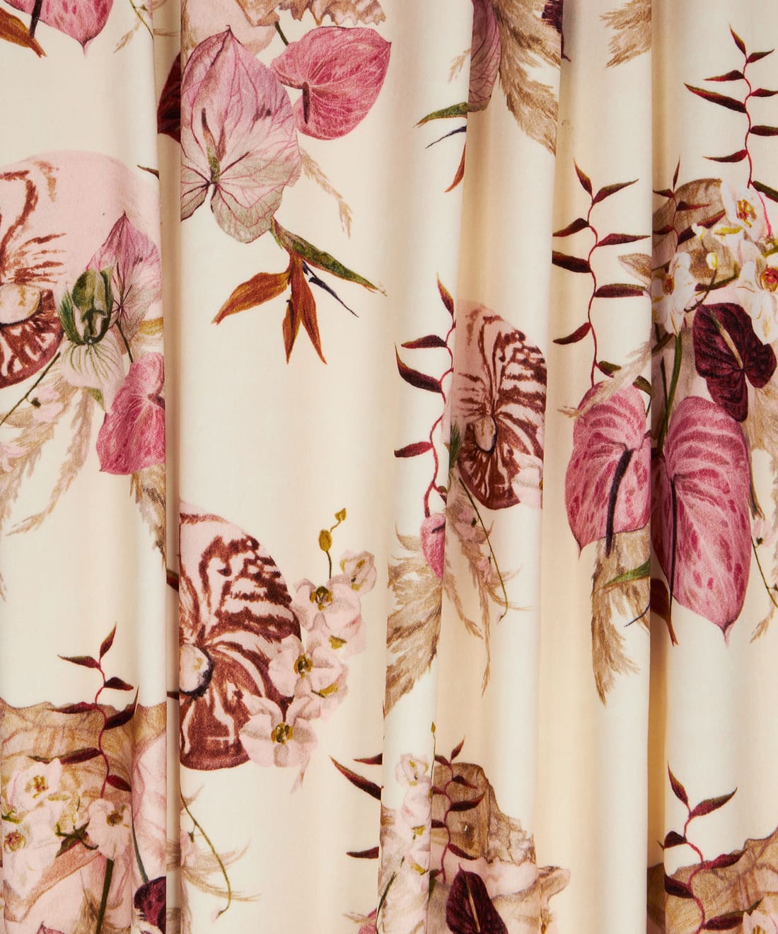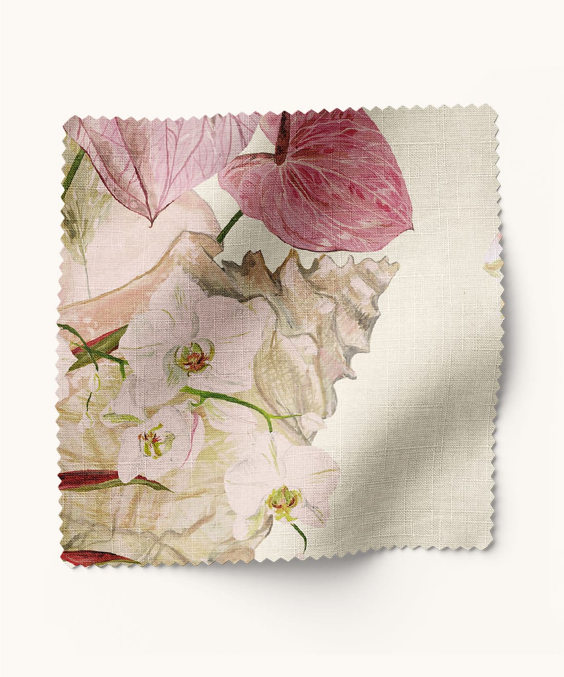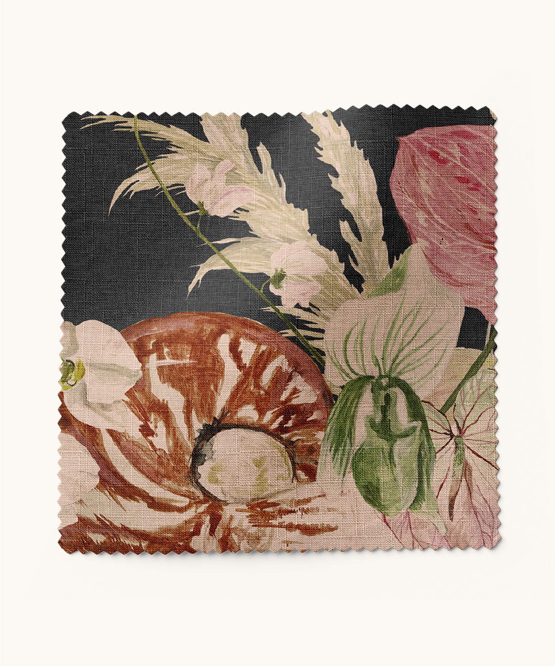 Mazzo is vintage glamour in full bloom. Exotic florals nestled in delicate shells nod to 70s and 80s Italian design with soft nostalgic colour and hand-painted detail. Designed for maximalist cushions romantic curtains and interiors that embrace layered beauty.