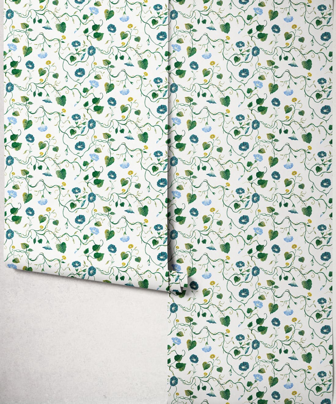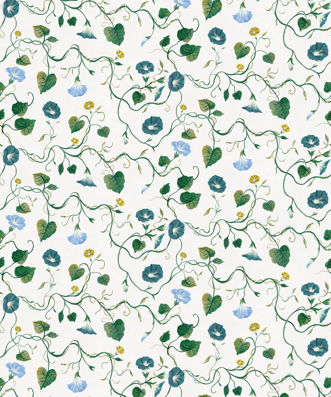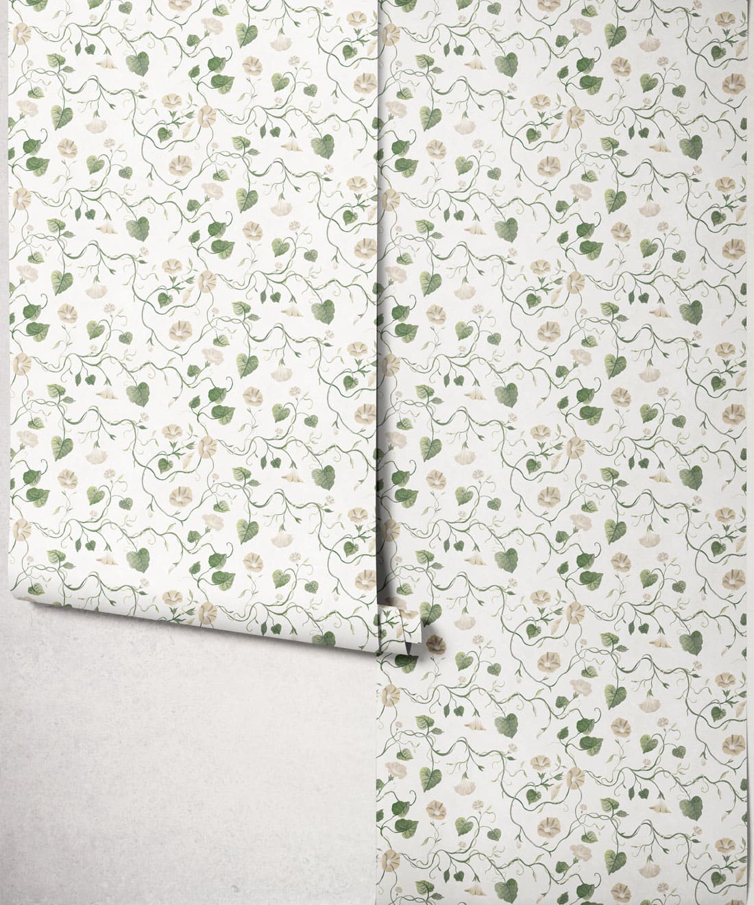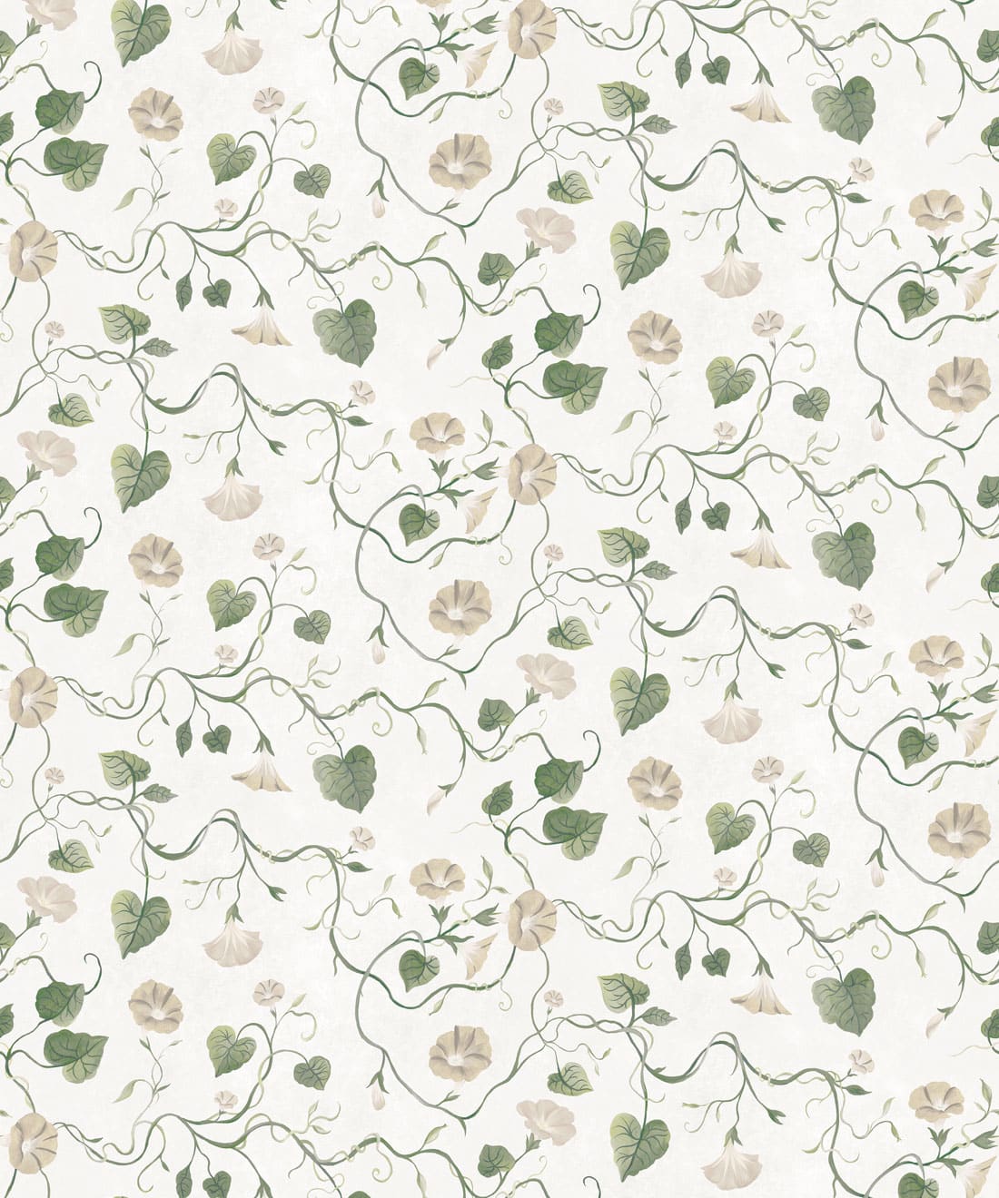 Moonflower is a botanical wallpaper inspired by the moonflower from the morning glory family. Trailing blooms and curling vines wind across the design, forming a gentle pattern of softly flowing lines.