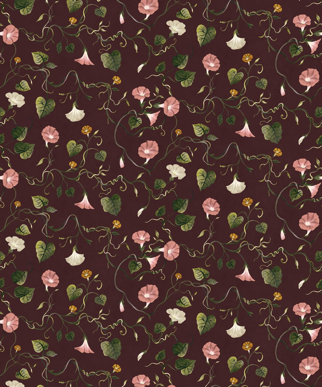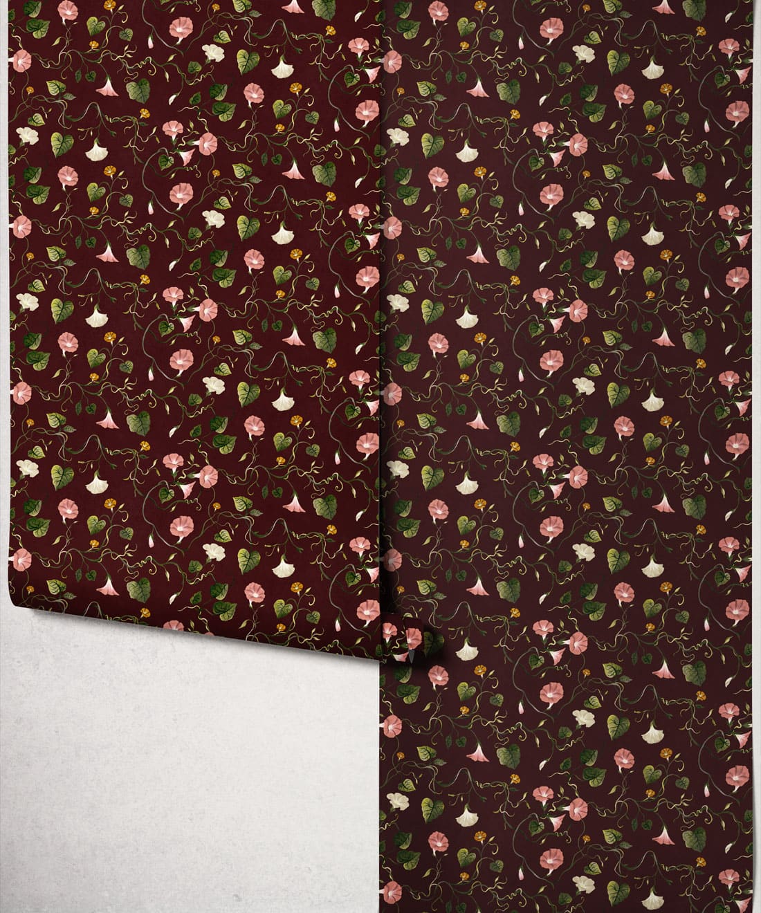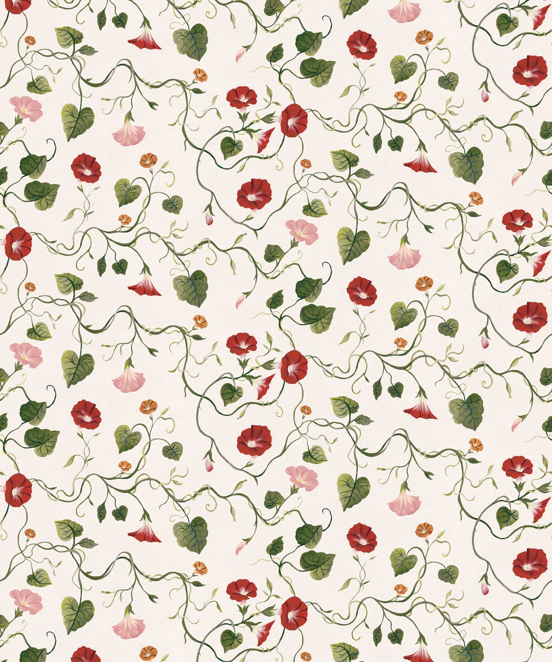 Moonflower is a botanical wallpaper inspired by the moonflower from the morning glory family. Trailing blooms and curling vines wind across the design, forming a gentle pattern of softly flowing lines.