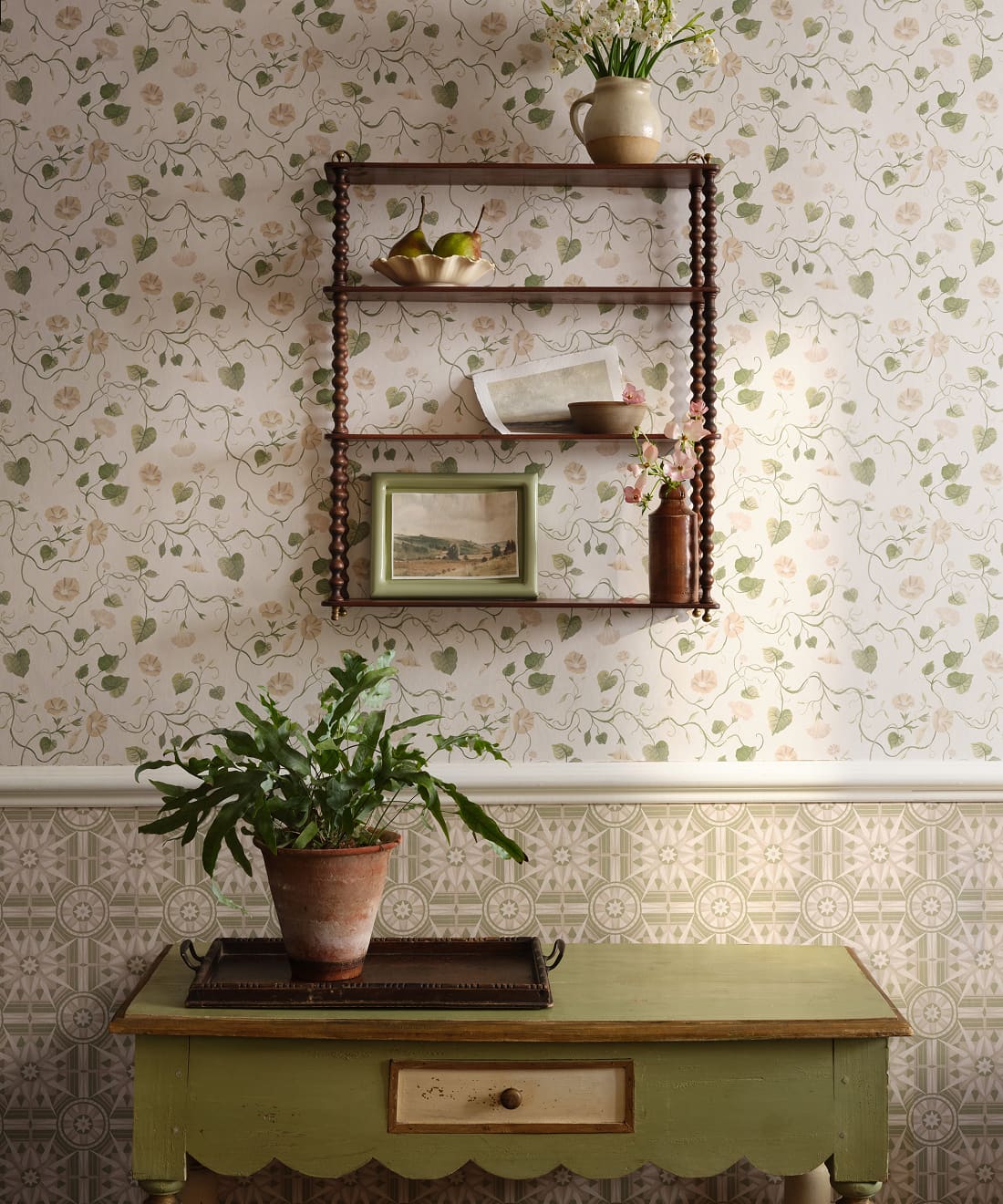 Intricately hand painted, the design draws on the character of vintage botanical illustrations. Its smaller scale allows the wallpaper to work beautifully across entire rooms or layered with larger patterns.