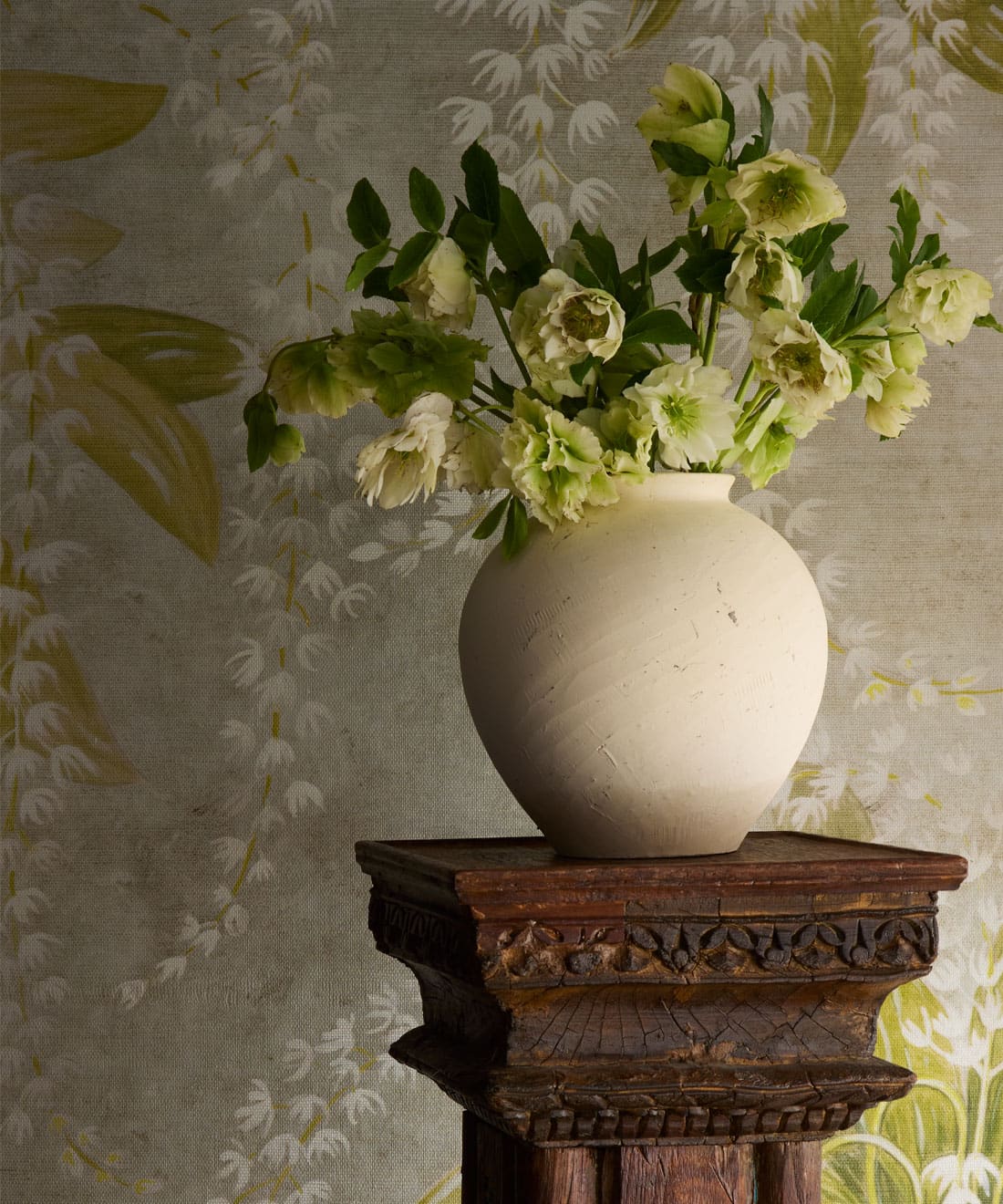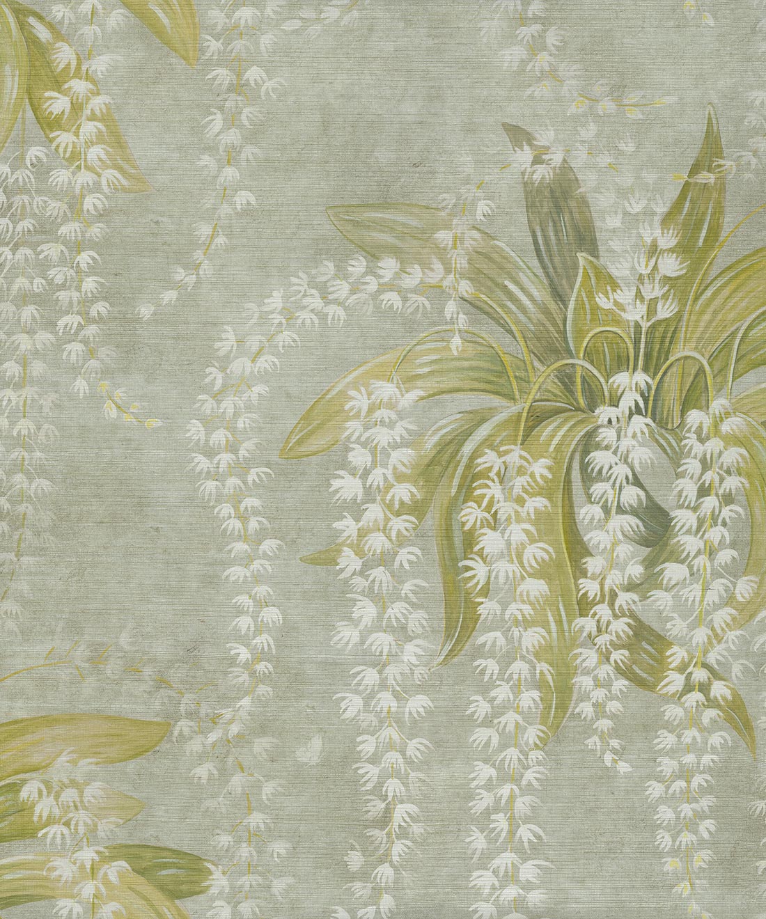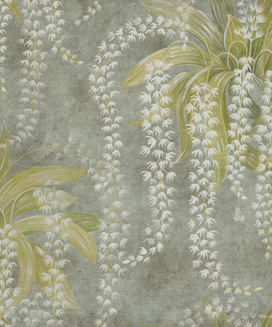 Butterflies fly gracefully between beautiful cascading flowers in the stunning Orchid Grasscloth Wallpaper. Originally hand-painted over a textured background, this design is reminiscent of an ancient garden and will transform any interior into a charming sanctuary.