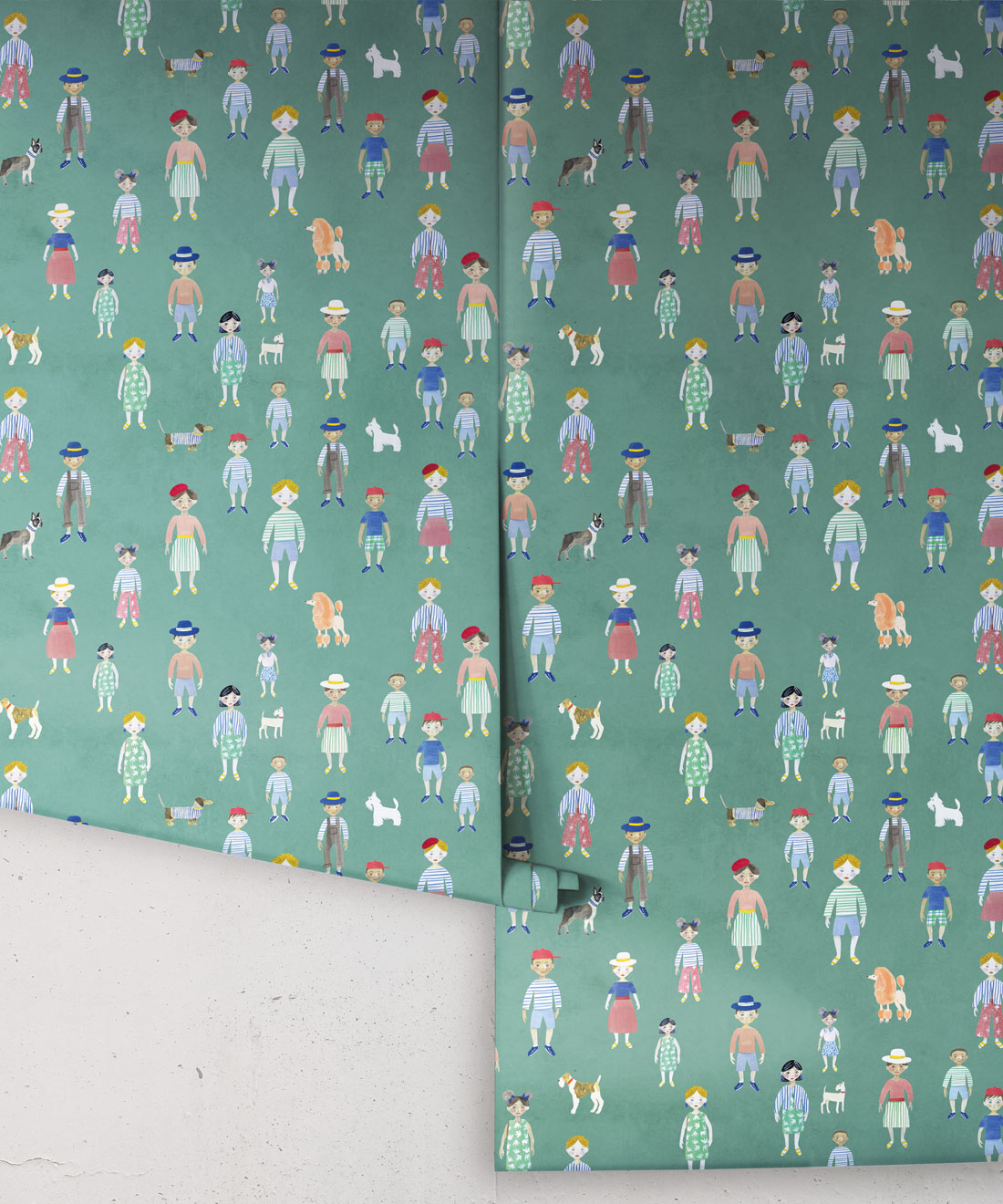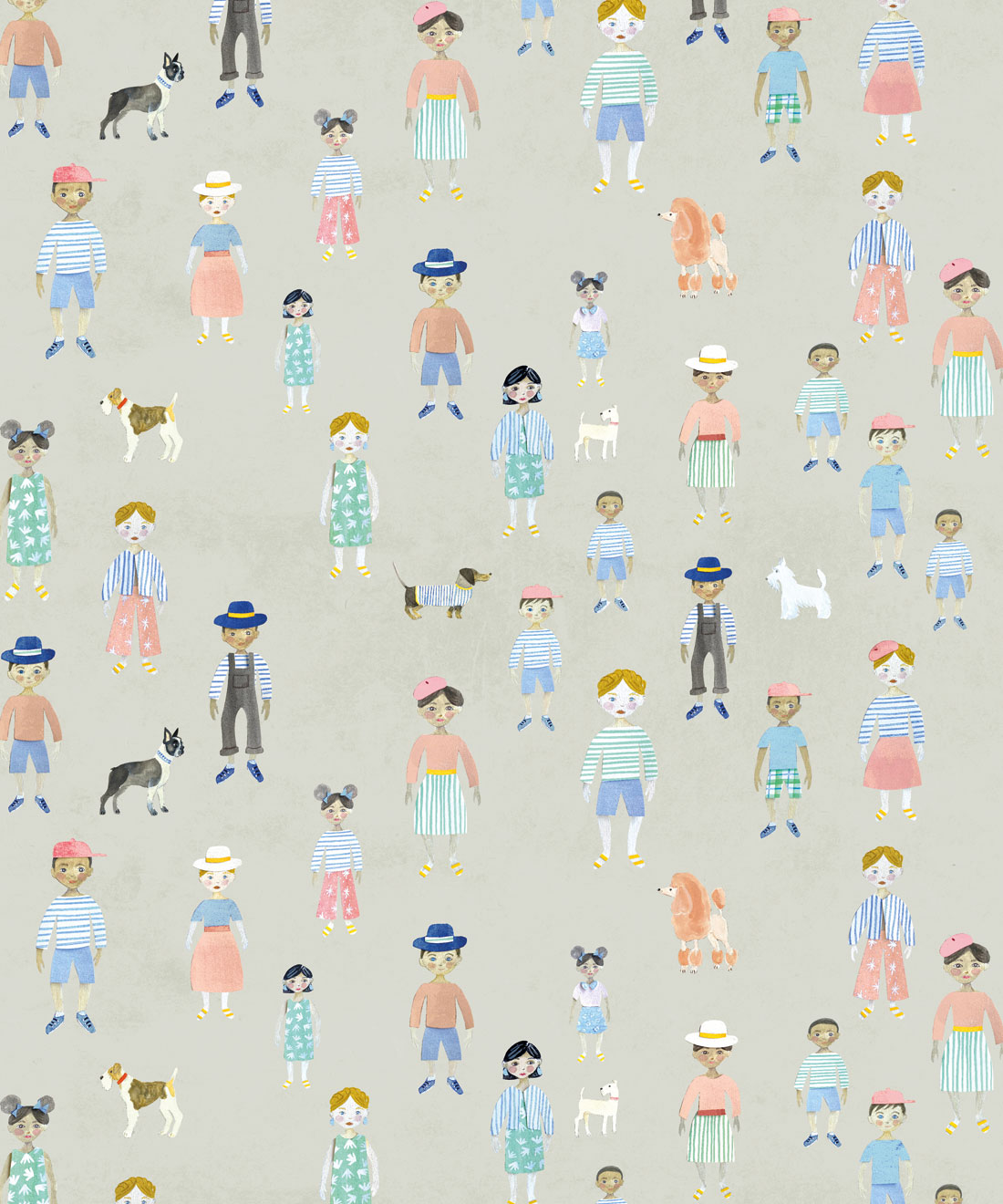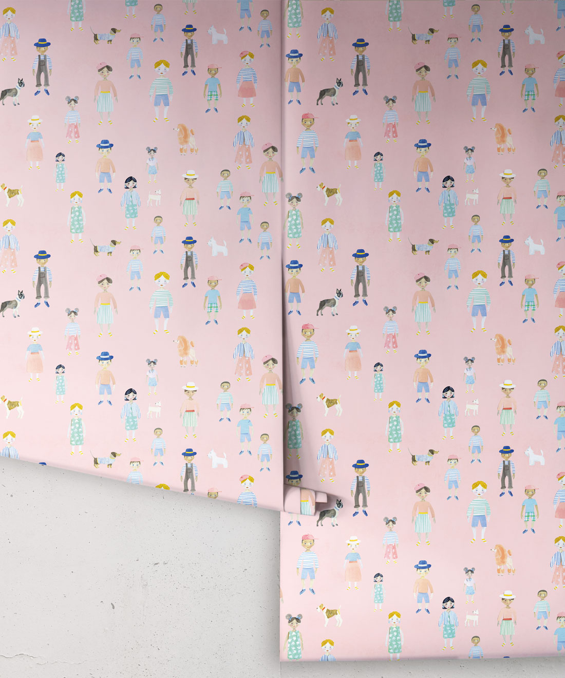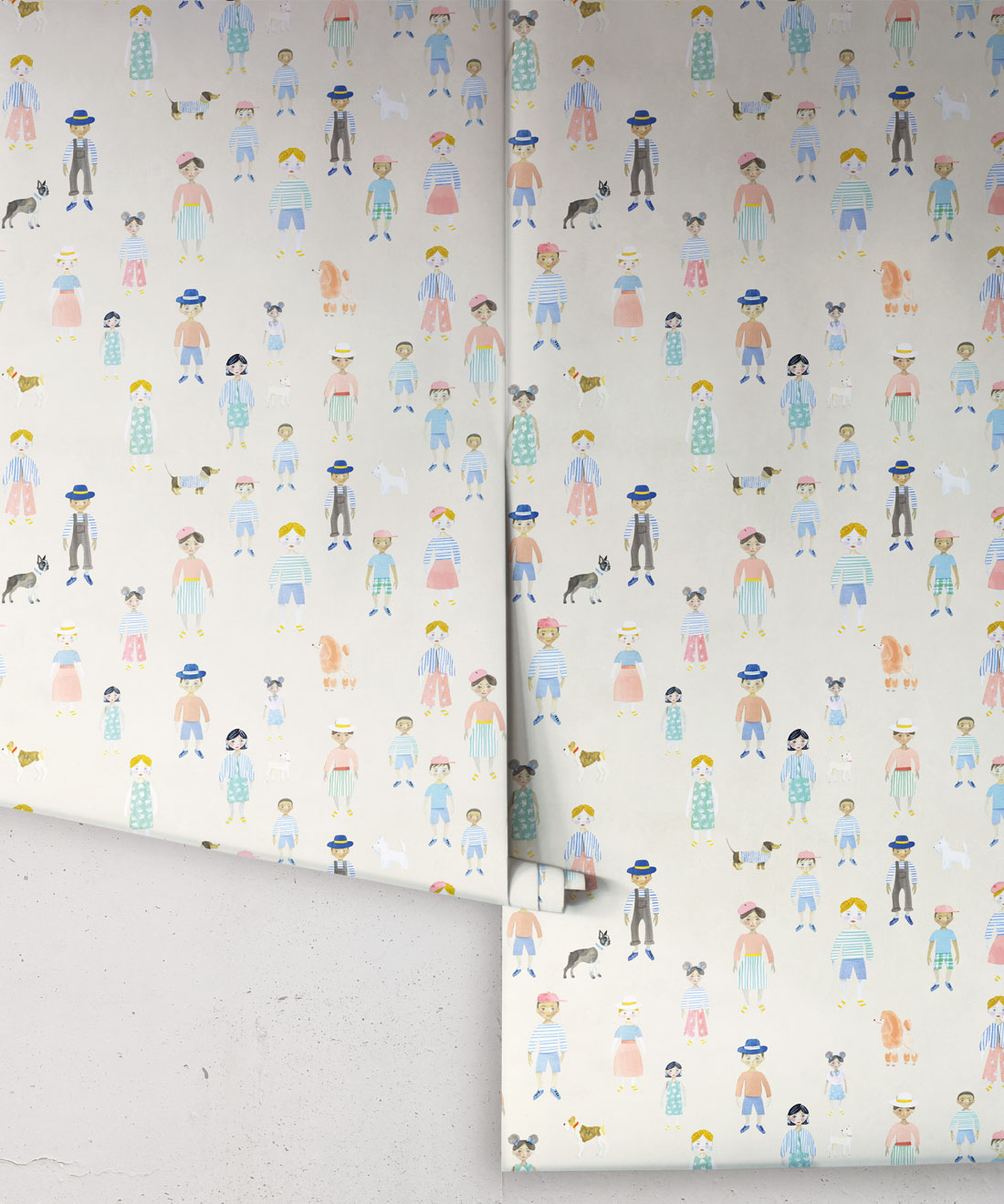 Paper Dolls Wallpaper features all sorts of people dressed up in different outfits. What started as a fun little project between the artist, Bethany Linz, and her three year old son, ended up being a fun wallpaper design showing people styled in different hats, dresses, pants, tops and shoes. This would be a perfect design for a kids room for both boys and girls alike.