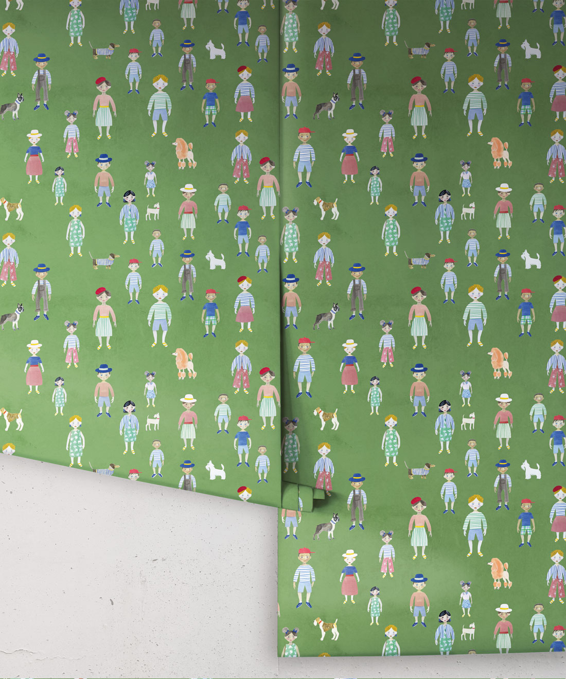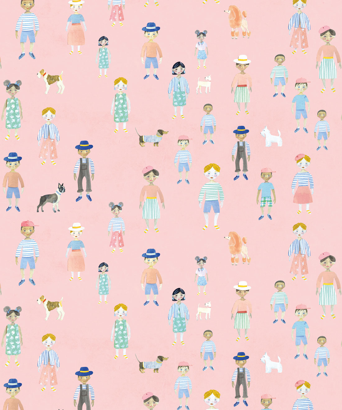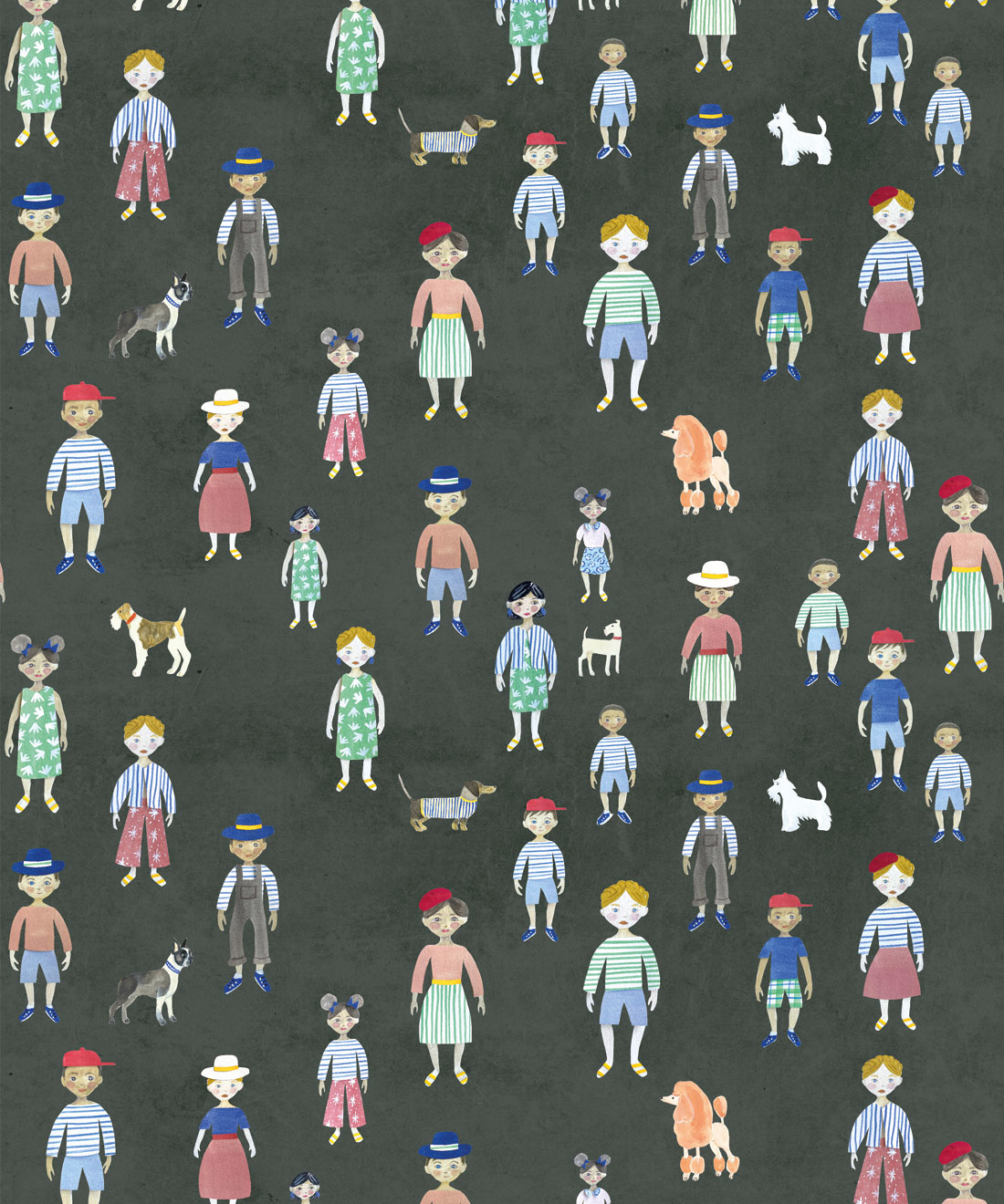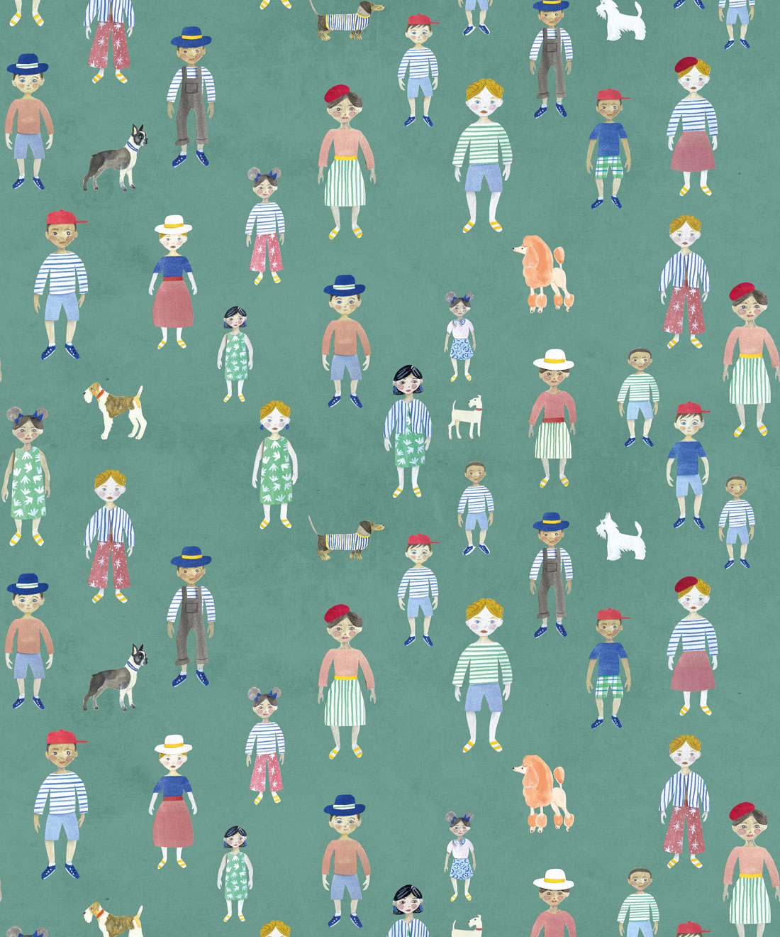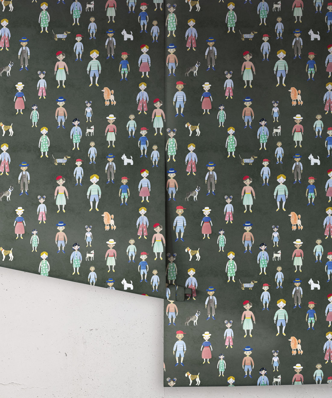 Paper Dolls Wallpaper features all sorts of people dressed up in different outfits. What started as a fun little project between the artist, Bethany Linz, and her three year old son, ended up being a fun wallpaper design showing people styled in different hats, dresses, pants, tops and shoes. This would be a perfect design for a kids room for both boys and girls alike.