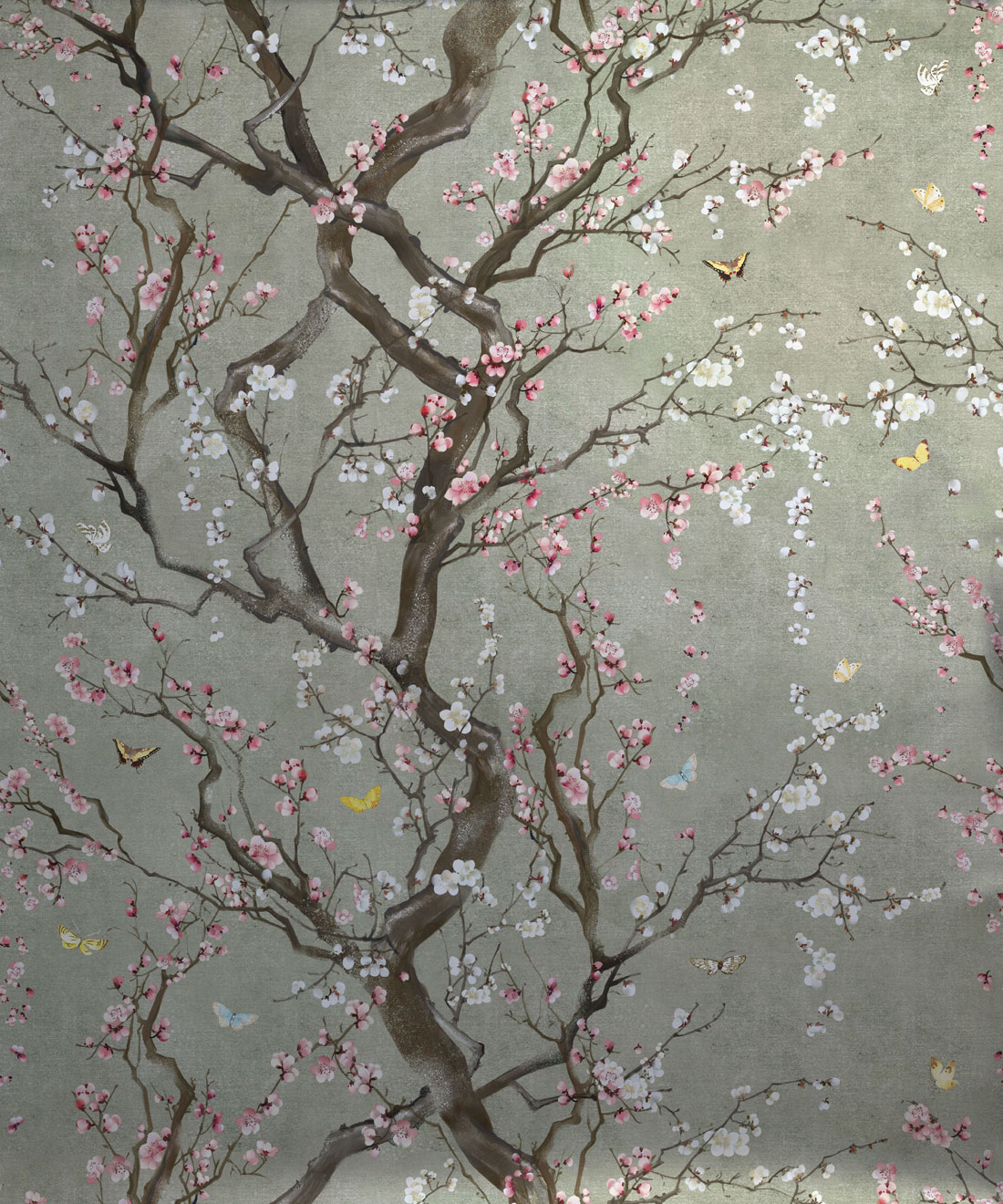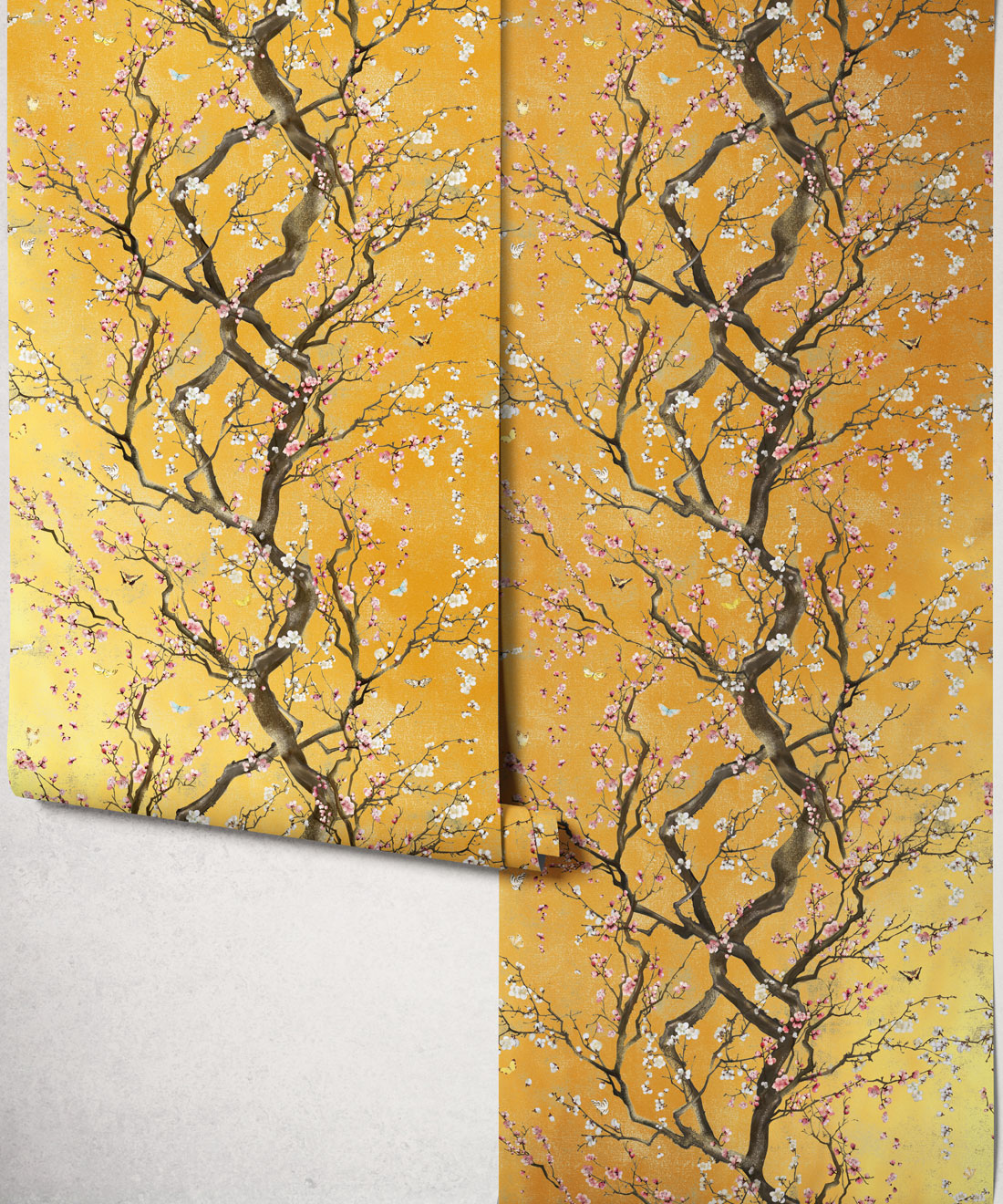 Gorgeous Japanese floral wallpaper. At the heart of the Ukiyo-e movement is the desire to capture and reflect upon the beauty of the natural Japanese landscape. In Japan, plum blossoms are admired and cherished for their natural beauty and symbolic significance, blooming in February to signal the beginning of spring. Offered in gold and silver metallic finishes, this design captures the plum blossom in its fullest, most lively form and transports interiors into a private plum blossom oasis.